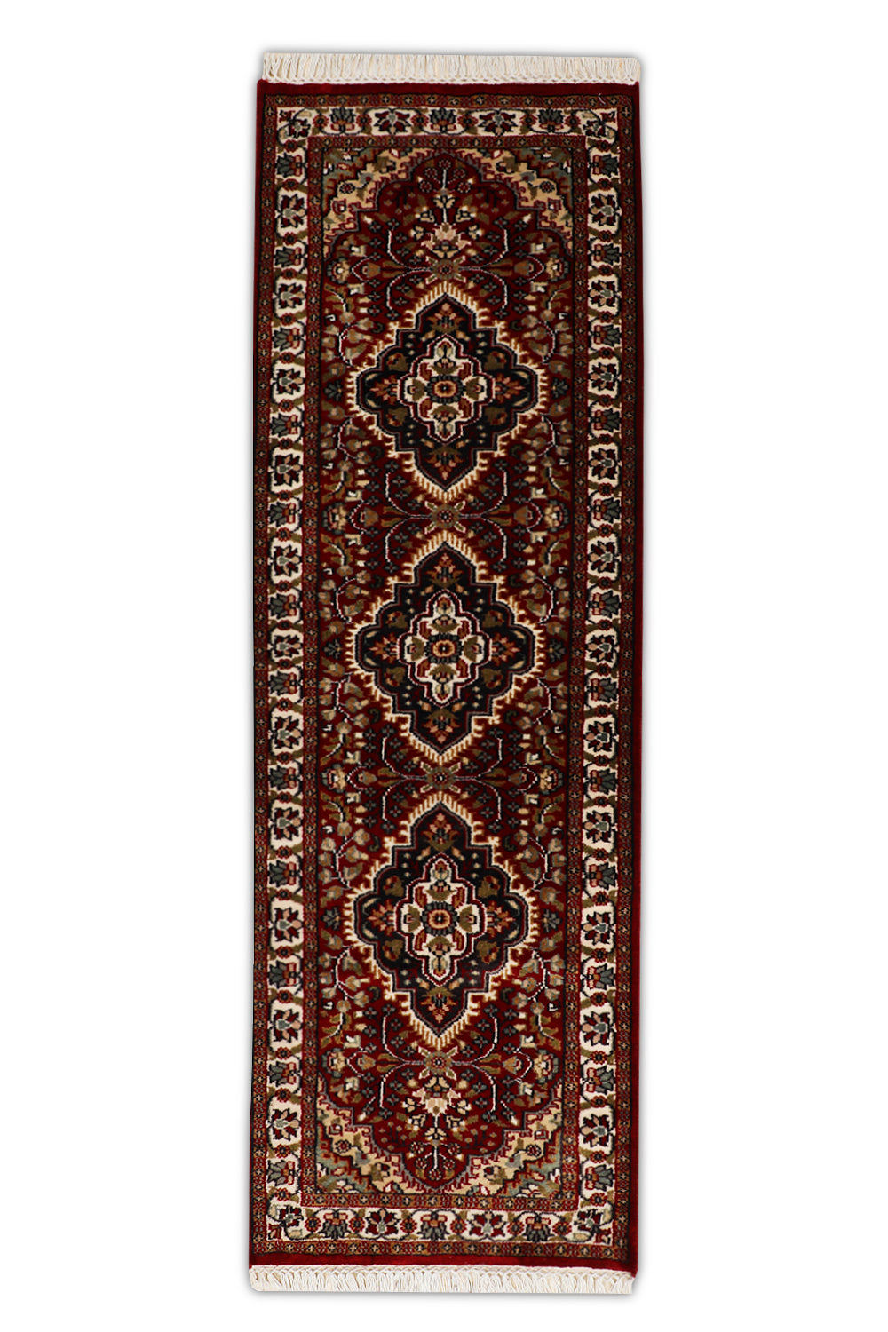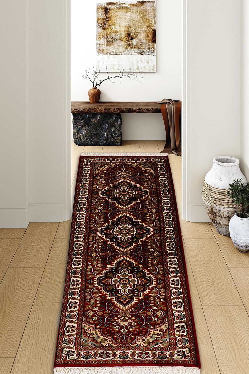 Grace your hallway with the Rishara rug, a captivating piece from our Virasat Collection that fuses traditional charm with modern versatility. This 2 x 6 ft wool runner, handknotted with a medium pile and mild soft texture, features intricate oriental patterns in warm crimson blush, soft cream dawn, and hints of deep taupe. Its design echoes Persian traditions, where medallion and floral motifs symbolized life and protection since ancient times, often woven into rugs to reflect cultural prestige. These patterns, embodying narratives of renewal and strength, spread through trade routes, influencing oriental styles with their timeless beauty. The elongated shape makes it ideal for hallways seeking a touch of elegance.