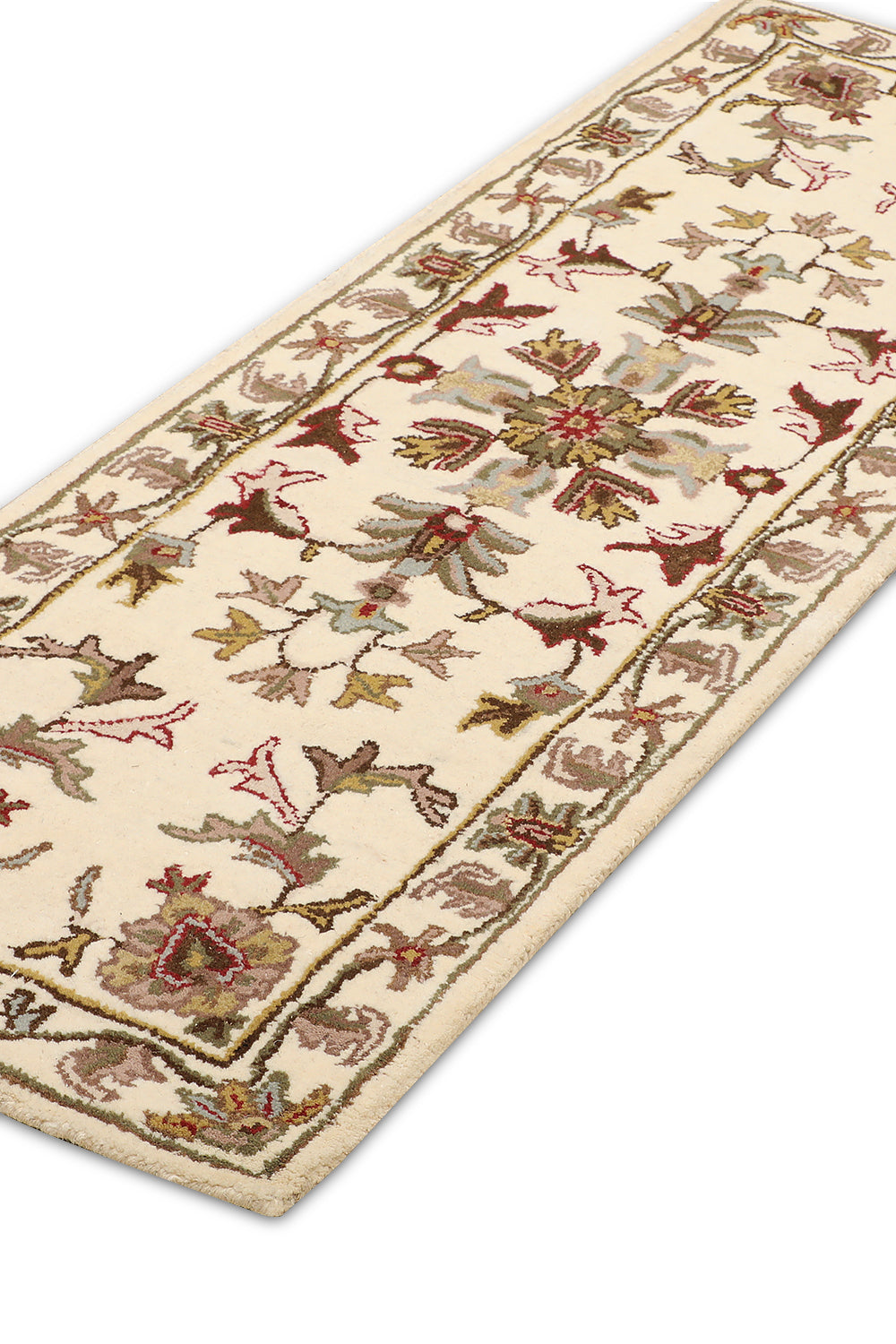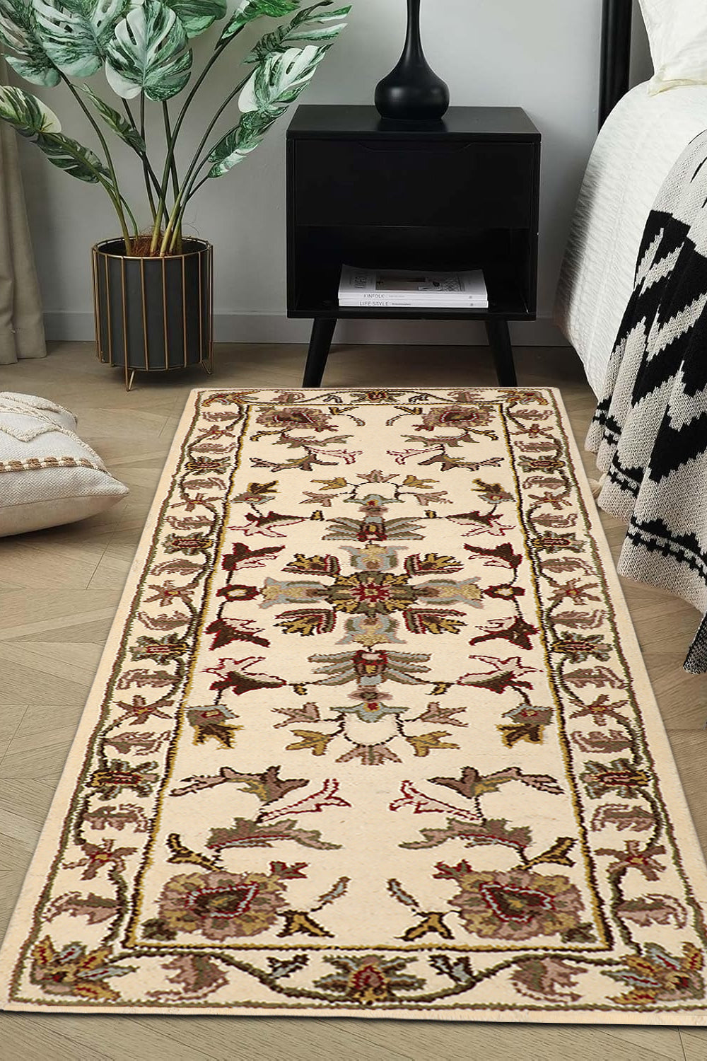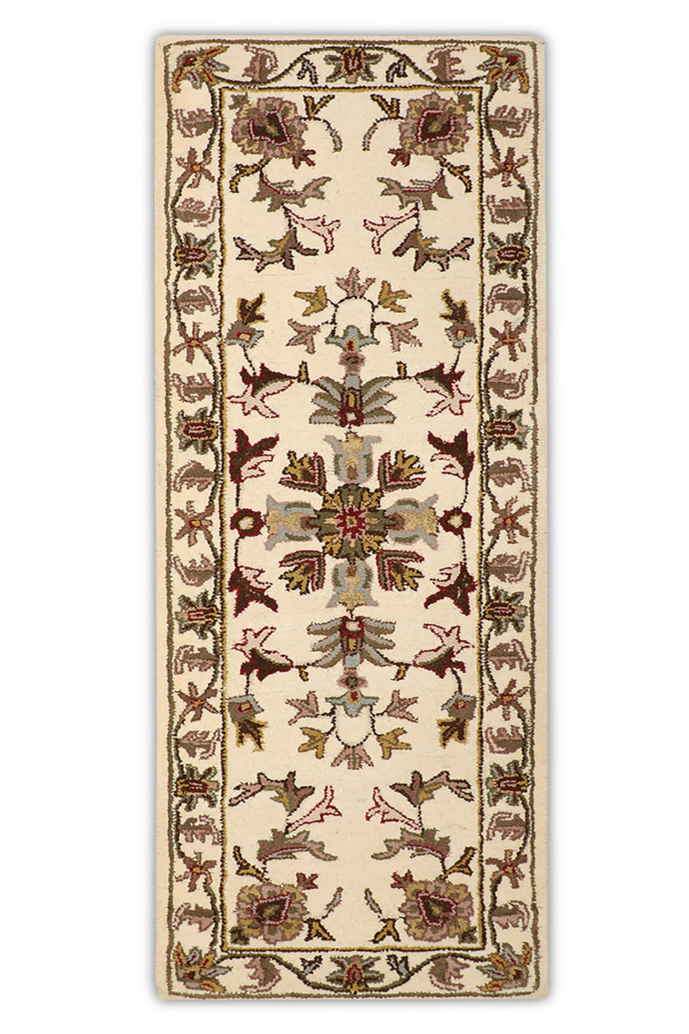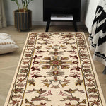 Introduce timeless elegance to your hallway with the Roshan rug, a beautifully crafted runner from our Chahat Collection that celebrates Oriental artistry. This 2 x 6 ft hand-tufted wool rug, featuring a high pile with a mild soft texture, showcases a continuous floral vine motif with small medallion accents in creamy pearl glow, earthy mushroom taupe, and hints of soft oatmeal. Its design draws from Persian and Central Asian traditions, where floral vines and medallions symbolized growth and protection since the 16th century, often woven into runners for ceremonial pathways and domestic spaces. These patterns, reflecting cultural narratives of harmony, influenced textile arts across trade routes, blending heritage with enduring beauty. The plush feel underfoot makes it perfect for hallways seeking a classic touch.
