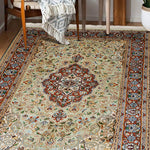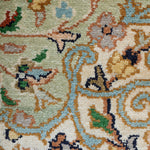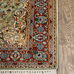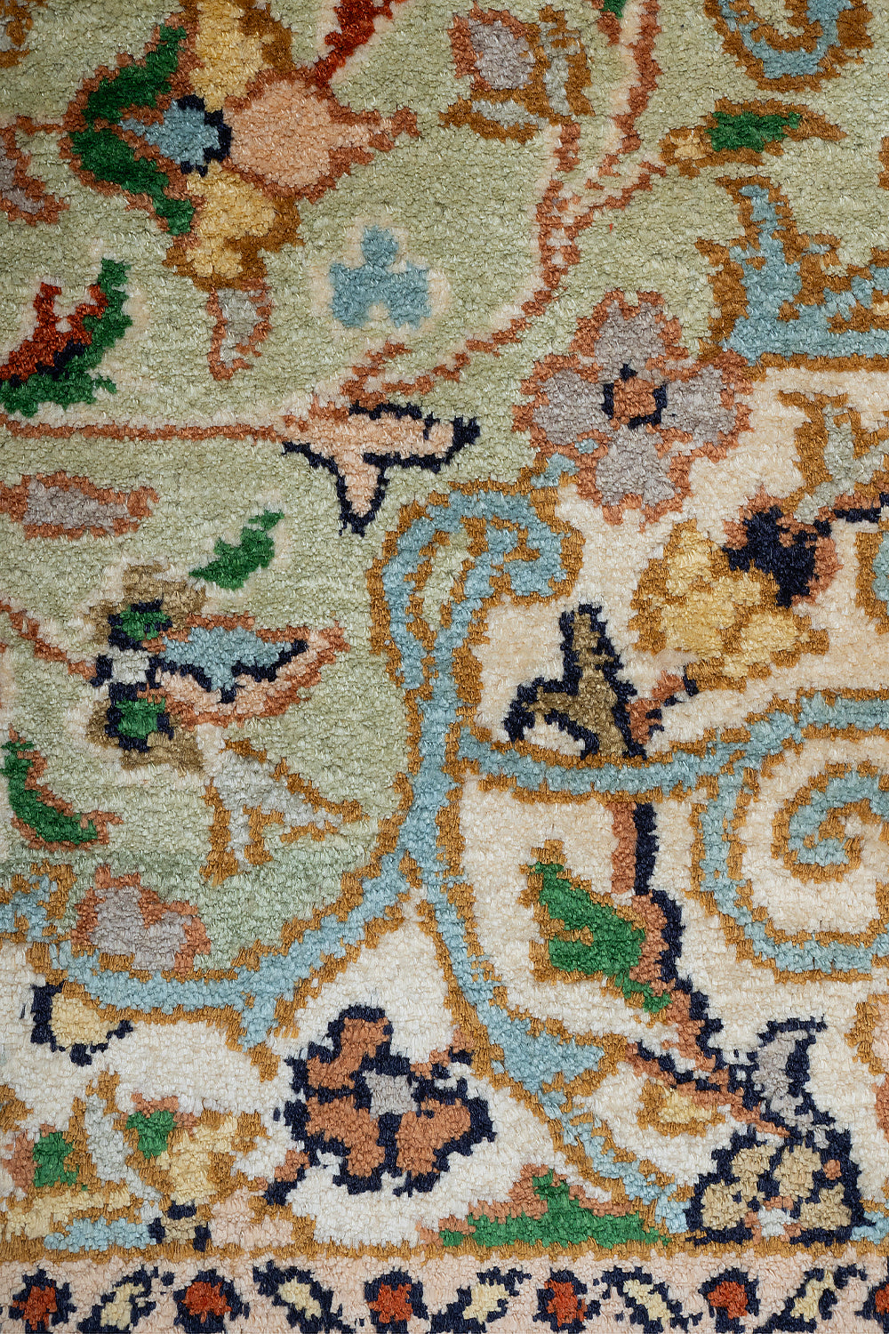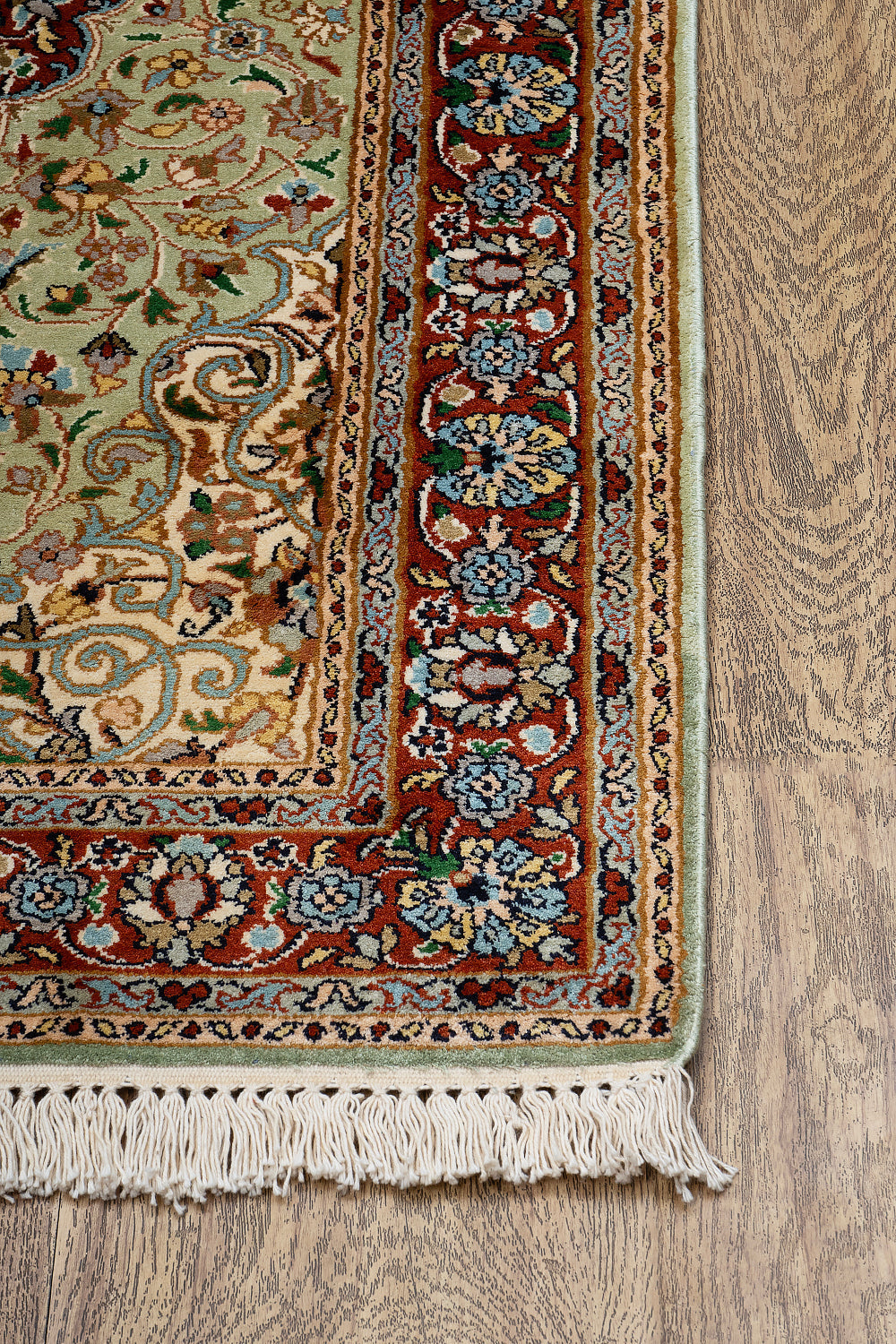 This Kashan Design carpet is rooted in history capturing the beauty of Indian traditional carpets and the legacy of fine craftsmanship. Delicate floral motifs unfurl across a serene light green canvas, framed by intricate rust-toned borders that evoke the elegance of royal courts and stately homes.