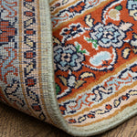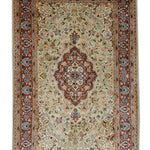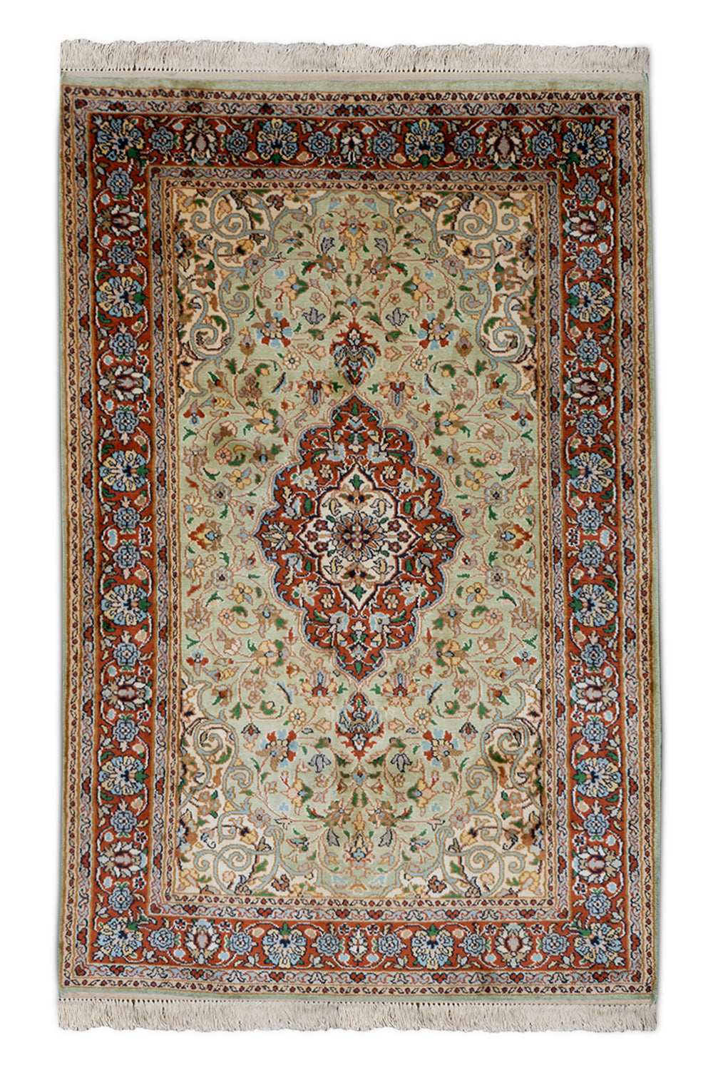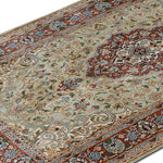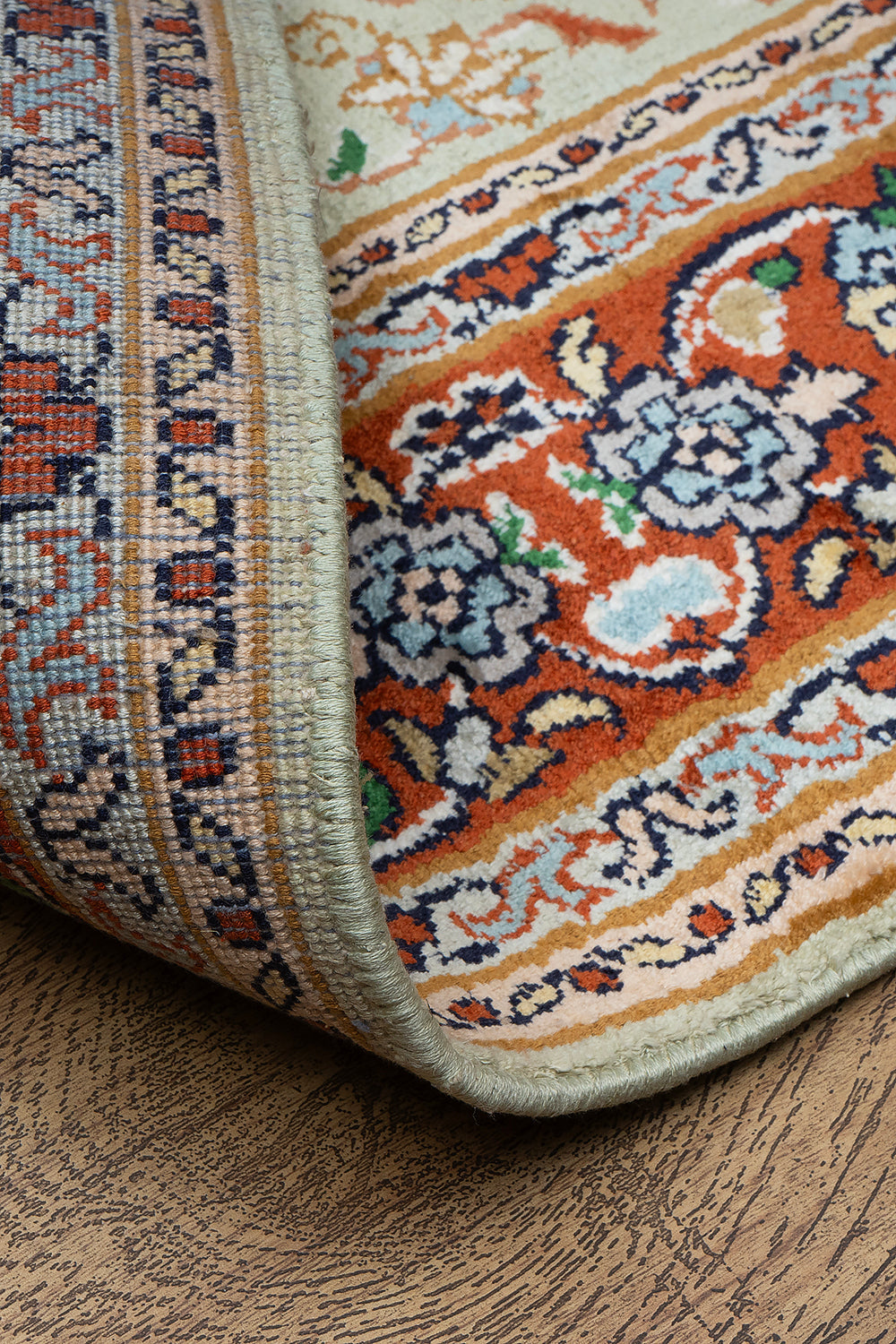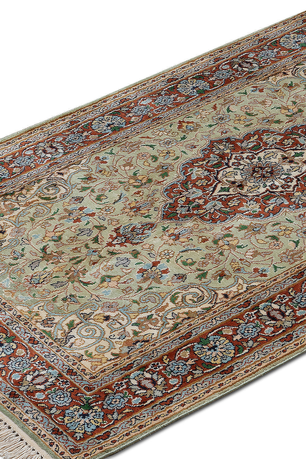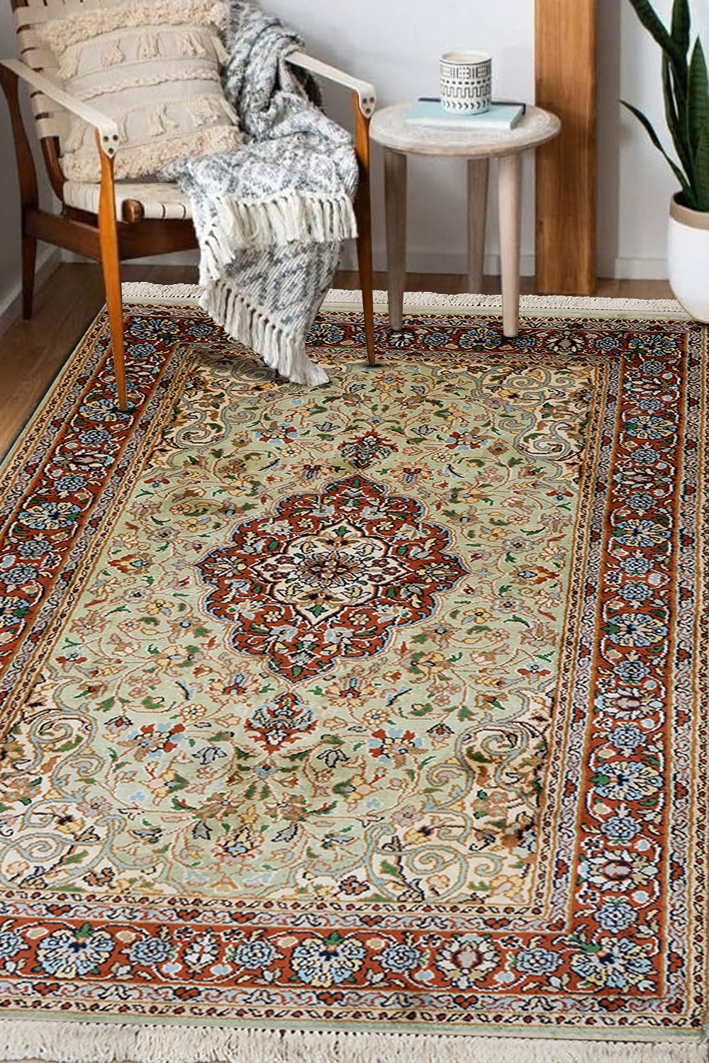 Hand-knotted in silk, this 2.6x4 ft masterpiece offers an unmatched softness that feels as luxurious as it looks. Its fine detailing and luminous finish make it ideal for living rooms, bedrooms, or even as wall décor. A celebration of legacy carpet designers in India, this Kashan Design rug carries forward the artistry of bygone eras while complementing contemporary interiors with grace. Every knot, every detail speaks of patience and precision, making this rug a symbol of enduring craftsmanship. In its harmonious palette of light green and rust, it breathes life into spaces, offering a glimpse into the rich history of royal rugs that have graced homes for centuries.