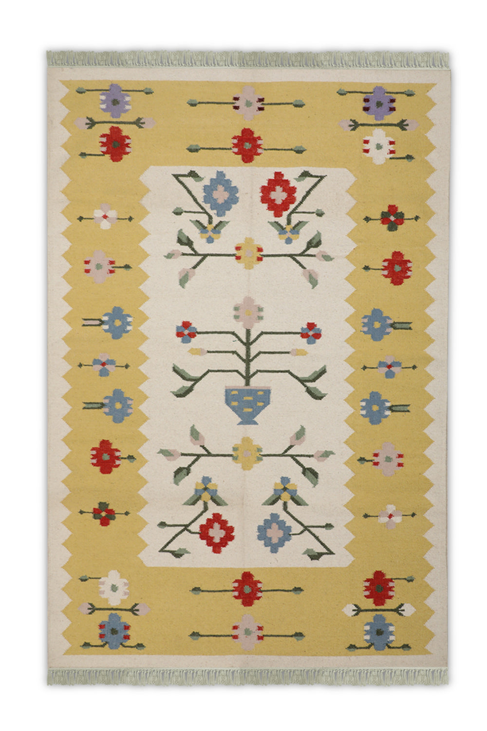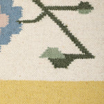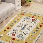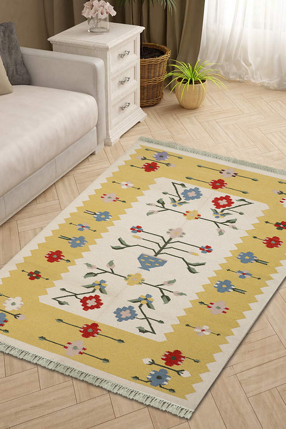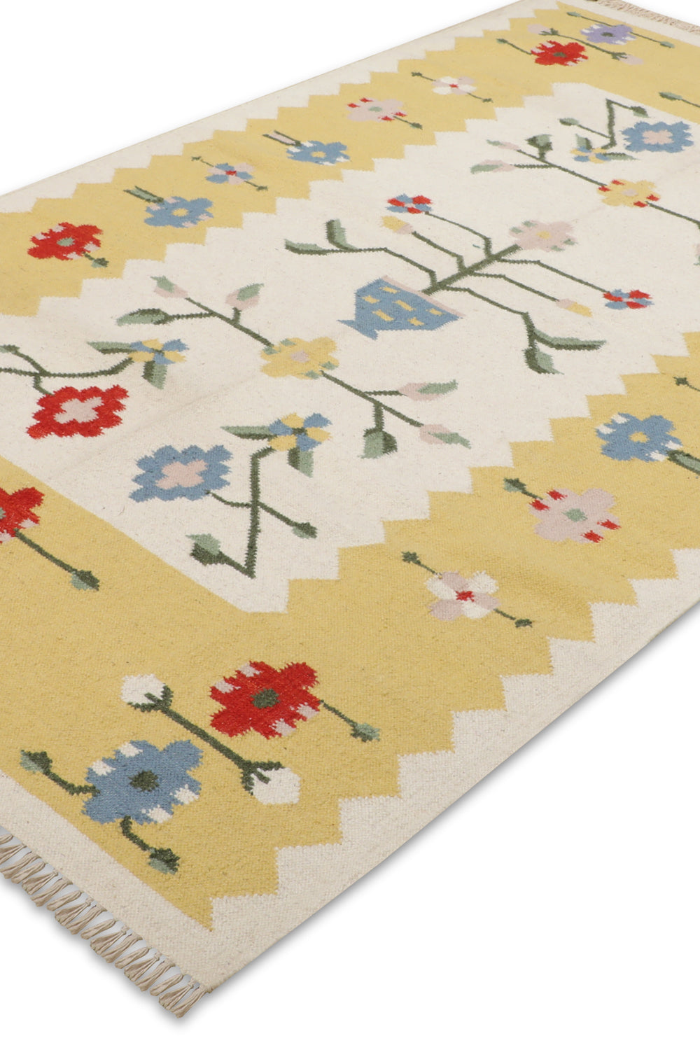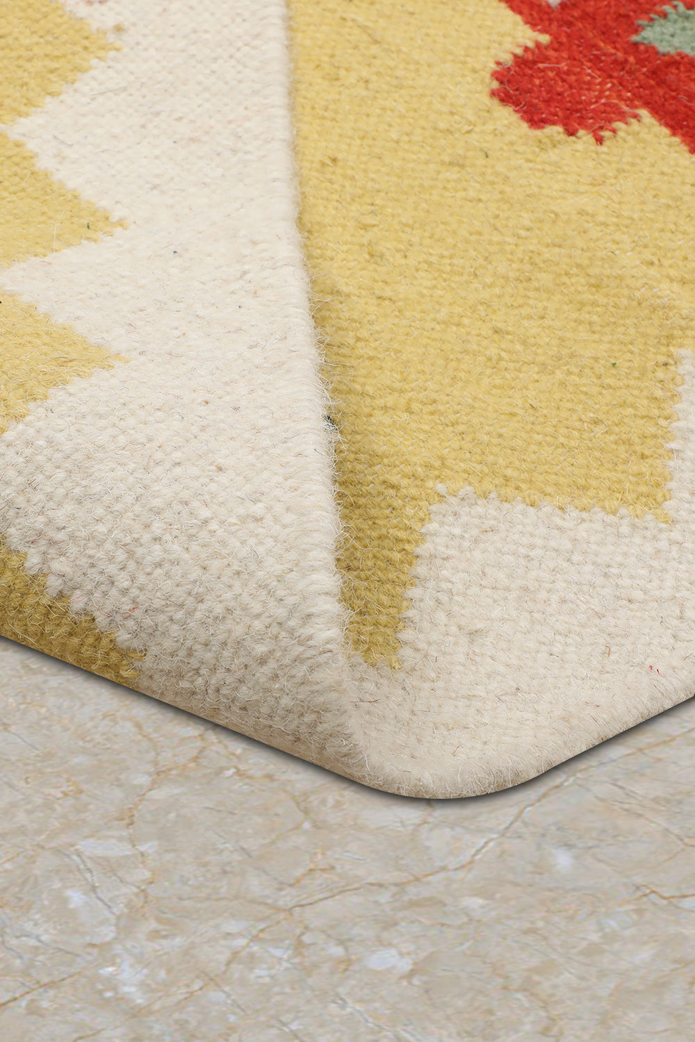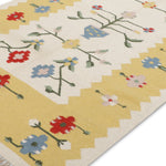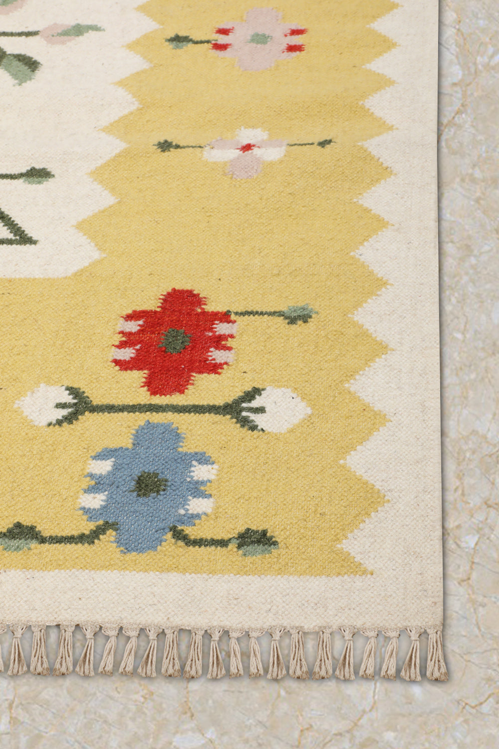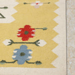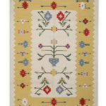 Brighten your home with the Roxana rug, a thoughtfully handwoven piece from our Odyssey Collection that fuses modern design with cultural heritage. This 5 x 8 ft wool kilim, featuring a low pile with a coarse texture, showcases a floral Tree of Life motif with geometric borders in sunny mustard yellow, creamy linen glow, and hints of soft amber. Its design draws from Persian and Central Asian traditions, where the Tree of Life symbolized eternal life and renewal since the 17th century, often woven into kilims for ceremonial use and later reimagined with modern flair. These patterns, reflecting cultural narratives of growth and continuity, influenced textile arts across trade routes, blending tradition with a fresh, bold aesthetic. The durable weave makes it perfect for living rooms or bedrooms seeking a vibrant accent.
