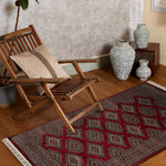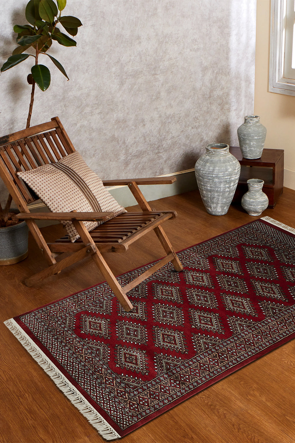 This hand-knotted wool rug, inspired by the eternal charm of the Turkmen Bokhara design, is a celebration of tribal artistry and enduring tradition. Rendered in a captivating maroon and cream palette, the rug’s motifs reflect a delicate balance of symmetry and storytelling, making it a striking addition to any living room or bedroom.