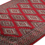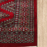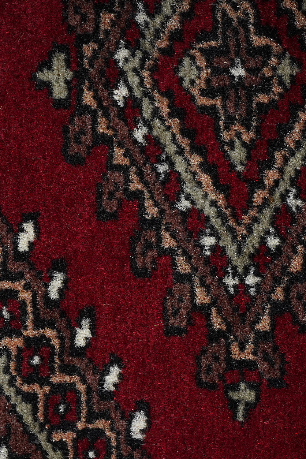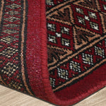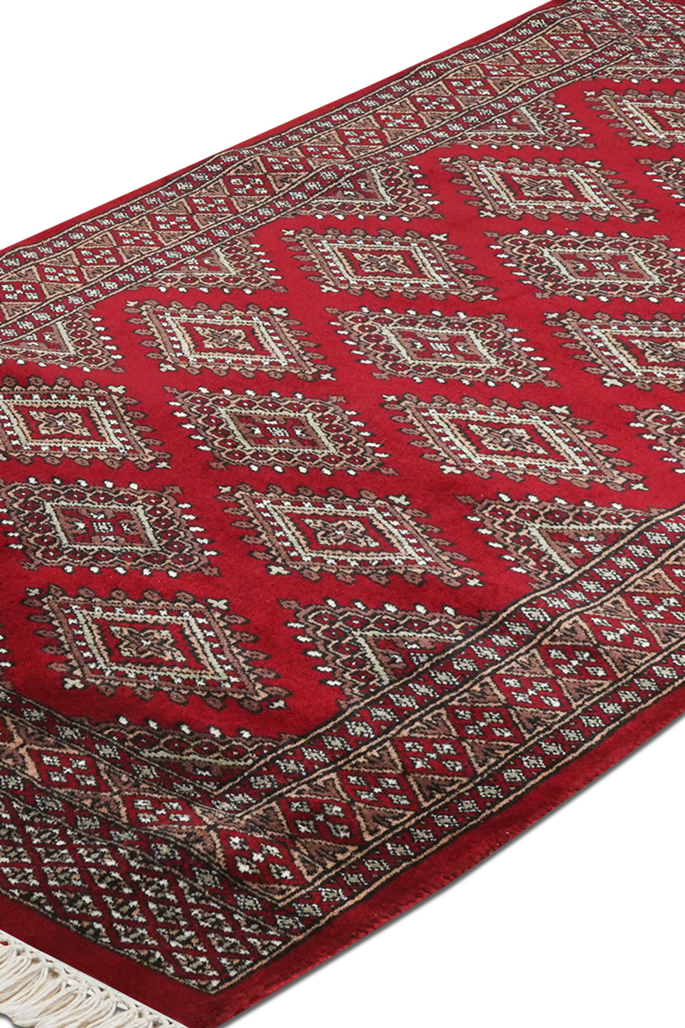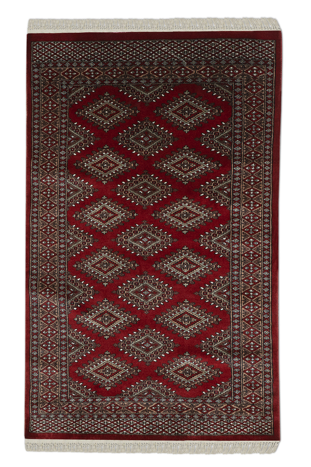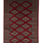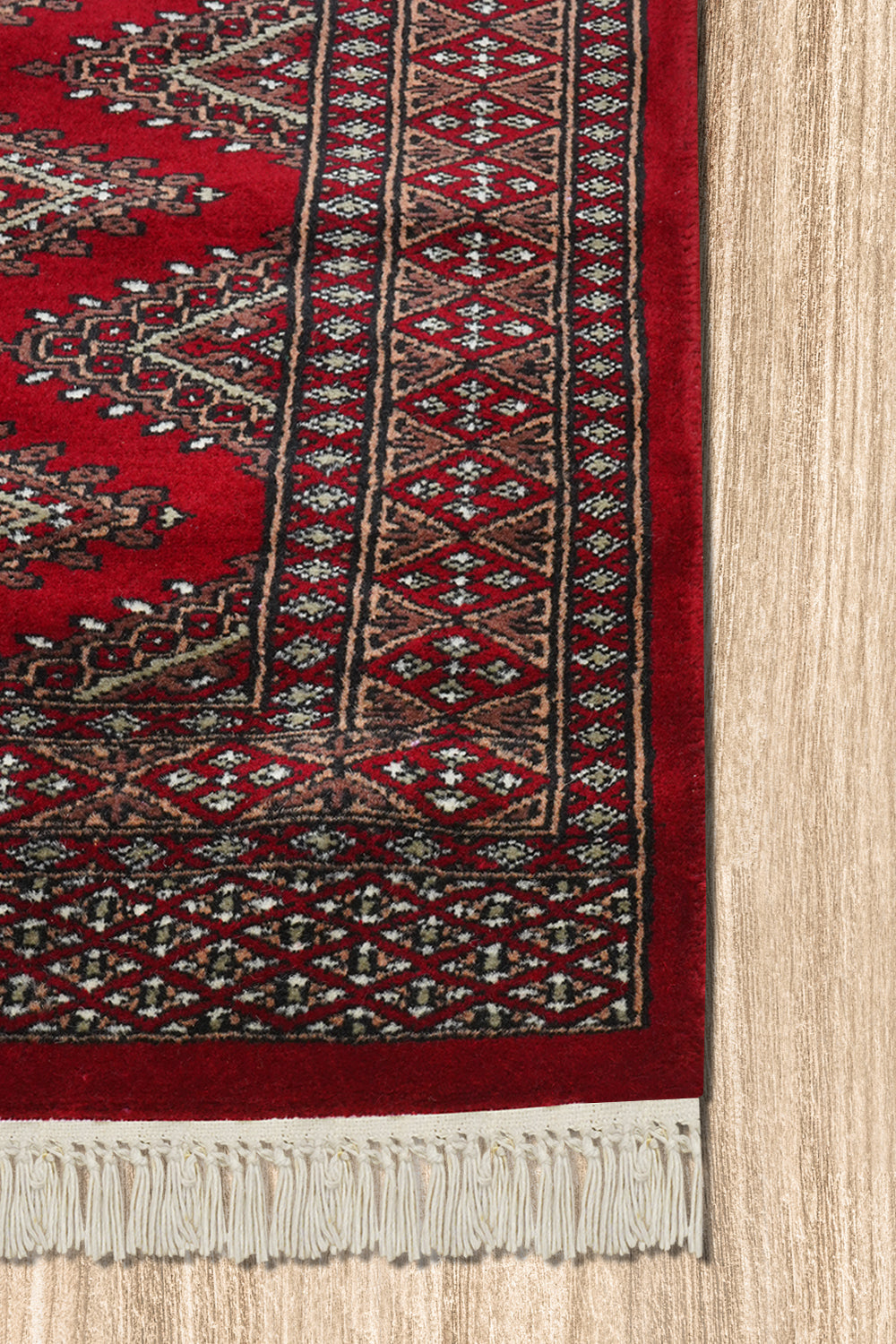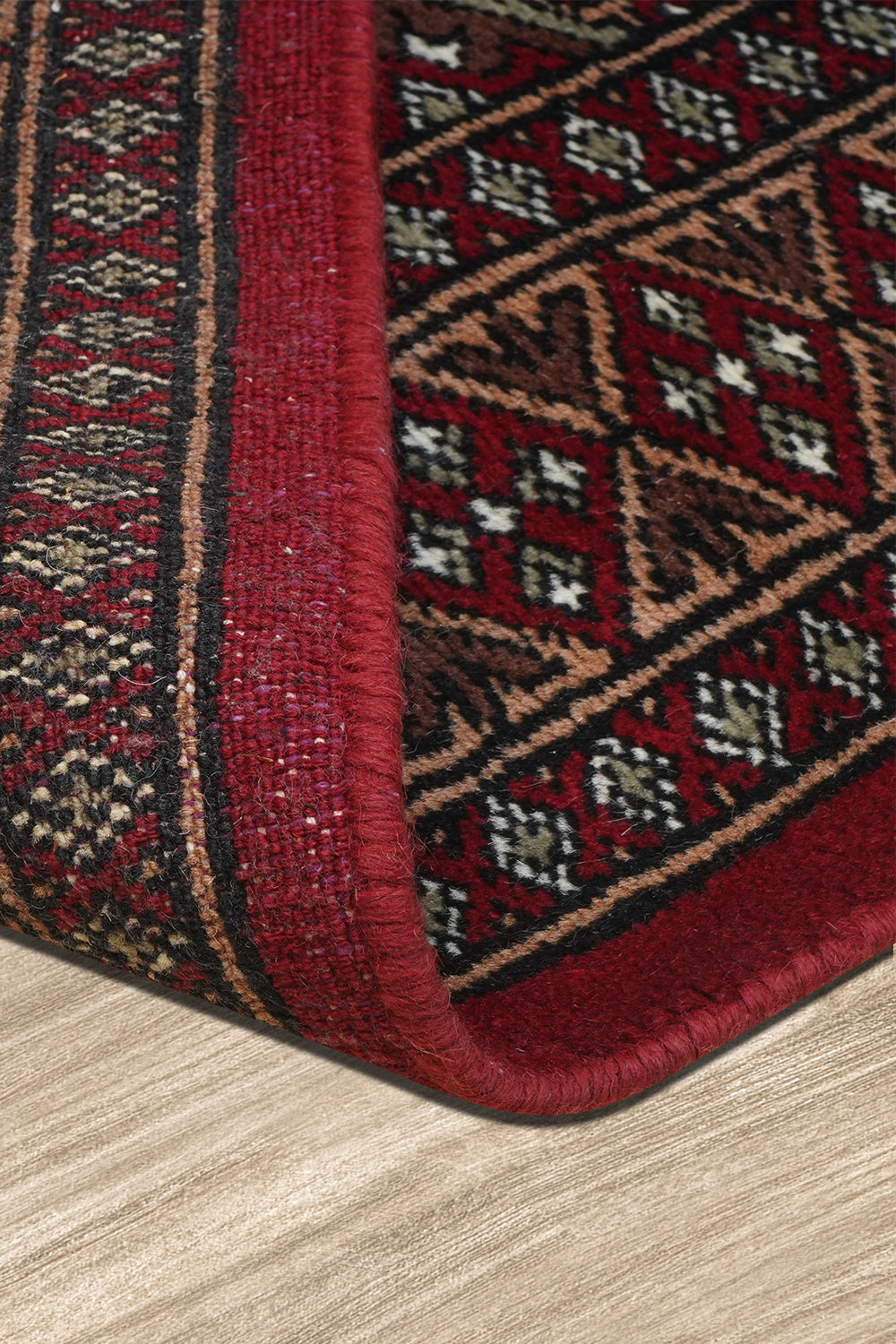 The Turkmen Bokhara design is a celebrated icon of Central Asian carpet weaving, known for its striking geometric patterns and a rhythmic repetition of octagonal "gul" motifs. Characterized by its simplicity and symmetry, this design showcases a blend of heritage and minimalistic elegance. What sets the Turkmen Bokhara apart is its rich, earthy color palette—deep reds, maroons, and blacks—accentuated with delicate ivory or gold detailing. These carpets stand out with their soft texture and distinctive tribal aesthetic, making them a timeless addition to any space.Crafted by artisans who have mastered the age-old techniques of rug weaving, this 3x5 rectangular piece radiates warmth and authenticity. The medium pile offers just the right blend of comfort and durability, while the mild softness of the wool adds a touch of understated luxury.