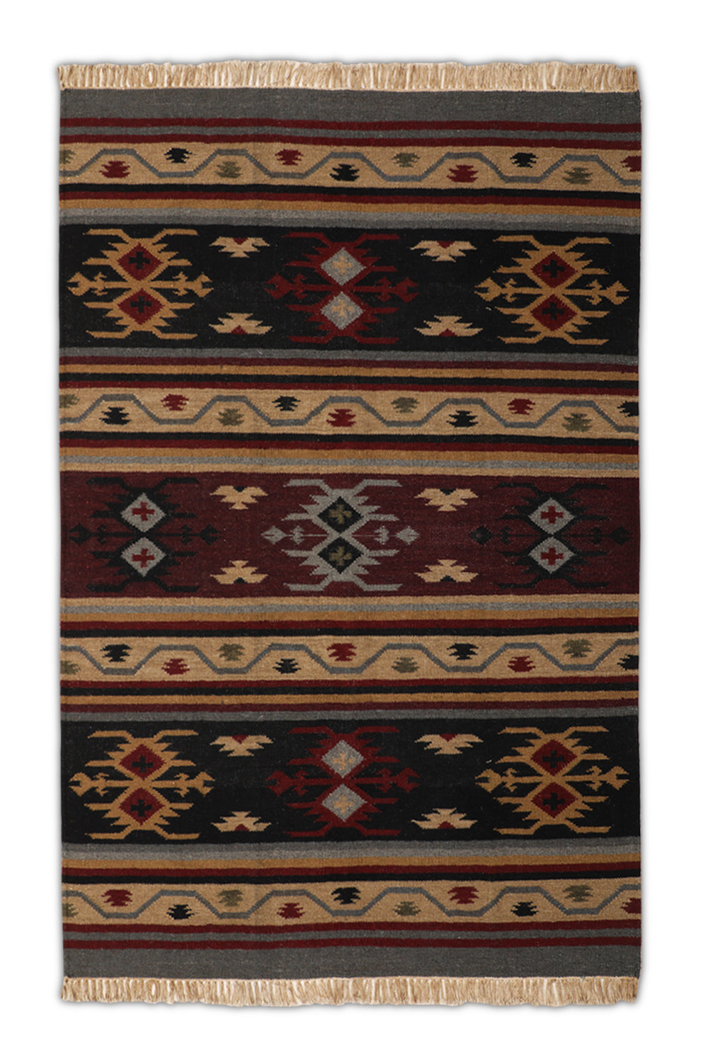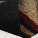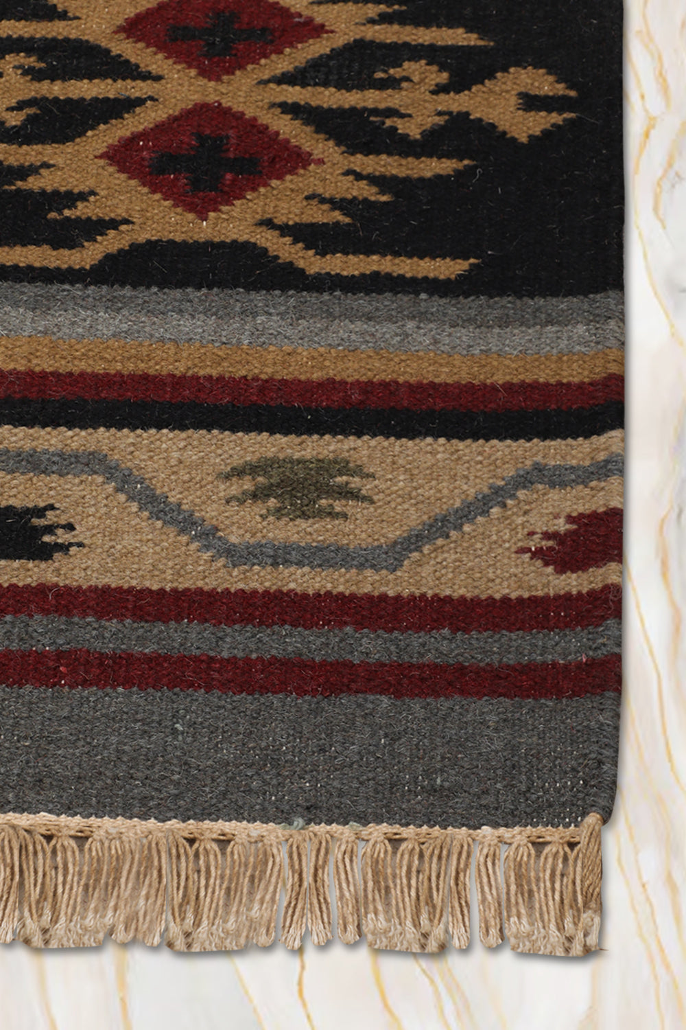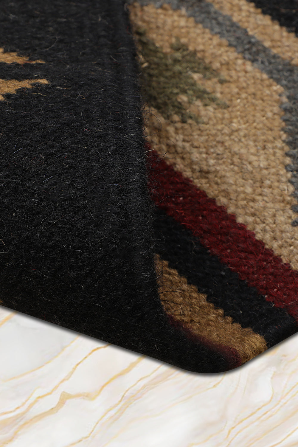 Transform your space with the Runa rug, a striking handwoven piece from our Odyssey Collection that blends modern simplicity with timeless craft. This 4 x 6 ft wool rug, featuring a low pile with a coarse texture, showcases geometric diamond and stripe motifs in deep ebony night, warm beige sand, and hints of soft rust. Its design draws from nomadic weaving traditions, where geometric patterns symbolized protection and community since ancient times, often crafted into flatweave Kilims to reflect tribal identities and journeys. These motifs, embodying cultural narratives of resilience and unity, influenced textile arts across trade routes, offering a bold yet versatile aesthetic. The sturdy texture makes it perfect for living rooms or bedrooms seeking a contemporary accent.