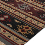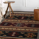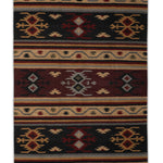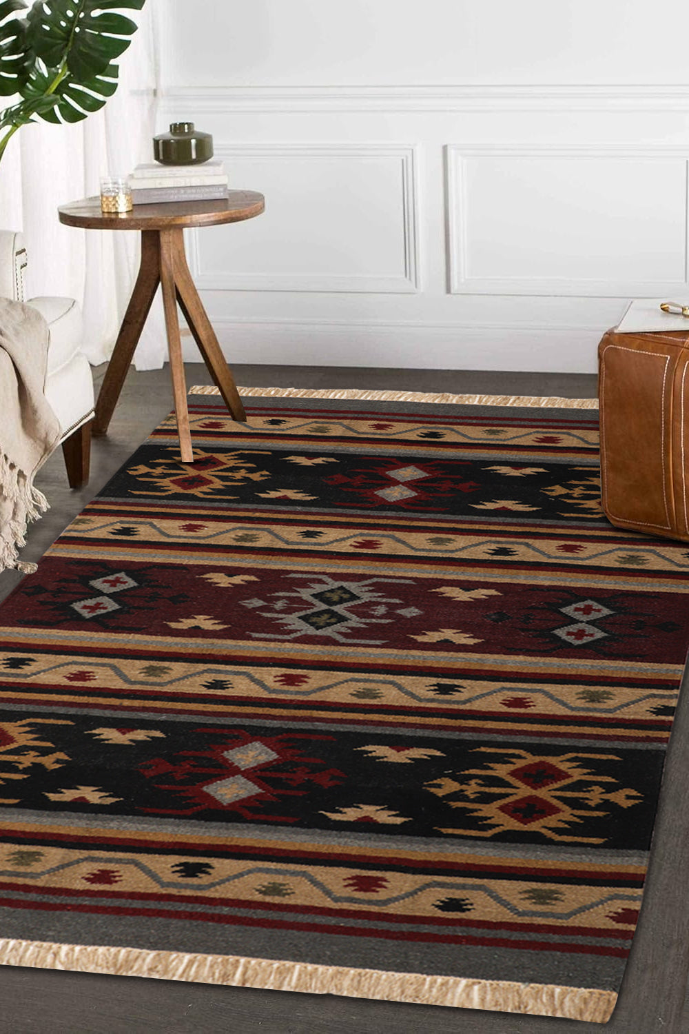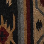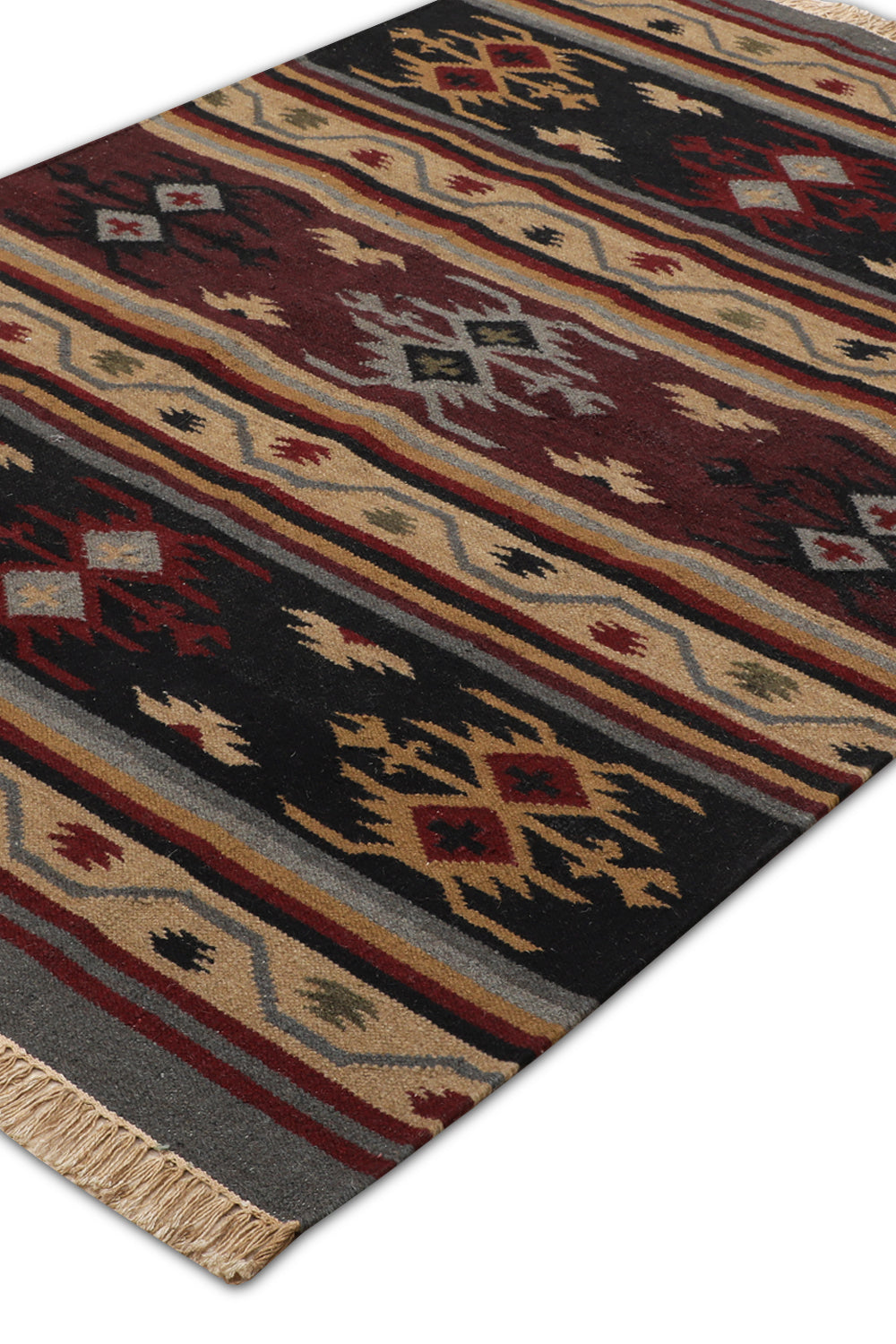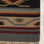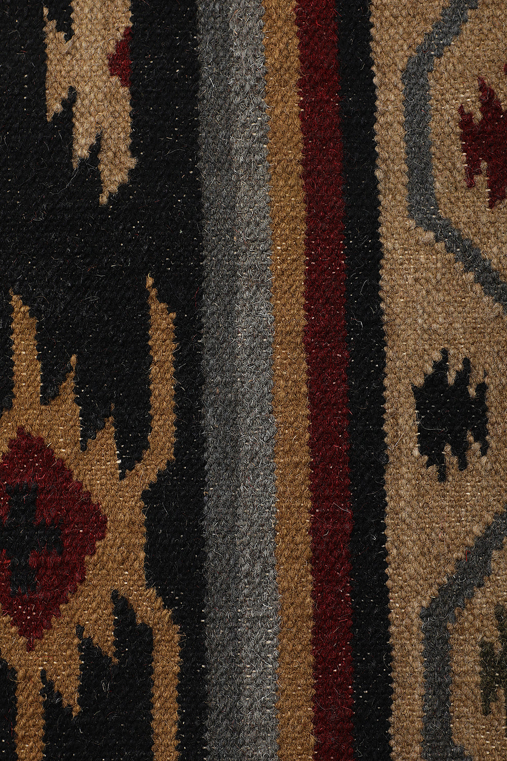 Transform your space with the Runa rug, a striking handwoven piece from our Odyssey Collection that blends modern simplicity with timeless craft. This 4 x 6 ft wool rug, featuring a low pile with a coarse texture, showcases geometric diamond and stripe motifs in deep ebony night, warm beige sand, and hints of soft rust. Its design draws from nomadic weaving traditions, where geometric patterns symbolized protection and community since ancient times, often crafted into flatweave Kilims to reflect tribal identities and journeys. These motifs, embodying cultural narratives of resilience and unity, influenced textile arts across trade routes, offering a bold yet versatile aesthetic. The sturdy texture makes it perfect for living rooms or bedrooms seeking a contemporary accent.