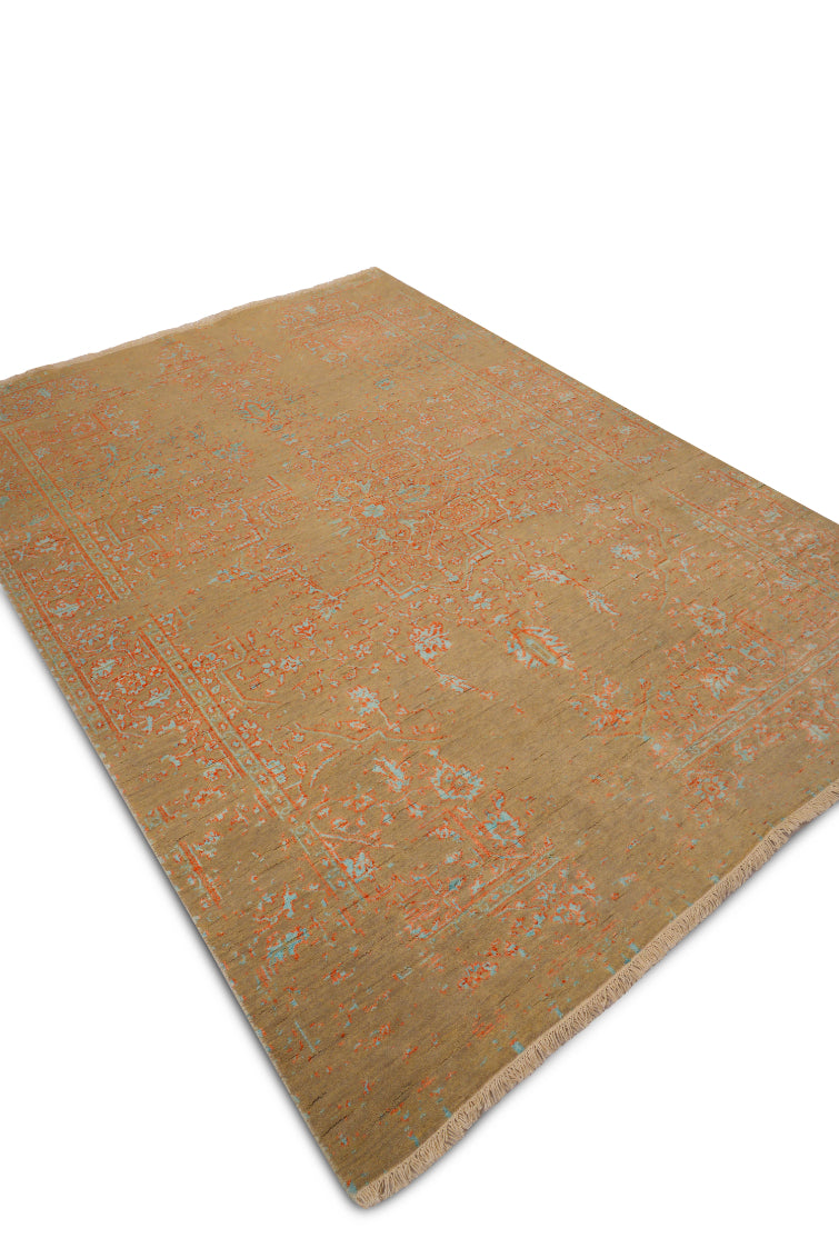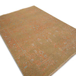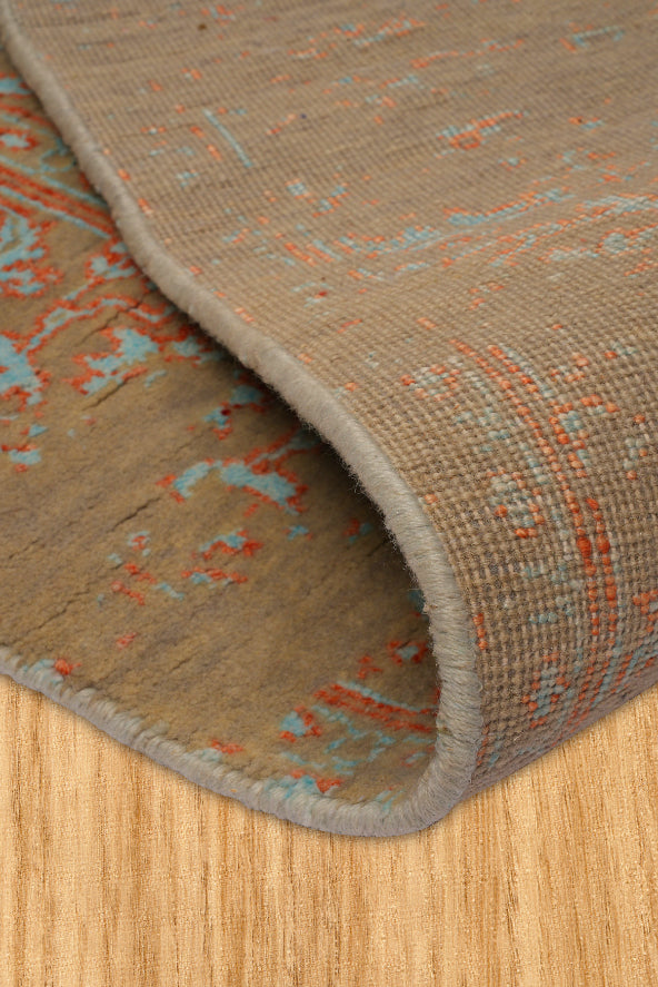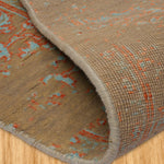 Step into a blend of vintage charm and transitional style with the Saanjh rug, a captivating piece from our Sangam Collection that showcases timeless craftsmanship. This 5 x 7 ft hand-knotted wool rug, featuring a medium pile with a mild soft texture, displays a distressed floral medallion pattern with faded geometric borders in cool slate grey, burnt tangerine orange, and hints of warm taupe. Its design draws from Persian and Central Asian rugs, where floral medallions symbolized renewal and divine beauty since the 17th century, often woven for ceremonial settings. The distressed finish reflects a cultural narrative of endurance, influencing decorative arts across centuries through trade routes. The cozy feel underfoot makes it ideal for living rooms or bedrooms seeking a nostalgic yet modern touch.