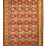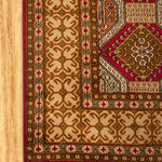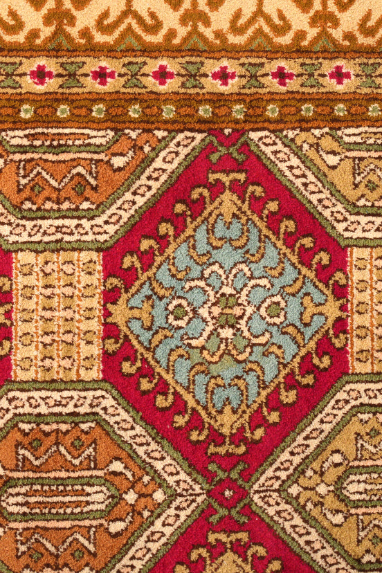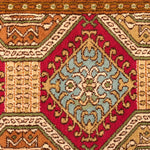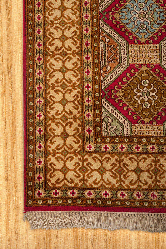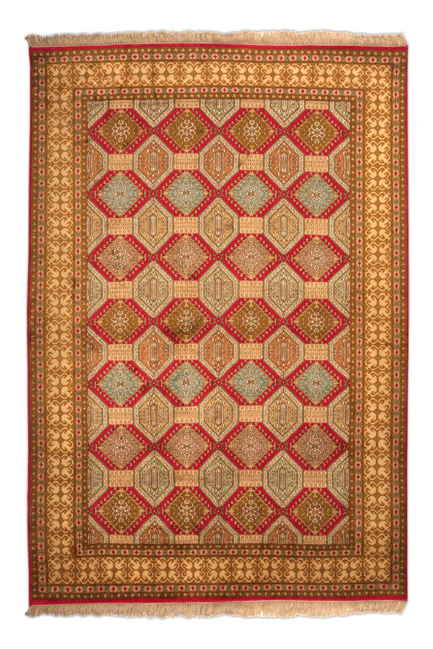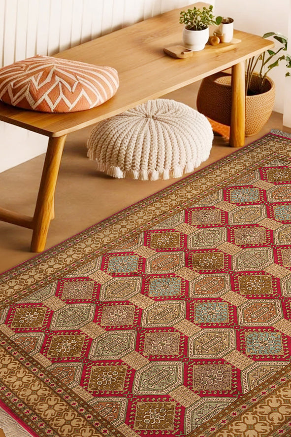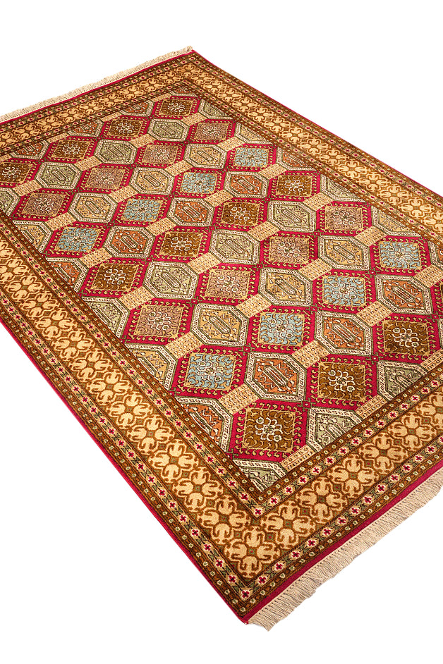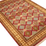 Step into the opulence of oriental tradition with the Safaviya rug, a stunning piece from our Chahat Collection that embodies masterful craftsmanship. This 4 x 6 ft hand-knotted silk rug, featuring a low pile, showcases a pattern of diamond medallions and ornate borders in vibrant crimson red, lustrous golden amber, and hints of bronze glow. Its design draws from Persian and Central Asian rugs, where diamond motifs symbolized protection and prosperity, woven since the 16th century for royal and religious settings. These patterns, reflecting cultural ideals of harmony and abundance, influenced decorative arts across the Silk Road, blending heritage with timeless appeal. The soft texture underfoot offers a luxurious feel, ideal for living rooms or bedrooms seeking a touch of elegance.