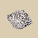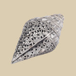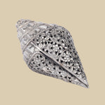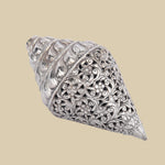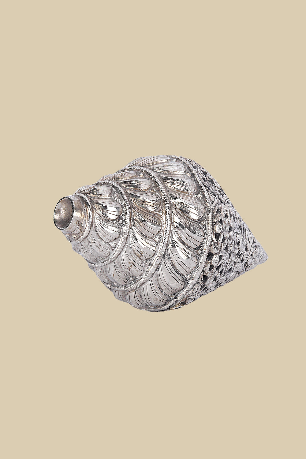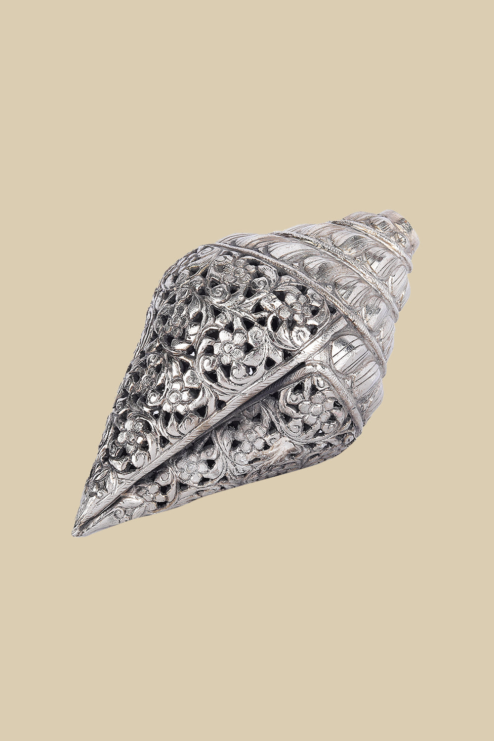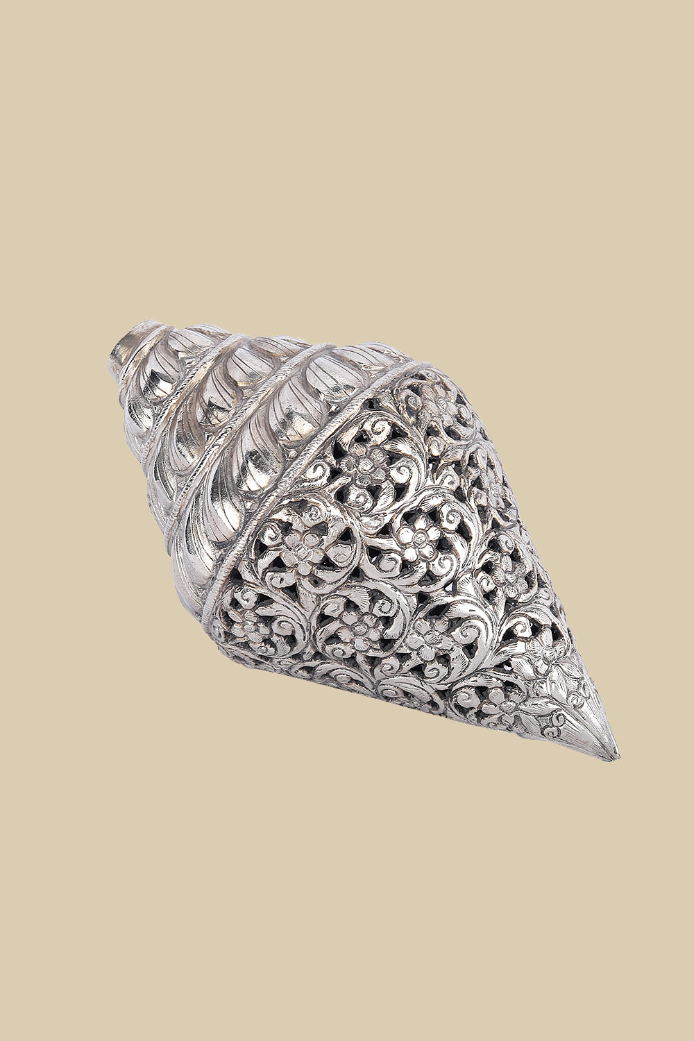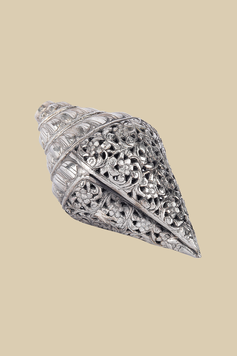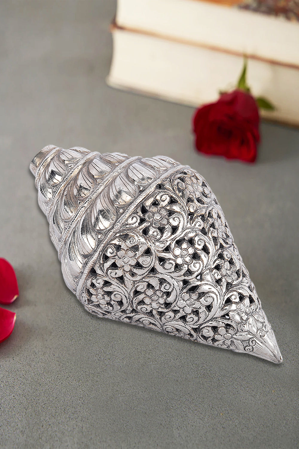 This stunning white metal conch shell embodies Indian spiritual artistry with its intricate openwork filigree of vines, lotus blooms, and scrolling patterns. Crafted with precision, its lace-like design and darkened recesses symbolize purity and divine resonance, a revered element in traditional Indian culture. Perfect as a sacred decor piece for puja rooms or meditation altars, this handcrafted ornament adds refined elegance to heritage-inspired decor or luxury home interiors.