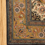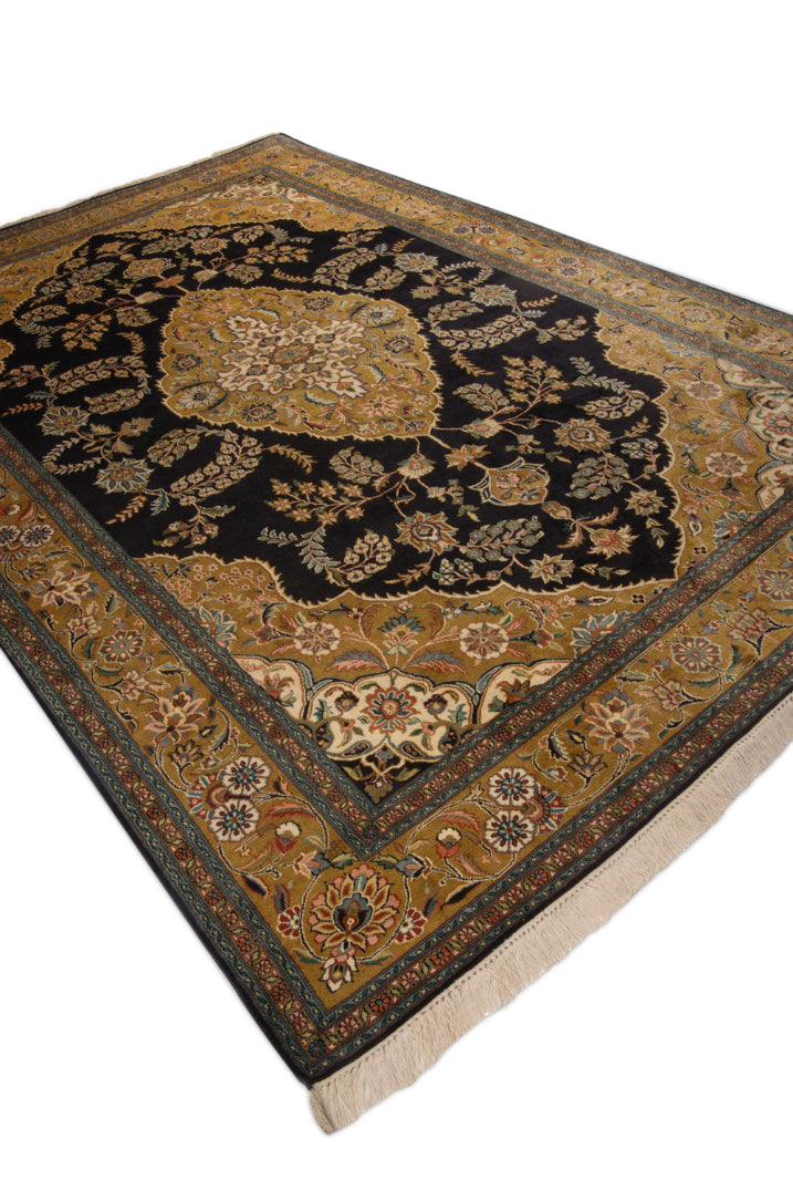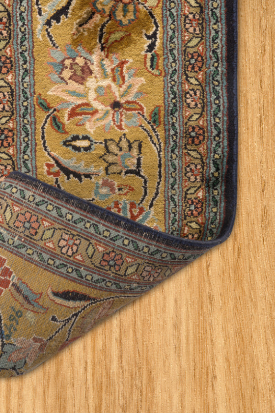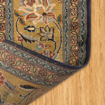 Immerse yourself in the grandeur of oriental tradition with the Shahanai rug, a stunning piece from our Viraasat Collection that showcases exquisite craftsmanship. This 6 x 9 ft hand-knotted silk rug, featuring a low pile, displays a central medallion with floral arabesques in deep navy indigo, rich golden ochre, and hints of amber glow. Its design reflects Persian and Mughal artistry, where floral medallions symbolized paradise gardens, representing divine beauty, prosperity, and spiritual harmony since the 16th century. These patterns, woven for royal courts and mosques, embodied cultural ideals of opulence, influencing textile traditions across. Asia, Europe, and beyond. The soft texture underfoot adds a luxurious feel, ideal for living rooms or dining rooms seeking a regal accent.