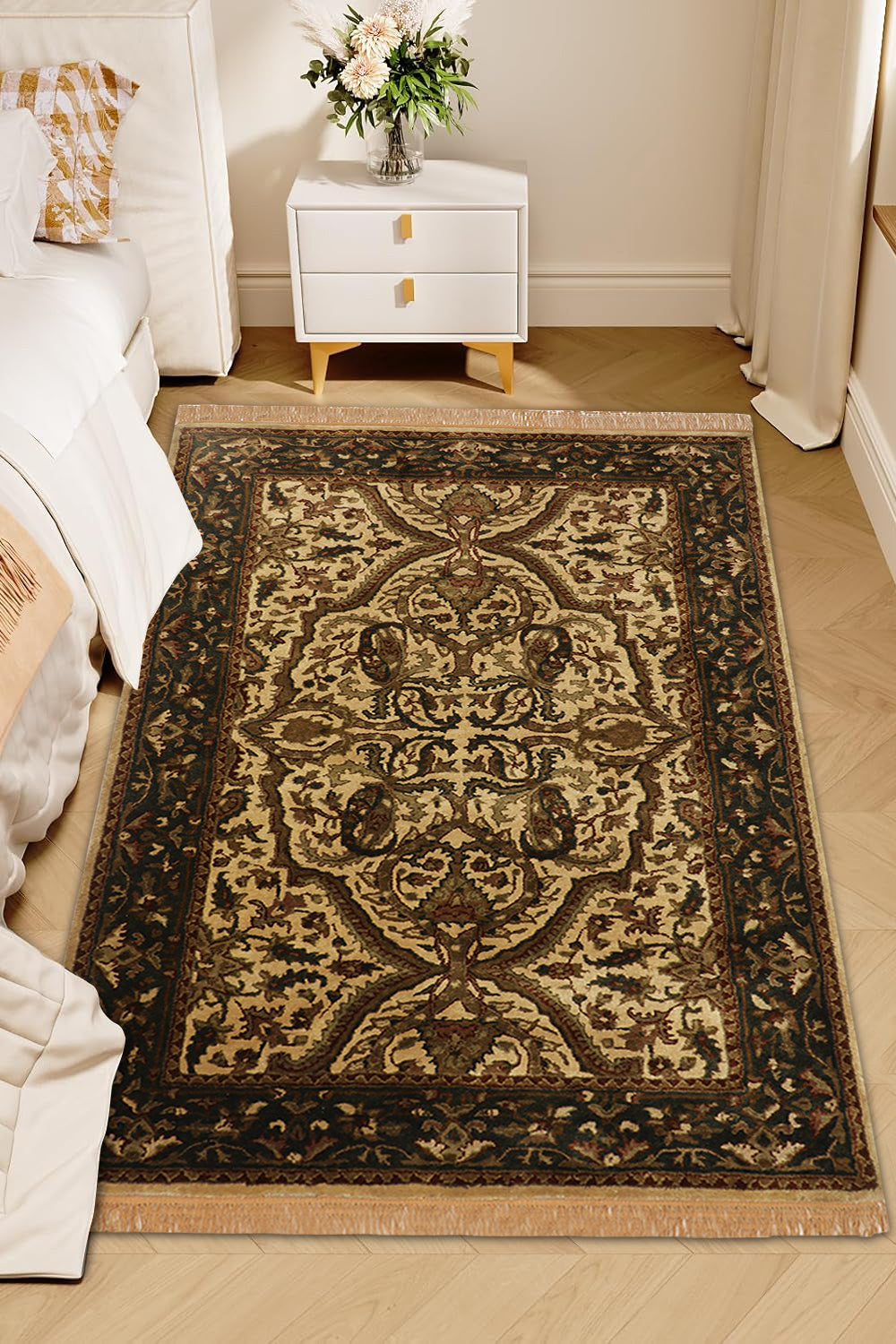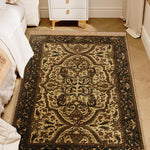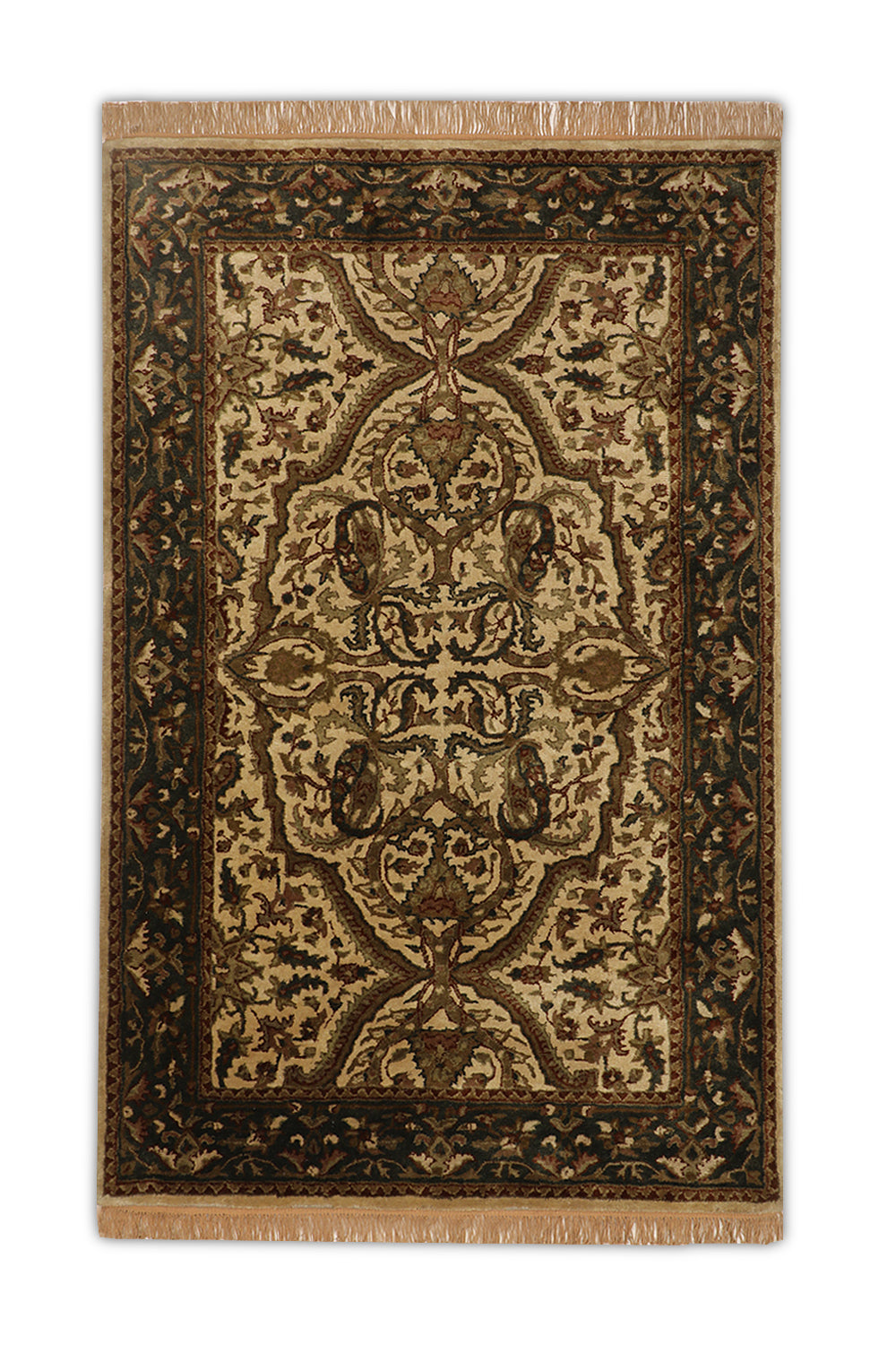 Infuse your living space with timeless elegance using the Shahriar rug, a beautifully crafted piece from our Chahat Collection that reflects Oriental artistry. This 3.6 x 5.6 ft hand-tufted wool rug, featuring a high pile with a mild soft texture, showcases a central medallion with intricate floral and paisley motifs in warm beige sand, deep chestnut brown, and hints of soft caramel. Its design draws from Persian and Central Asian traditions, where medallions and paisley patterns symbolized prosperity and divine protection since the 16th century, often woven into rugs for ceremonial and domestic settings. These motifs, reflecting cultural narratives of abundance, influenced textile arts across trade routes, blending heritage with enduring sophistication. The plush feel underfoot makes it perfect for living rooms or bedrooms seeking a classic touch.