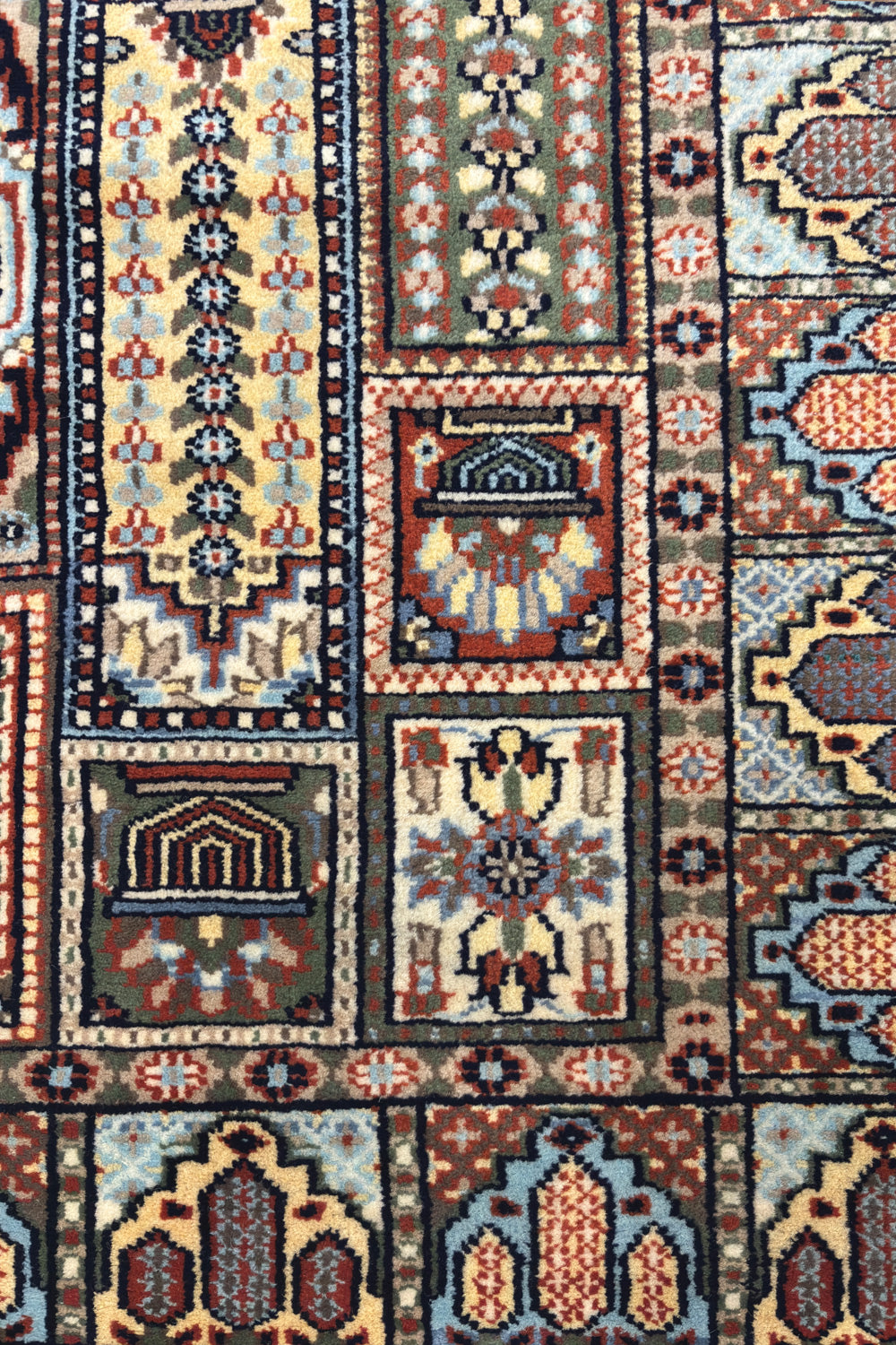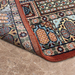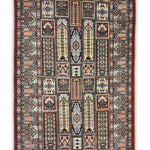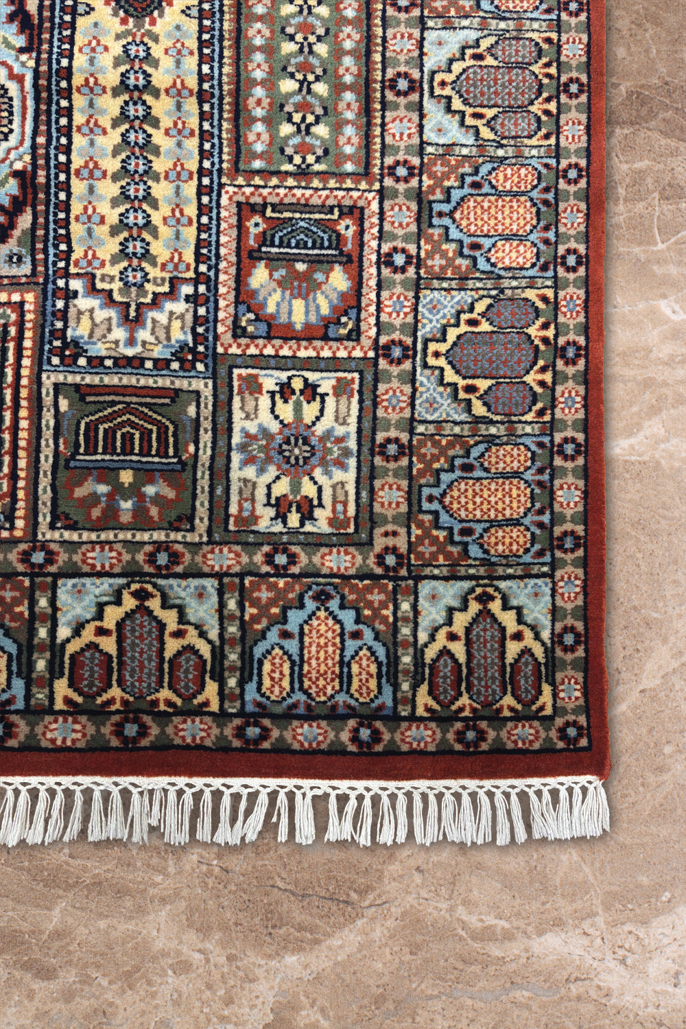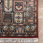 The Shatranj rug draws inspiration from the intricate geometry of chessboard mosaics and palace tiles. Each panel is hand-knotted with meticulous precision, creating a tapestry of repeating motifs that feel both structured and alive. The rust red gives warmth, while pale blue offers a cool contrast, balancing energy and calm.