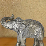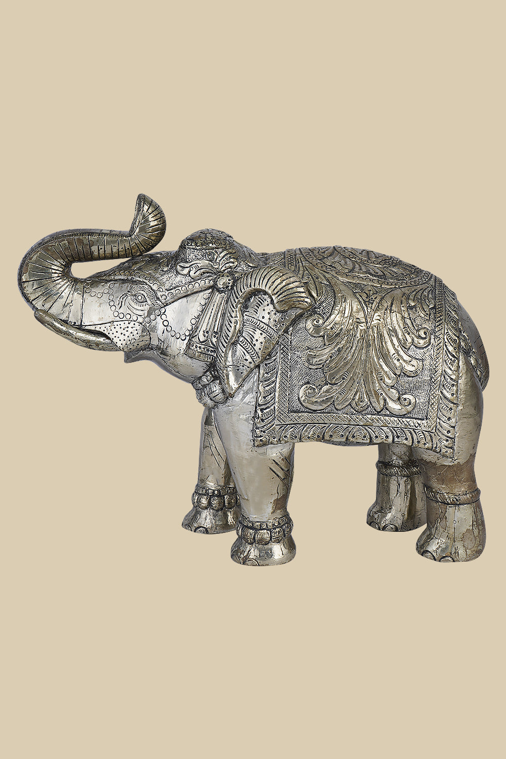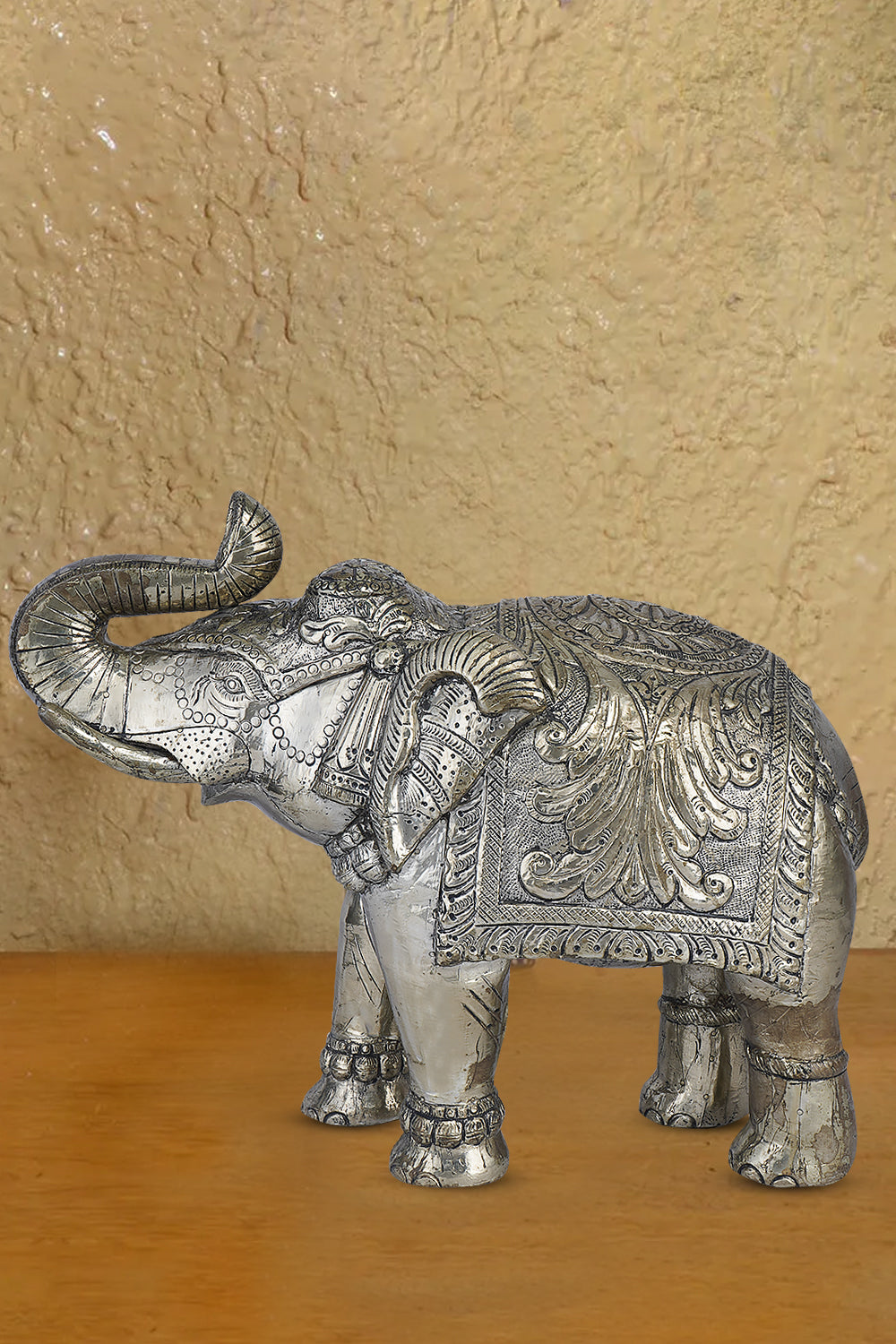 Symbolic of strength and wisdom, the elephant holds a revered place in Indian culture, and this decorative statue embodies those ideals. The reflective white metal finish enhances its regal presence, making it a striking focal point for any space. Whether placed on a console table or as part of a curated collection of antiques, this figurine stands out as a testament to skilled craftsmanship and timeless elegance.