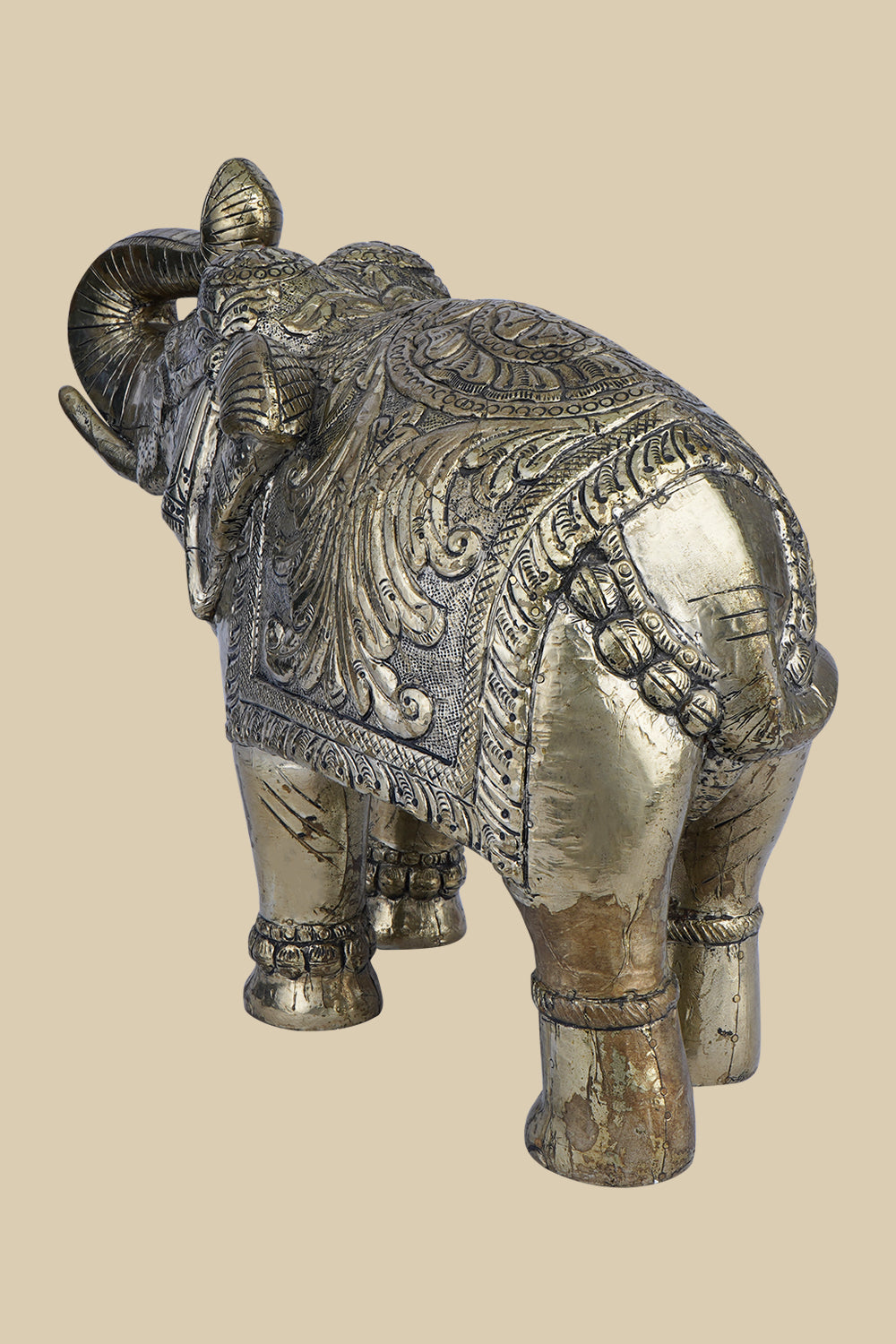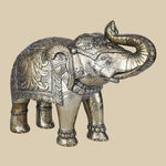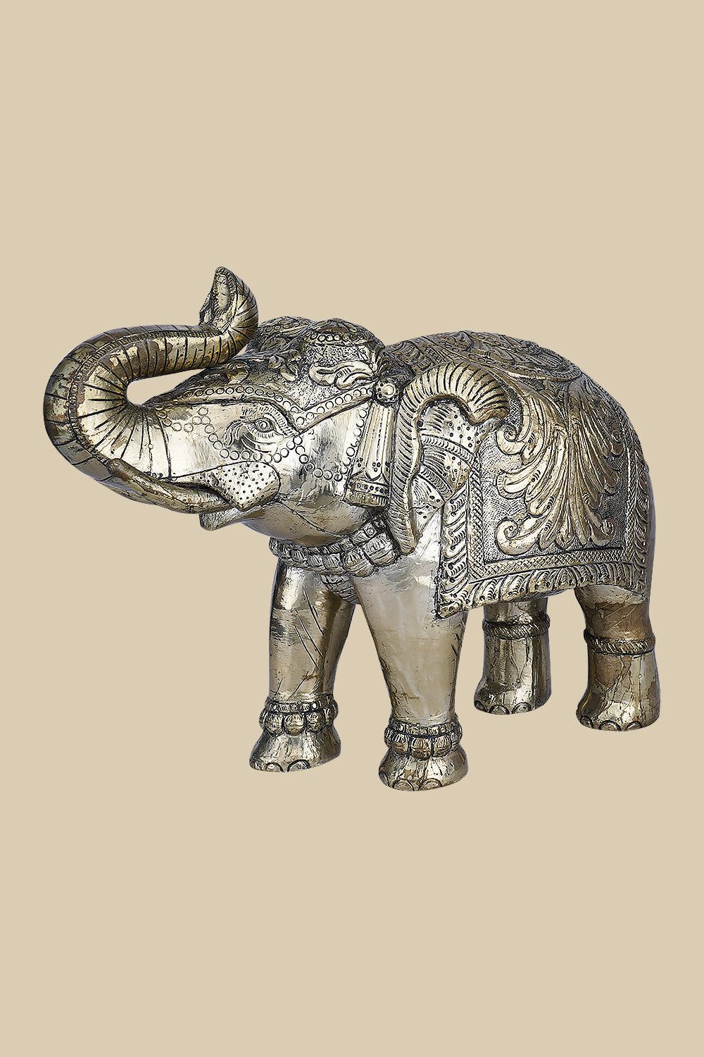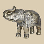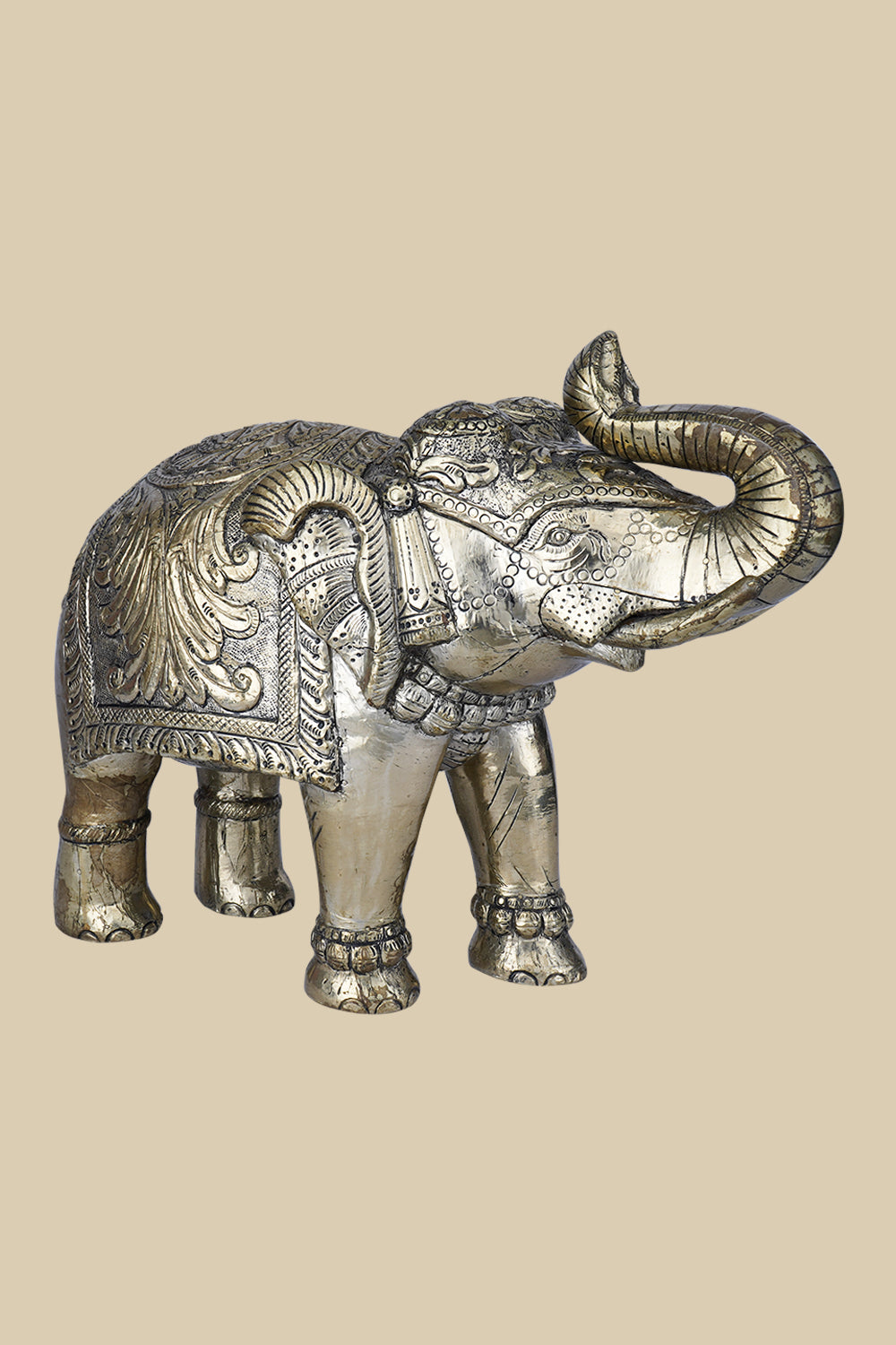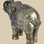 The White Metal Carved Elephant figurine (35 cm x 43 cm x 18 cm) is a masterpiece that blends tradition with artistry. Precisely crafted, this antique sculpture showcases carvings that span the entirety of the elephant's form. Each delicate detail, from the ornate patterns on its back to the finely etched tusks, captures the essence of India's decorative heritage.