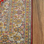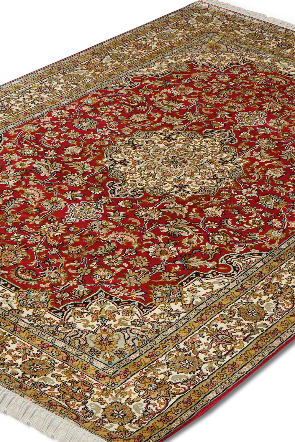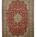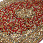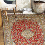 The bold crimson red base contrasts gracefully with sage green and beige accents, creating a harmonious interplay of colors. At its heart lies a medallion design, framed by floral tendrils and ornate vines that evoke the splendor of grand palace gardens. Every knot speaks of dedication, as skilled artisans bring the legacy of Isfahan carpets to life through meticulous craftsmanship and artistry.