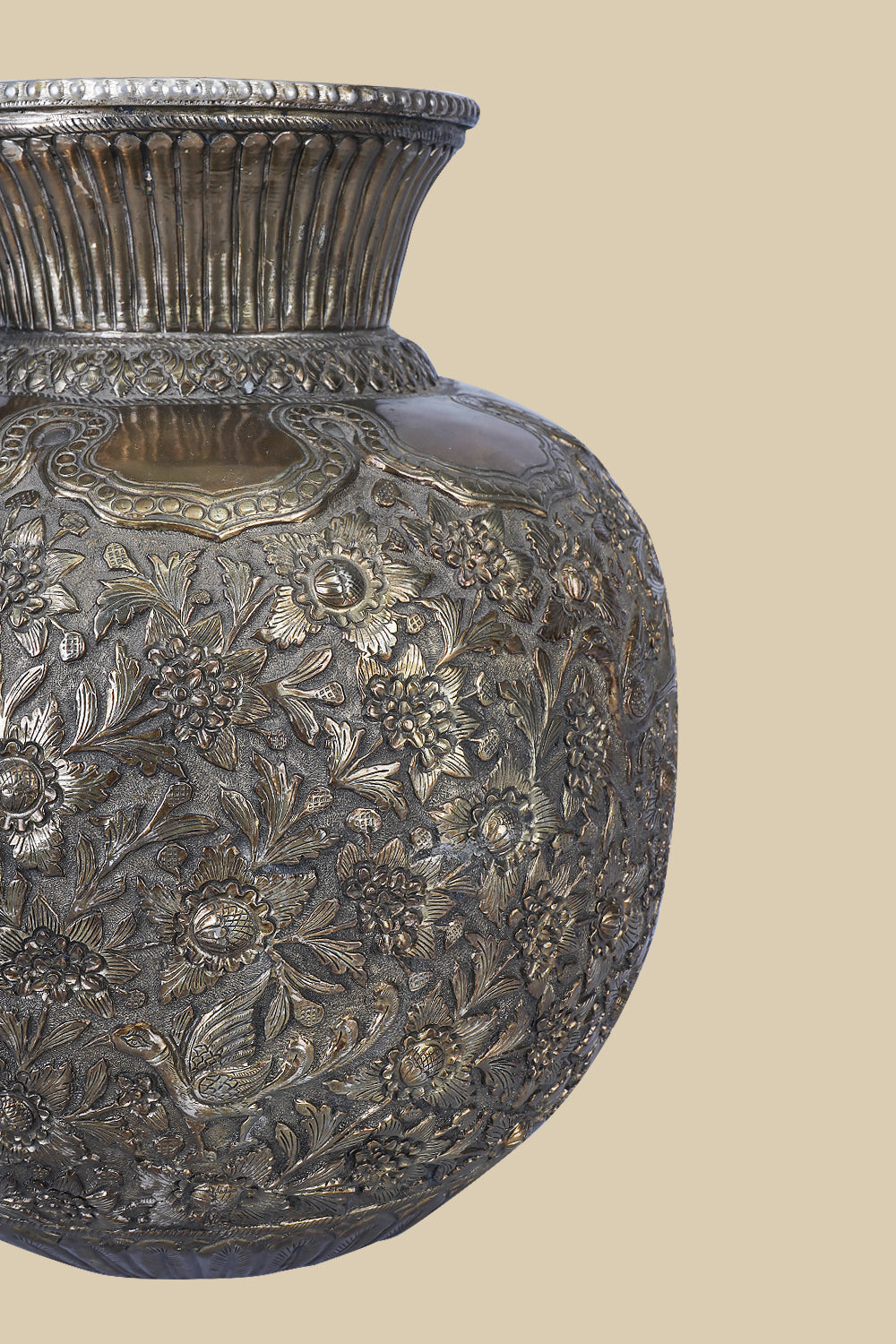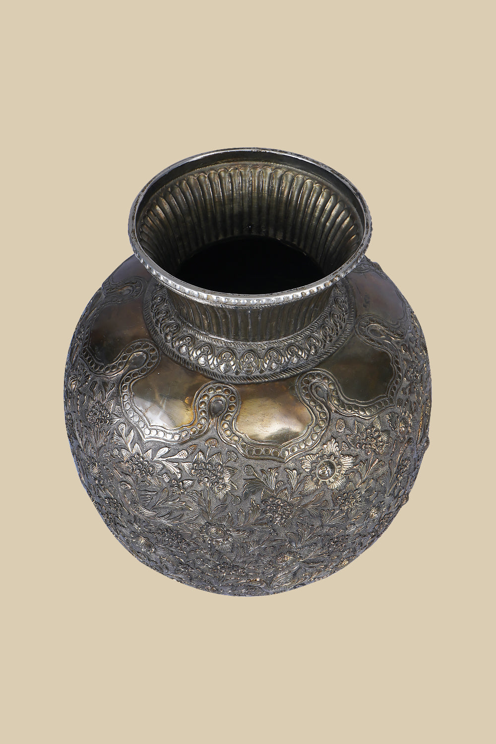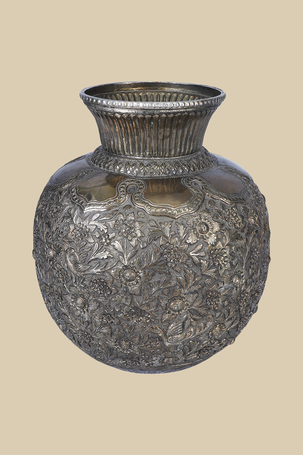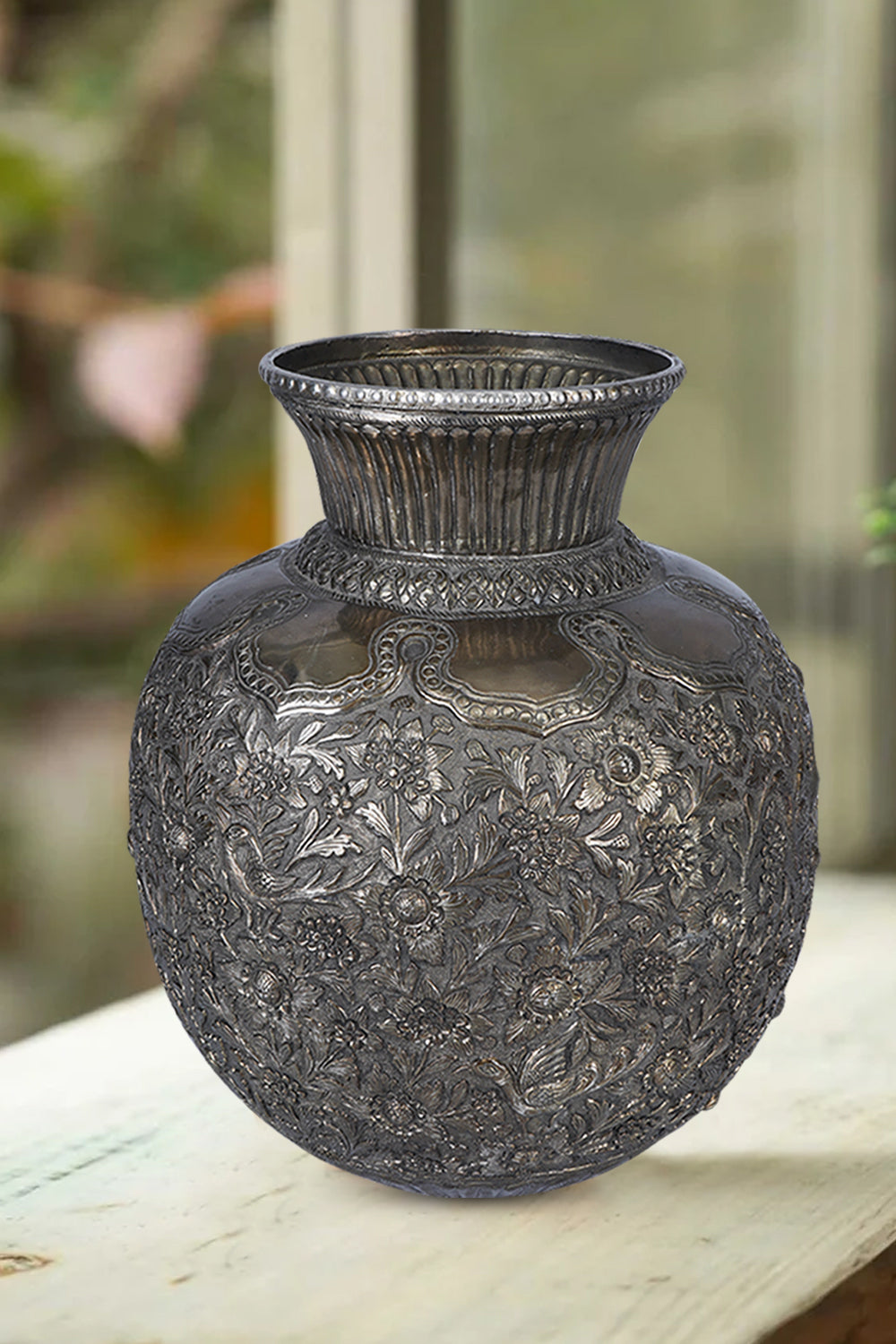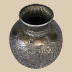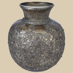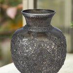 This intricately carved white metal vase has patterns that flow seamlessly across the surface, showcasing the exquisite detail and elegance that white metal can achieve. The smooth, polished finish of the vase reflects light, accentuating the delicate artistry of the design. This decorative vase serves as an elegant statement piece, with its regal appearance reminiscent of antique sculptures. Its refined and timeless aesthetic effortlessly complements a range of interior styles, from traditional to modern. Whether displayed with fresh flowers or as a standalone art piece, it adds a sense of grandeur to any space. The white metal vase is a piece of art that speaks to the rich heritage of Indian craftsmanship.