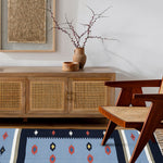 Sleek and sophisticated, this rug from the Odyssey collection brings together modern aesthetics and traditional craftsmanship. This 4x6 rectangular Kilim rug, handwoven in wool, showcases a timeless flat-weave technique, offering durability with a lightweight structure. The intricate geometric motifs in warm camel brown, deep navy blue, and soft blush tones create a harmonious blend of tradition and contemporary design.  Kilims are created using flat-weave techniques, producing a lightweight yet durable textile. Historically, Kilims were not just decorative; they were practical pieces used as floor coverings, wall hangings, bedding, and even bags.