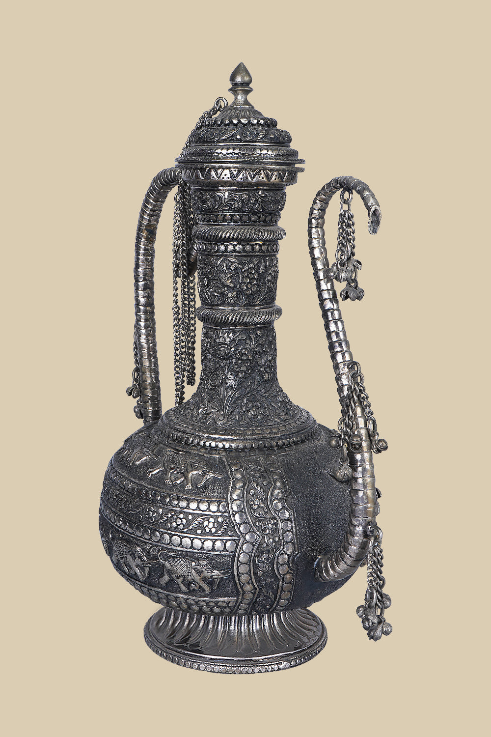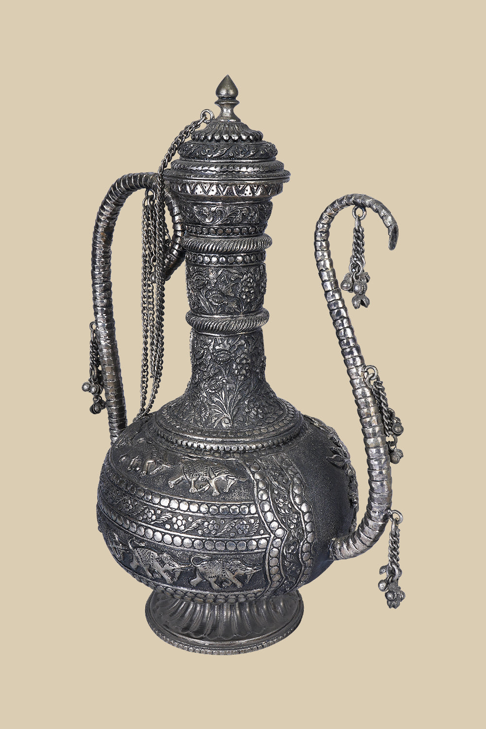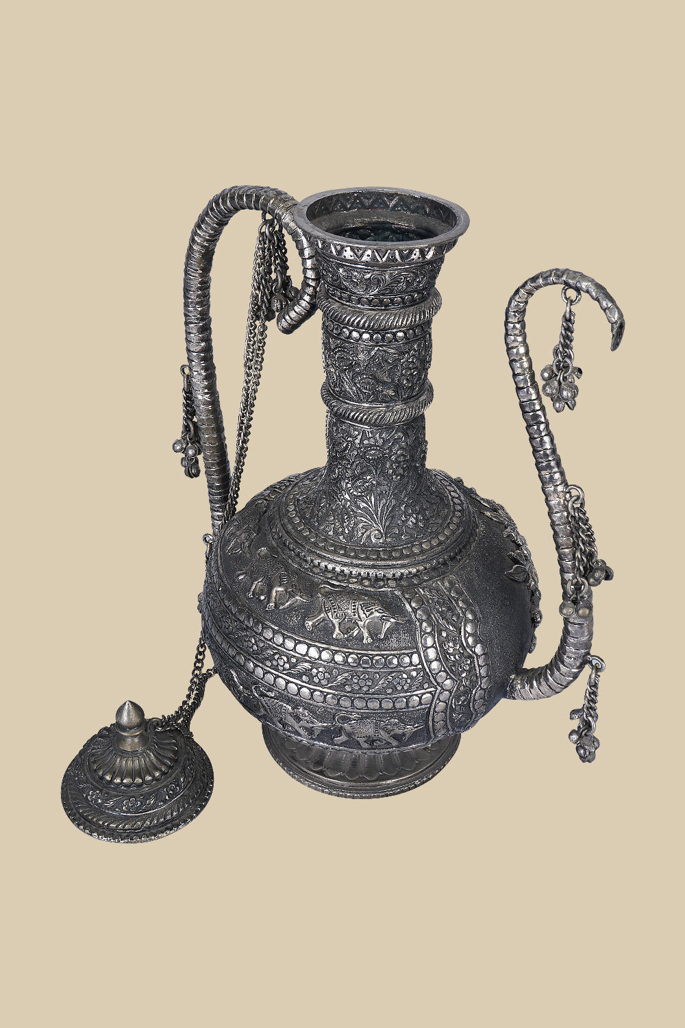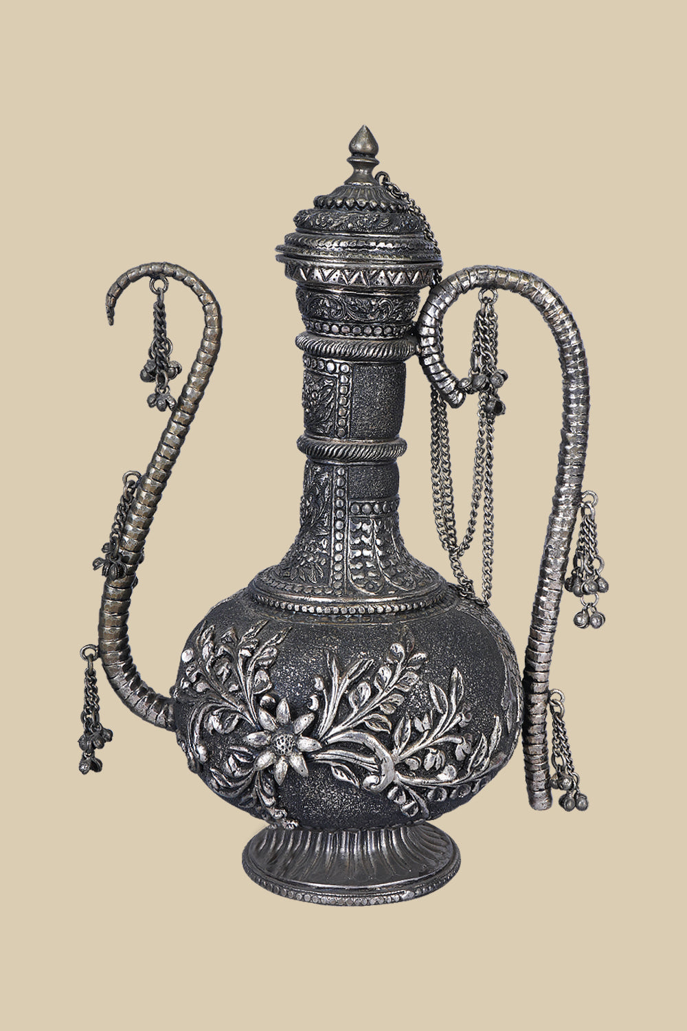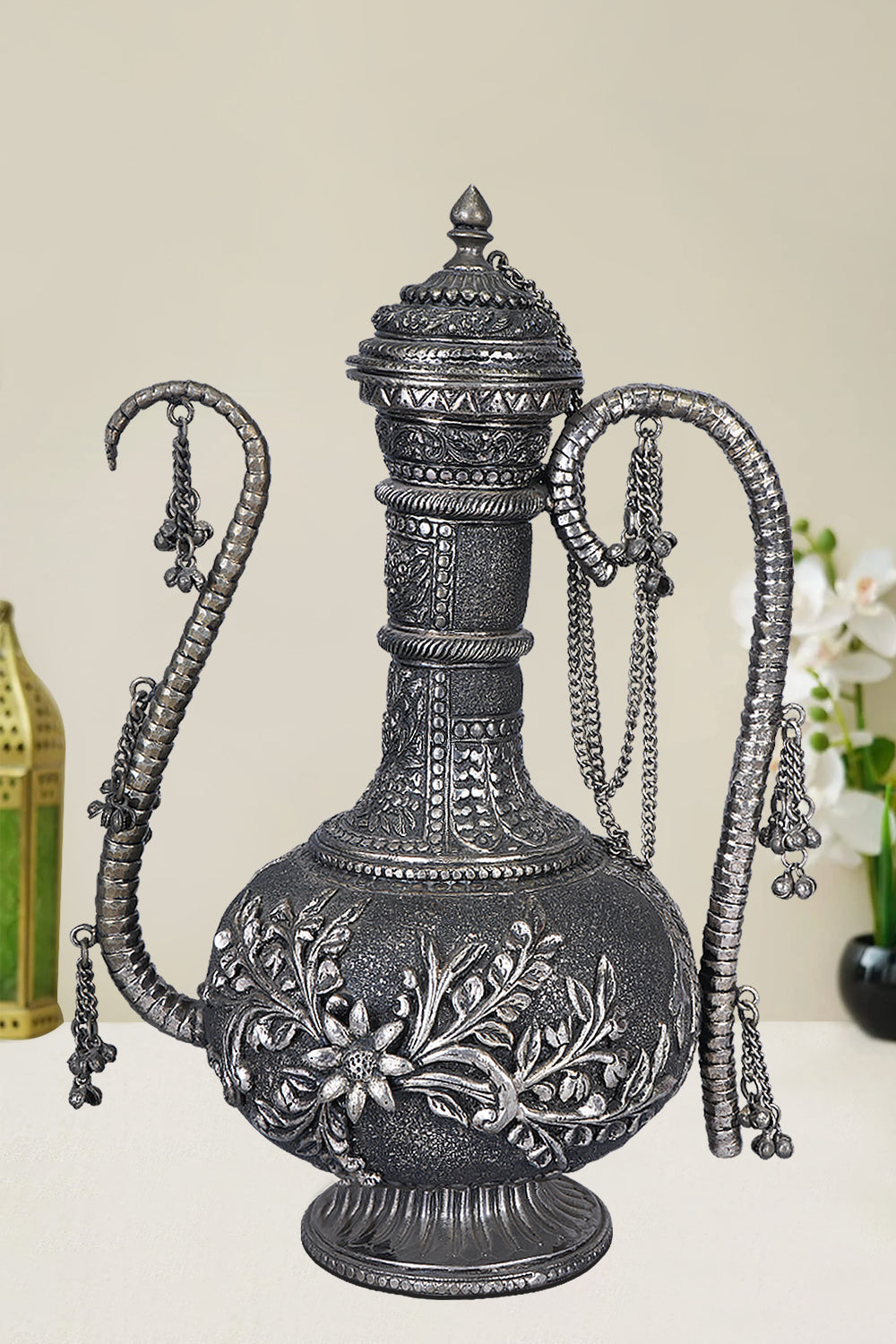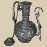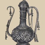 This 37 cm tall White Metal Carved Surahi featuring detailed engravings along its surface exudes a sense of history and artistry. The Surahi is an ancient vessel, brought to life showcasing a beautiful blend of old-world charm and the relevance of coming of age aesthetic.