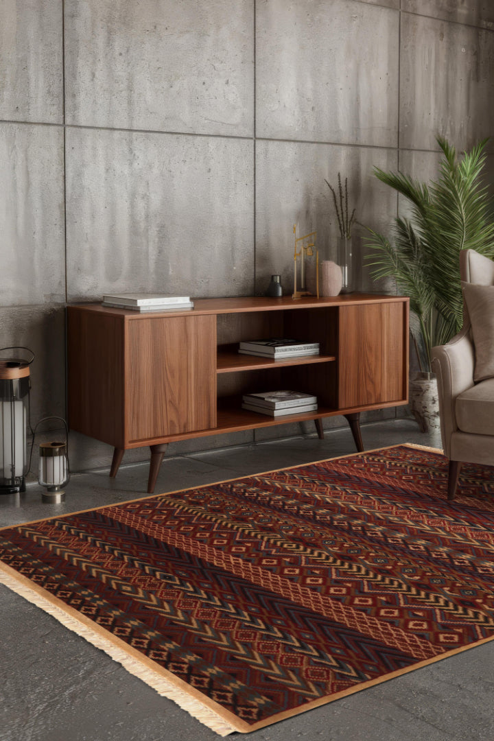 Enhance your space with this rectangular rug, where every thread weaves a narrative of historical inspiration and modern versatility. The geometric design, rooted in ancient tribal traditions, complements both minimalist and eclectic interiors with its earthy elegance. Ideal for contemporary homes, it blends durability with a vibrant sophistication, creating a bold yet inviting focal point. Its warm tones transform any room, infusing it with a sense of cultural depth and timeless appeal. Discover a rug that bridges ancient patterns with today’s living spaces.