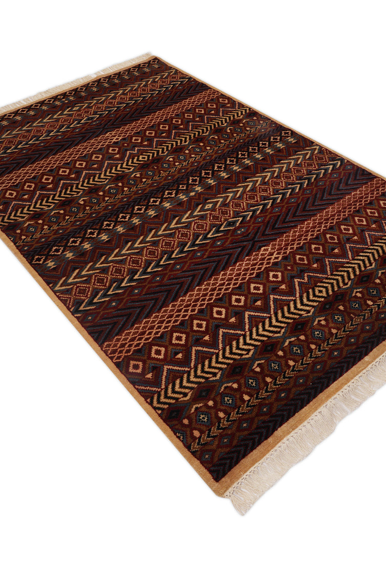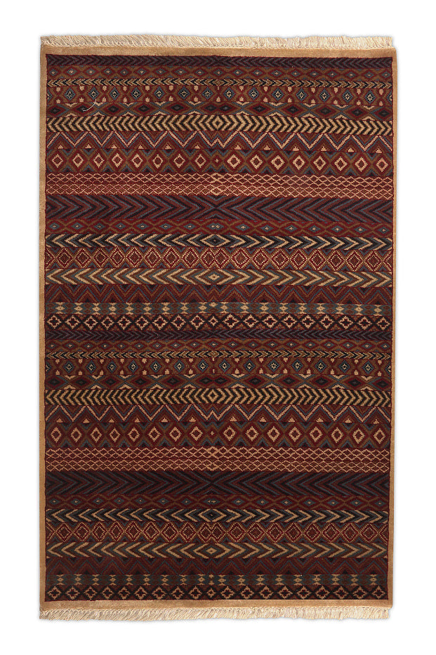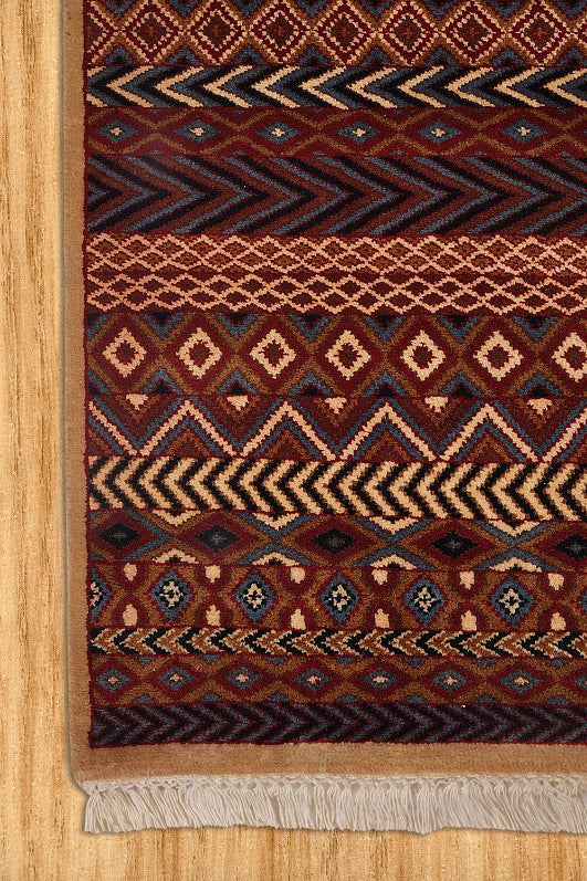 Embrace a fusion of modern design and tribal heritage with the Tarkash rug, a bold piece from our Odyssey Collection that showcases skilled craftsmanship. This 4 x 6 ft hand-knotted wool rug, featuring a medium pile, displays a pattern of zigzag and diamond motifs in rich maroon burgundy, warm beige sand, and hints of bronze tan. Its design reinterprets Central Asian tribal patterns, where geometric shapes symbolized protection, unity, and the natural world since the 18th century, originally woven for nomadic tents and ceremonies. These motifs, evolved into a contemporary aesthetic, reflect a cultural legacy of resilience, influencing global textile trends over time. The soft texture underfoot provides a cozy feel, perfect for living rooms or bedrooms seeking a striking accent.