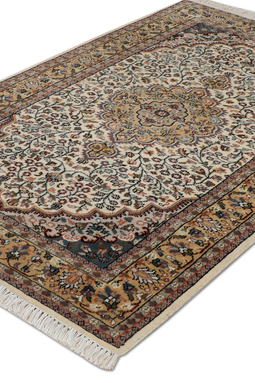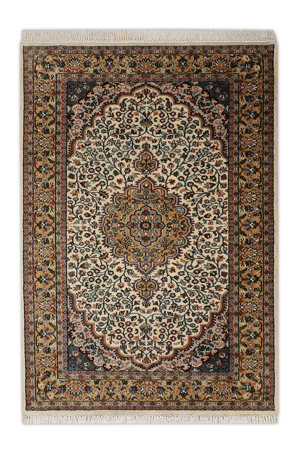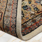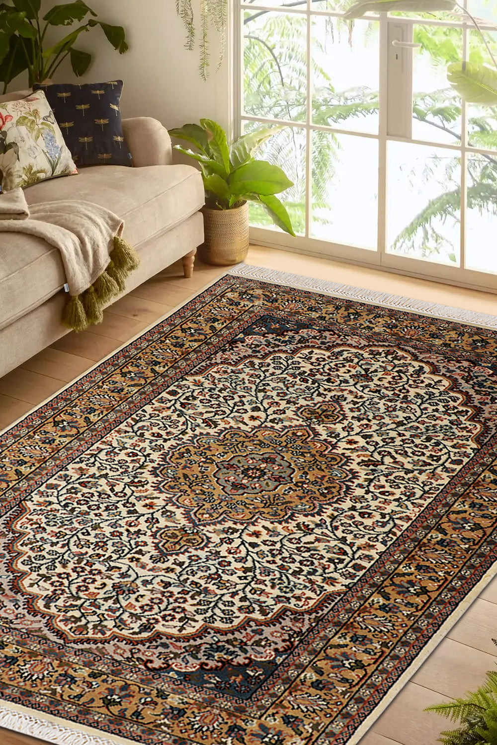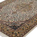 Bring warmth to your space with the Tazvi rug, a stunning handknotted piece from our Virasat Collection that blends traditional artistry with modern elegance. This 4 x 6 ft wool rug, featuring a medium pile with a mild soft texture, showcases intricate floral and medallion motifs in creamy beige mist, rich amber glow, and hints of warm taupe. Its design reflects Persian weaving traditions, where such patterns symbolized abundance and spiritual harmony since ancient times, often crafted into Oriental rugs to represent garden paradises. These motifs, embodying cultural narratives of beauty and eternity, spread through trade routes, influencing textile arts with their enduring sophistication. The plush texture makes it perfect for living rooms or bedrooms seeking a timeless accent.