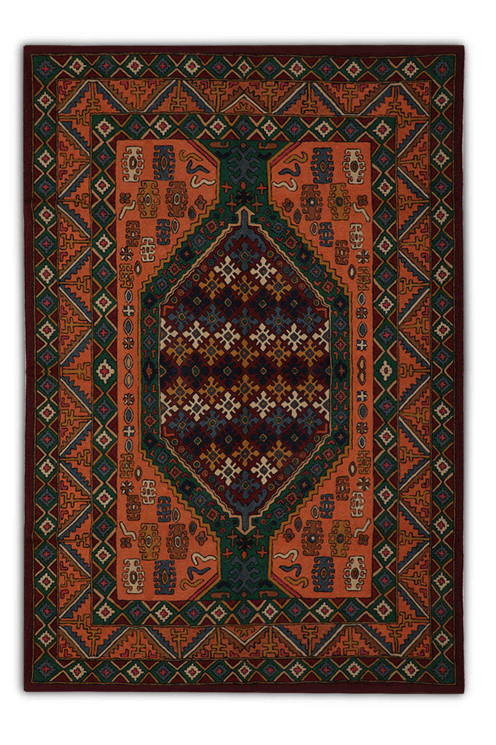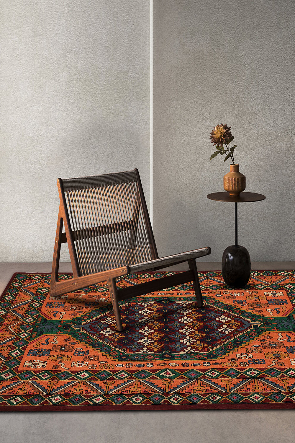 Transform your home with this rectangular rug, where every stitch weaves a story of historical depth and modern appeal. The geometric design, inspired by Central Asian tribal heritage, complements both minimalist and eclectic interiors with its intricate craftsmanship. Ideal for today’s homes, it blends durability with a vivid aesthetic, creating an energetic yet cozy focal point. Its warm tones elevate any room, infusing it with a sense of cultural richness and stylish sophistication. Discover a rug that connects ancient traditions with modern living spaces.