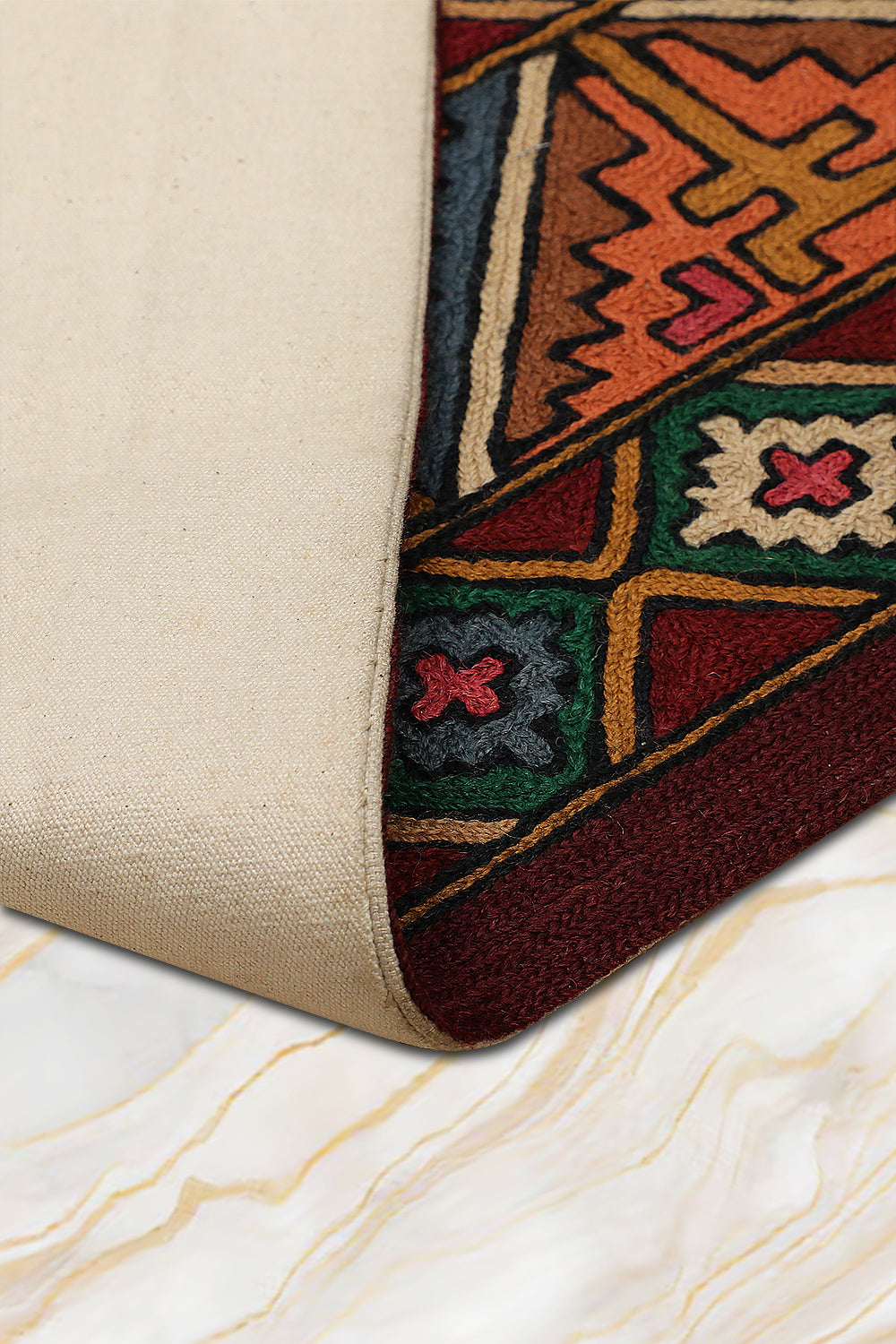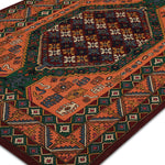 Add a bold splash to your space with the Tazvora rug, a captivating piece from our Odyssey Collection that combines modern design with cultural roots. This 4 x 6 ft wool rug, crafted with chain stitch embroidery and a low pile with a mild soft texture, features vibrant geometric patterns in warm amber blaze, deep forest teal, and hints of rich burgundy. Its design reflects Central Asian tribal traditions, where geometric motifs symbolized protection and communal harmony since ancient times, often embroidered into textiles to signify cultural identity. These patterns, embodying narratives of strength and unity, spread through trade routes, influencing modern styles with their striking symmetry. The lightweight texture makes it perfect for living rooms or bedrooms seeking a contemporary highlight.