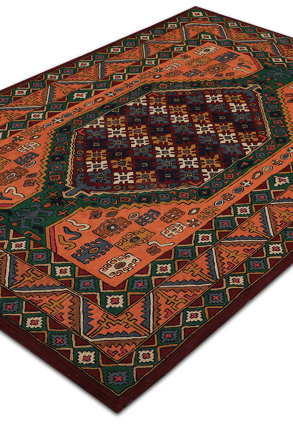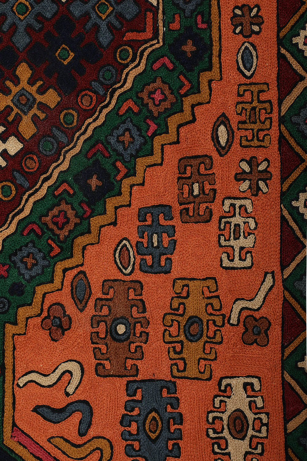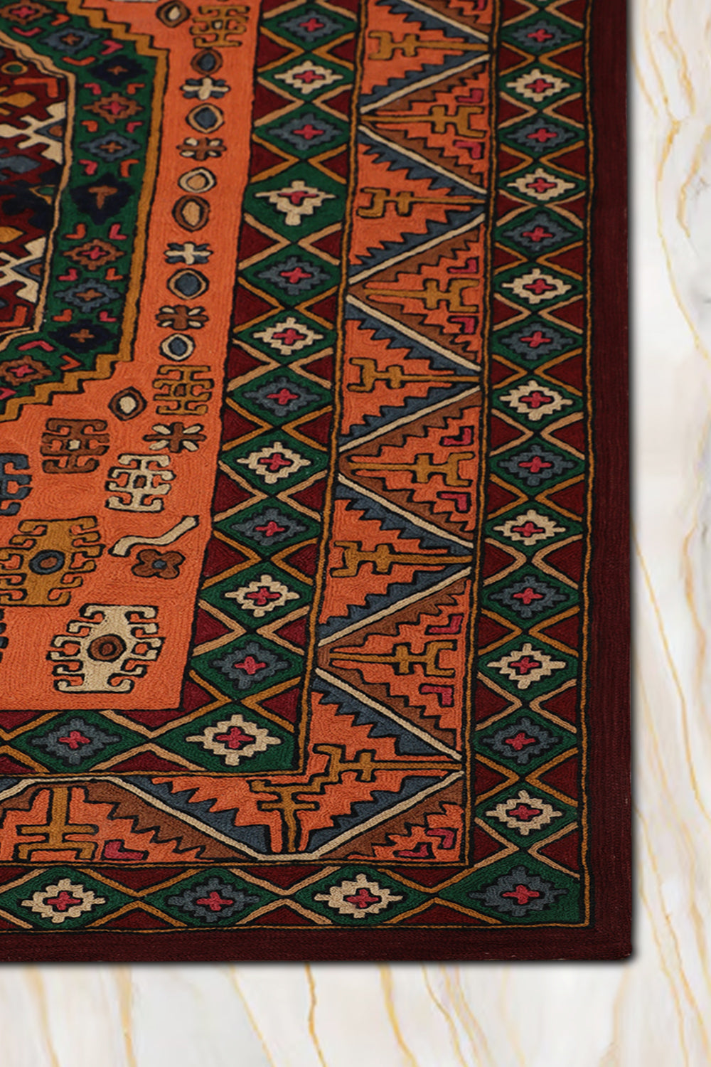 Tazvora - Chain Stitch Embroidery Wool Rug In Orange/Green