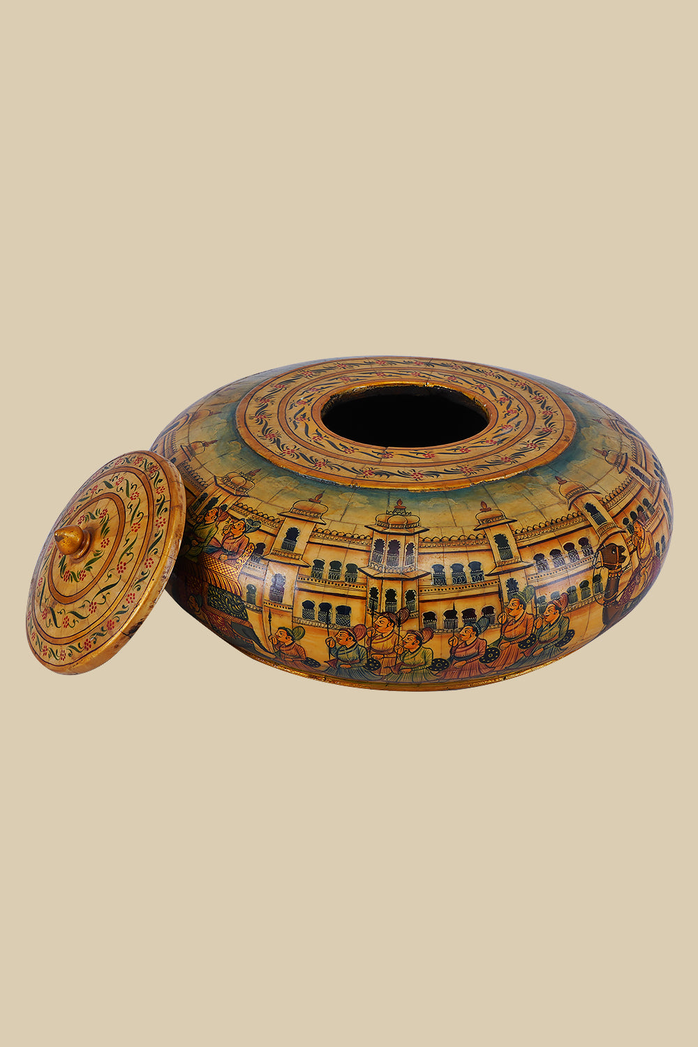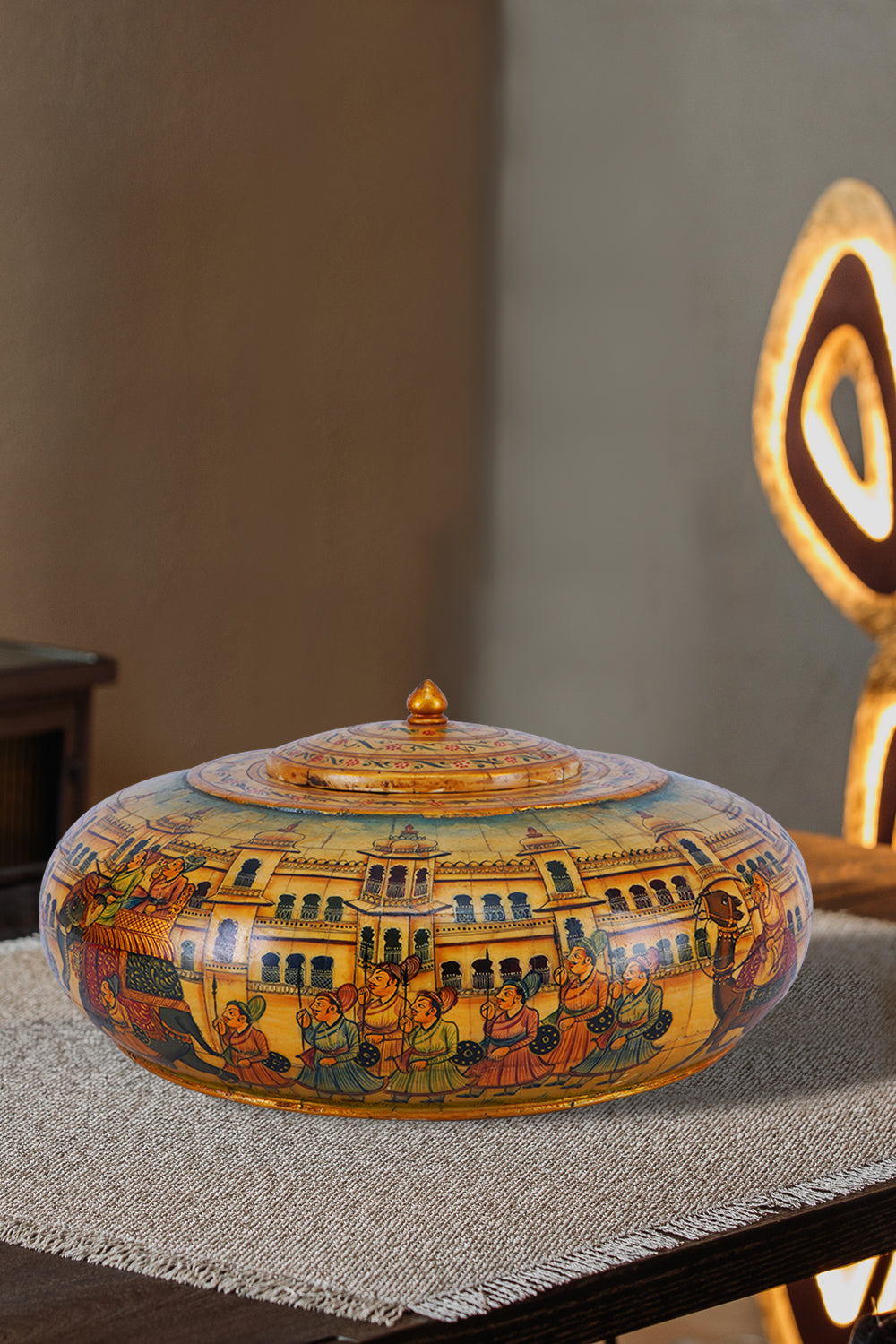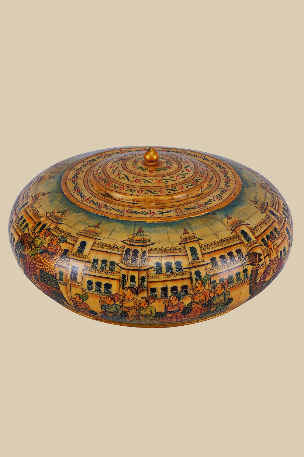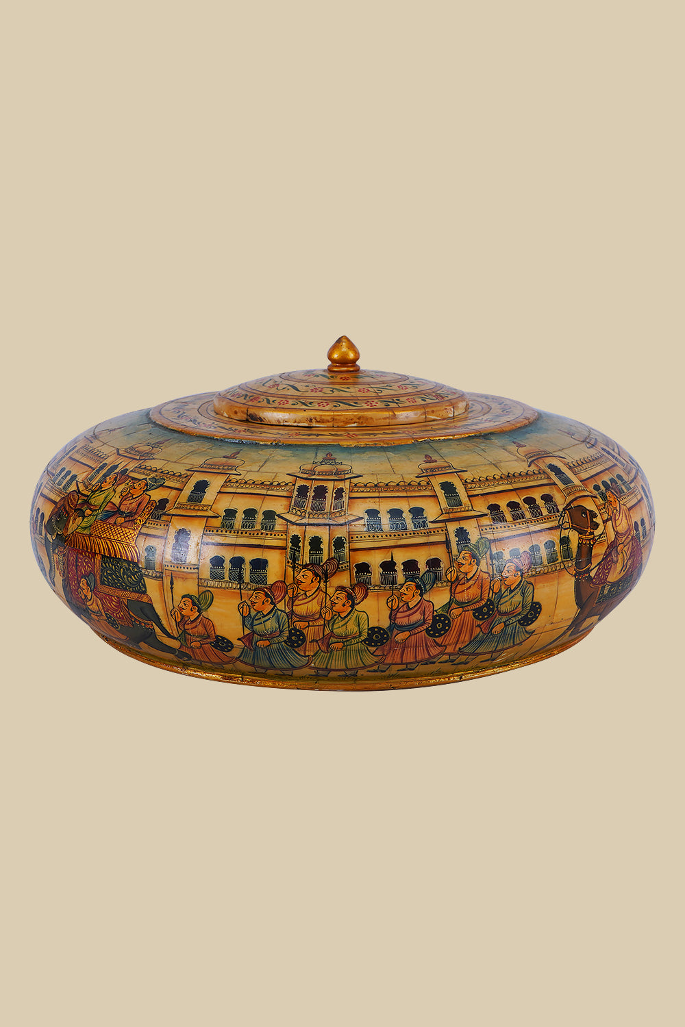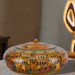 Crafted from exquisite camel bone, the vivacious colours and delicate strokes come together to create a visual masterpiece that is telling a story as you go around the box. The surface of the box is beautified with intricate scenes reminiscent of the yesteryears, evoking the splendor of royal courts of India’s cultural heritage.