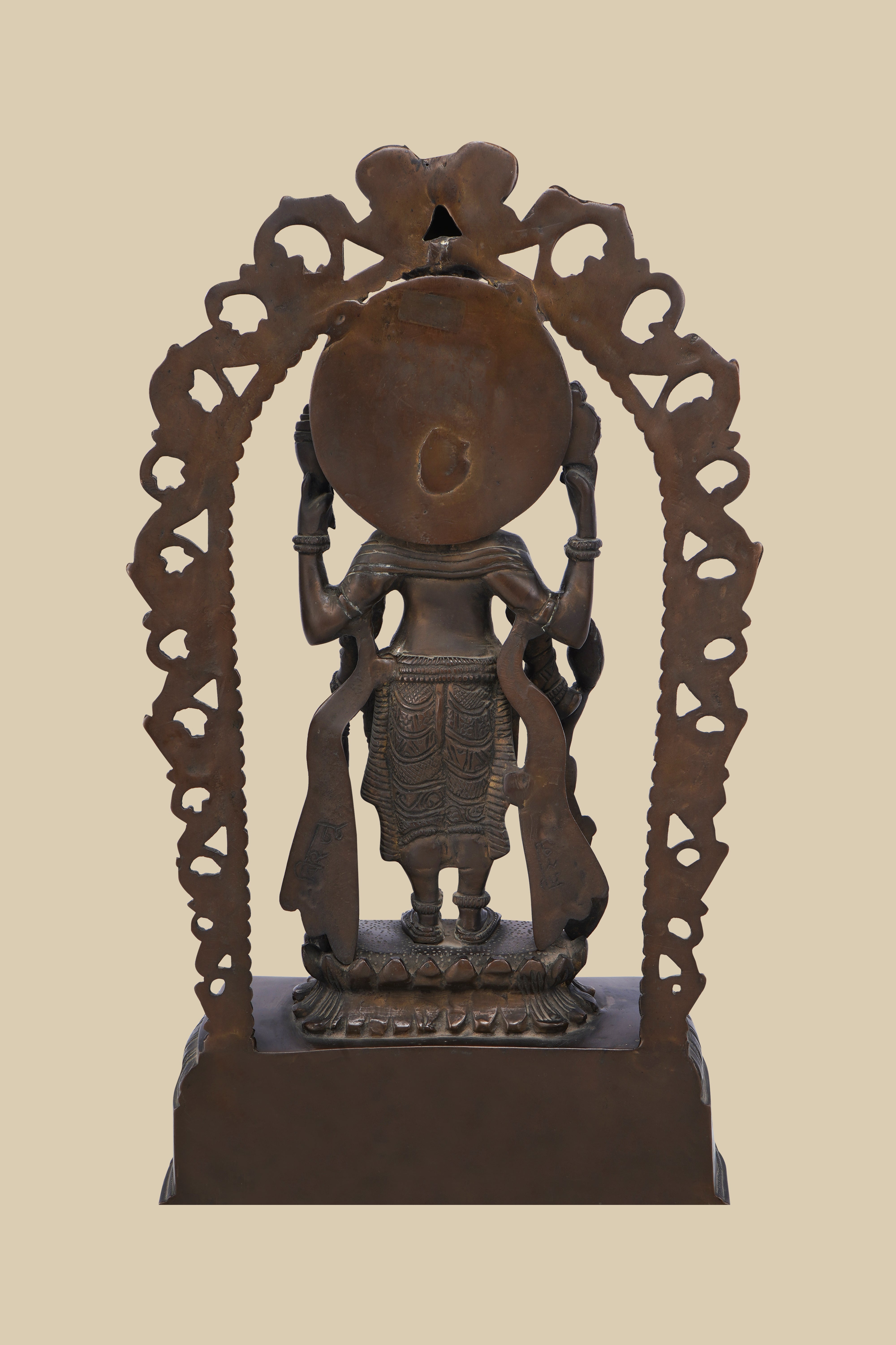 Back view of a dark brass statue of Lord Vishnu, showing the intricate carving of the arch, the deity's form, and the details of his flowing garments and held attributes.