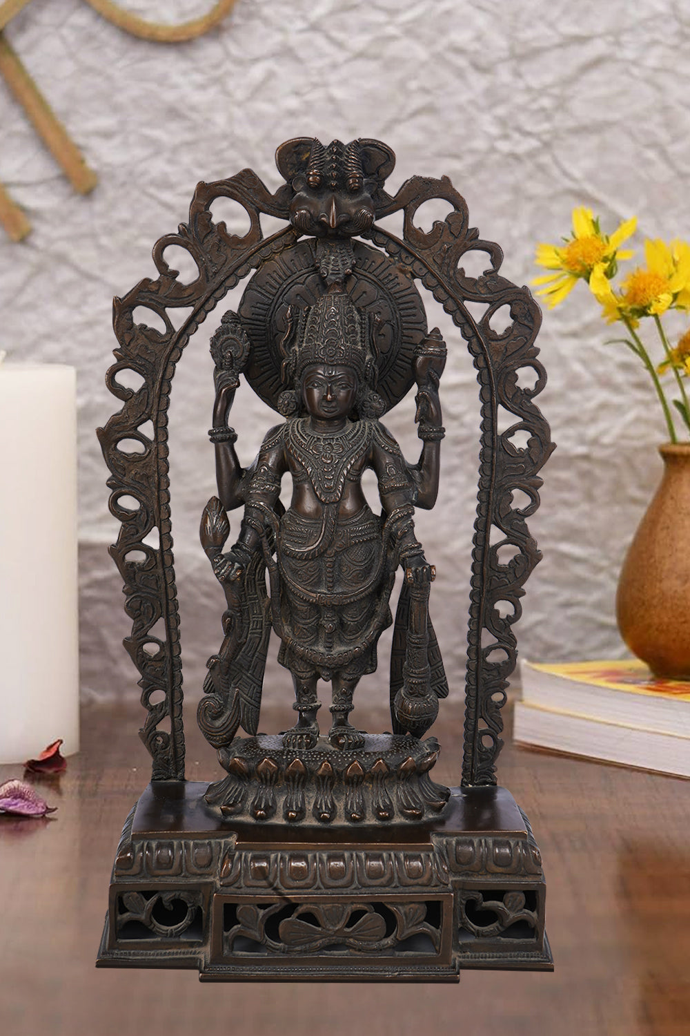 Dark brass statue of Lord Vishnu standing within an ornate arch, holding his traditional symbols: the conch shell, discus, lotus flower, and mace. The sculpture has a detailed finish and rests on a tiered pedestal.
