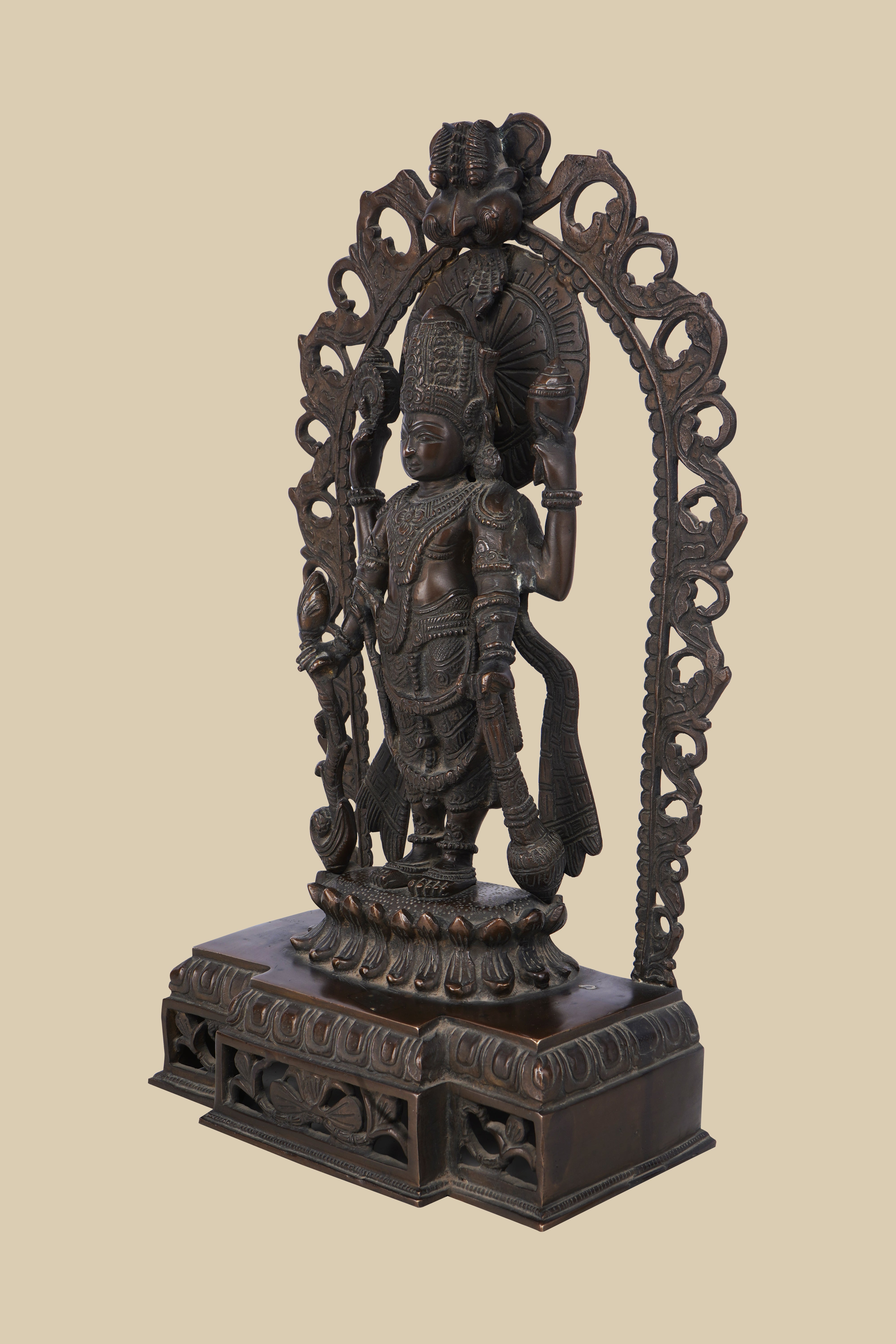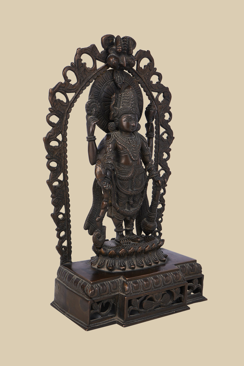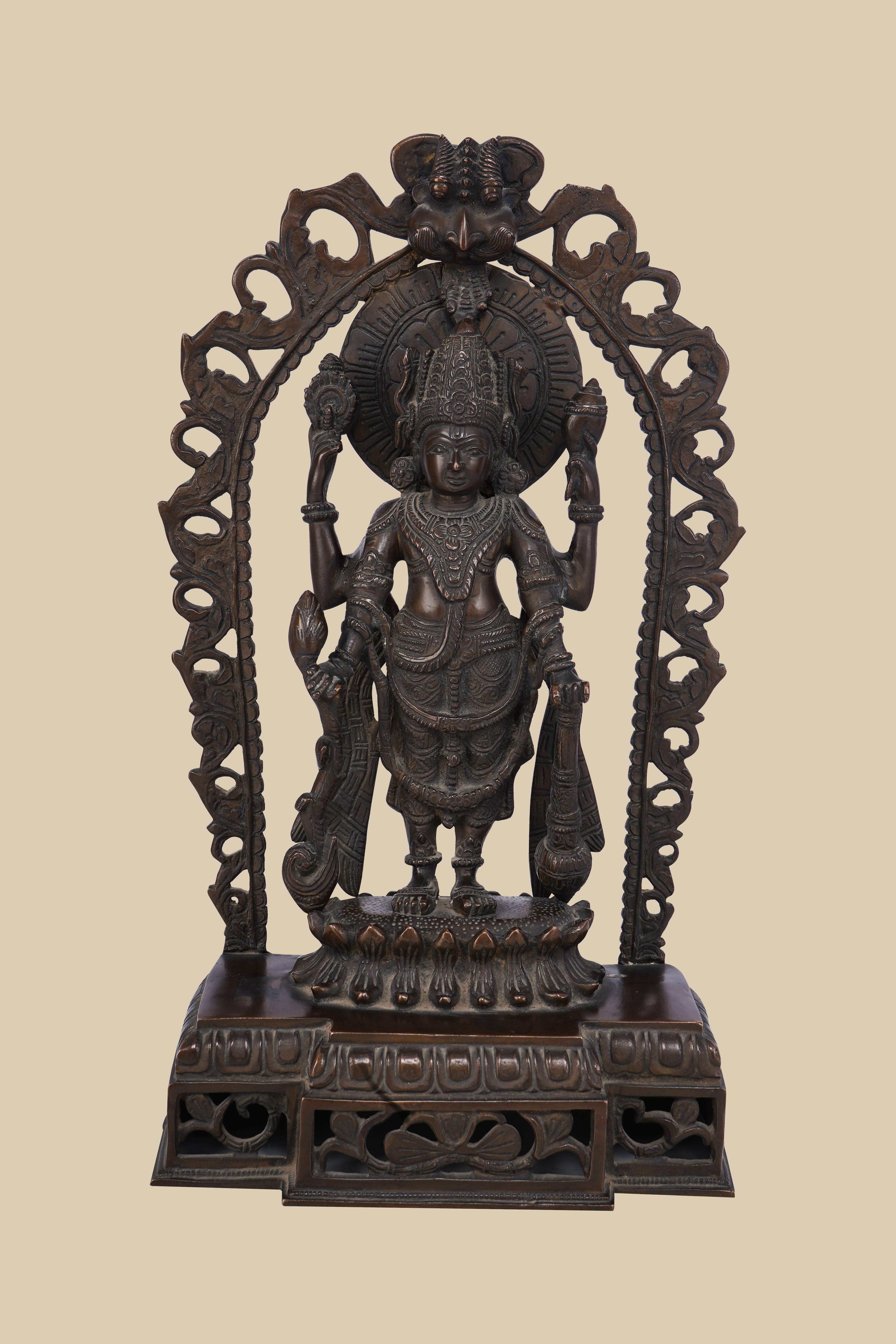 Dark brass sculpture of the Hindu god Lord Vishnu, depicted with four arms holding his sacred symbols within an elaborately carved arch and standing on a detailed pedestal.