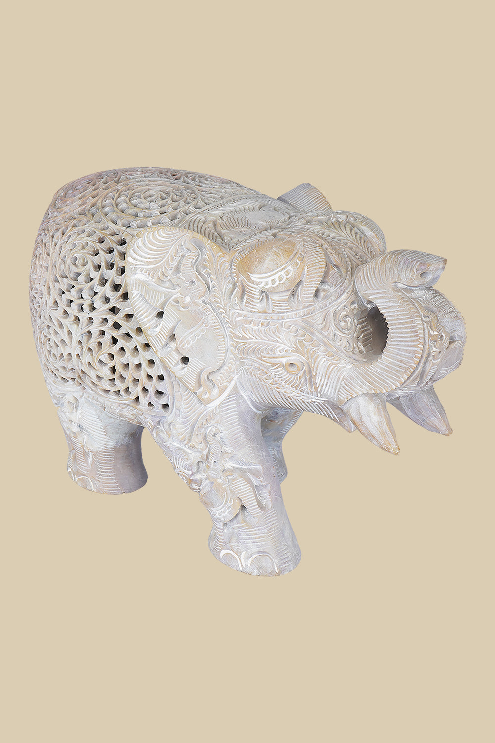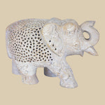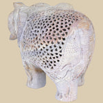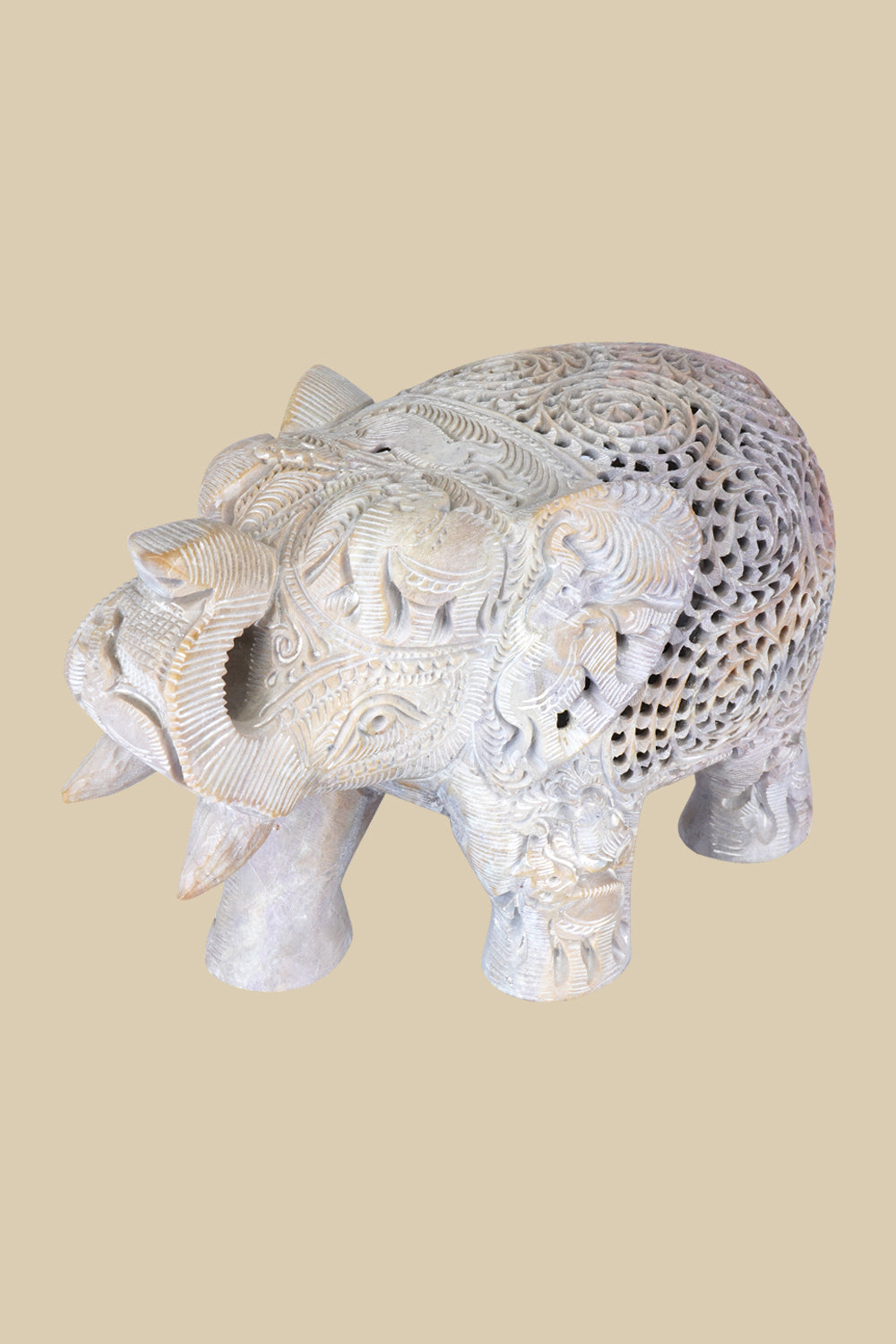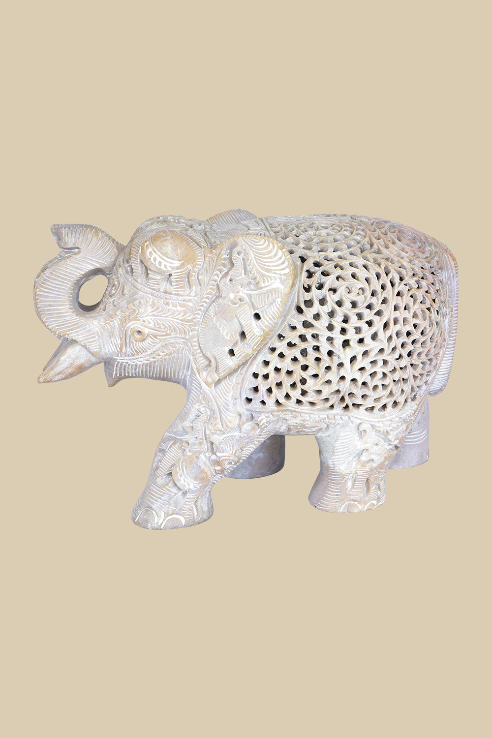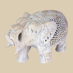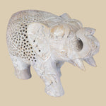 Expertly carved from solid stone, this figurine showcases a female elephant’s magnificent form, with its raised trunk, tusks, and strong yet elegant posture. The undercut carving technique reveals intricate details that hold another baby elephant inside, highlighting the gentle gift of motherhood and the strength of this beautiful creature. The natural stone finish gives the figurine an earthy quality, while the carefully crafted features of the elephant emphasize its symbolic importance in both Indian culture and art. Elephants are often associated with wisdom, good fortune, and strength, making this piece a perfect addition to any space seeking positive energy and a connection to nature.