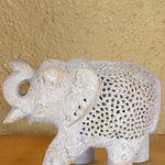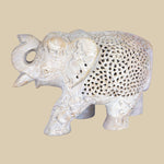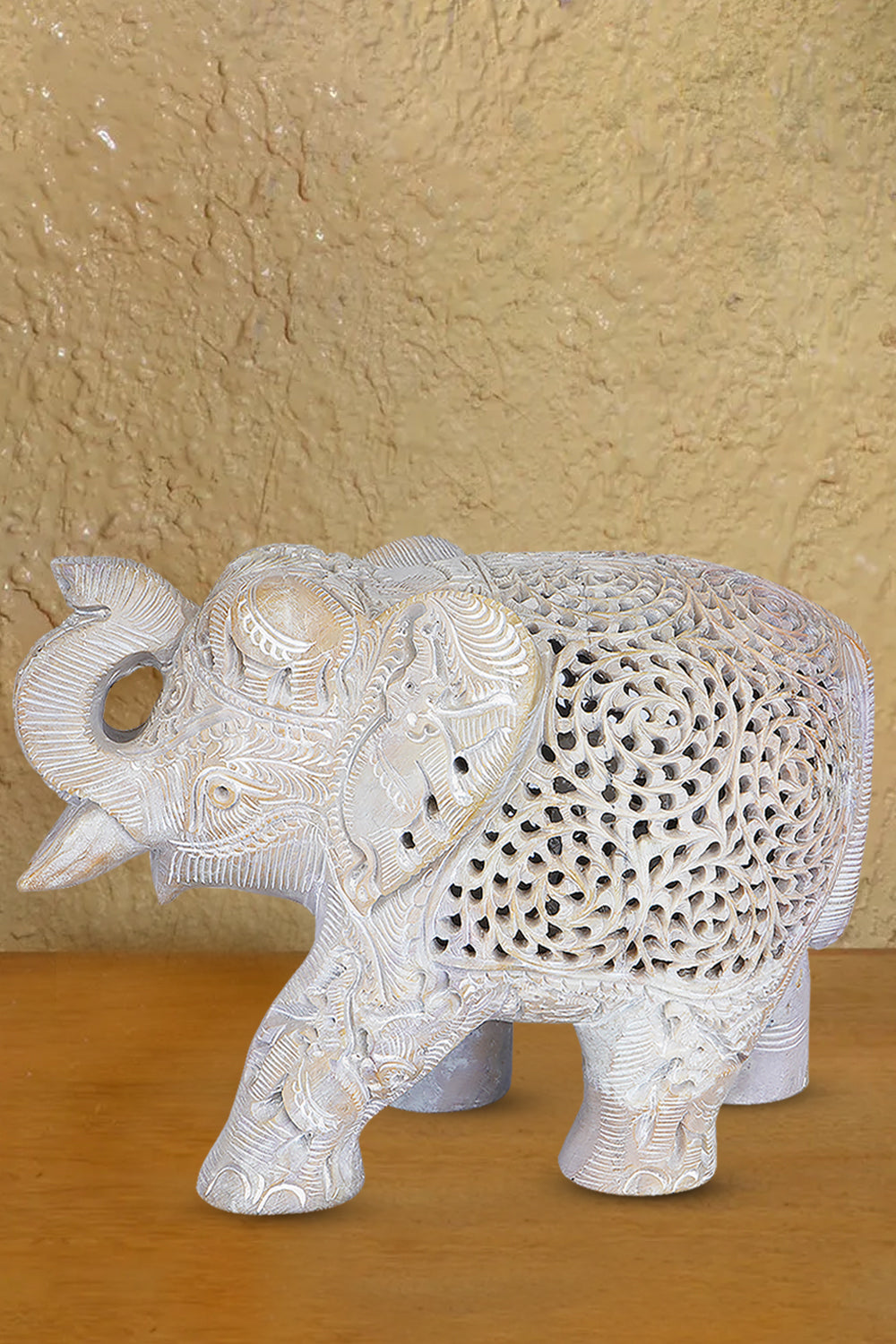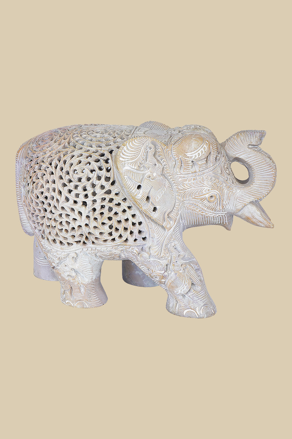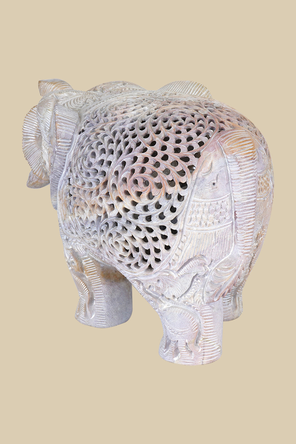 Expertly carved from solid stone, this figurine showcases a female elephant’s magnificent form, with its raised trunk, tusks, and strong yet elegant posture. The undercut carving technique reveals intricate details that hold another baby elephant inside, highlighting the gentle gift of motherhood and the strength of this beautiful creature. The natural stone finish gives the figurine an earthy quality, while the carefully crafted features of the elephant emphasize its symbolic importance in both Indian culture and art. Elephants are often associated with wisdom, good fortune, and strength, making this piece a perfect addition to any space seeking positive energy and a connection to nature.