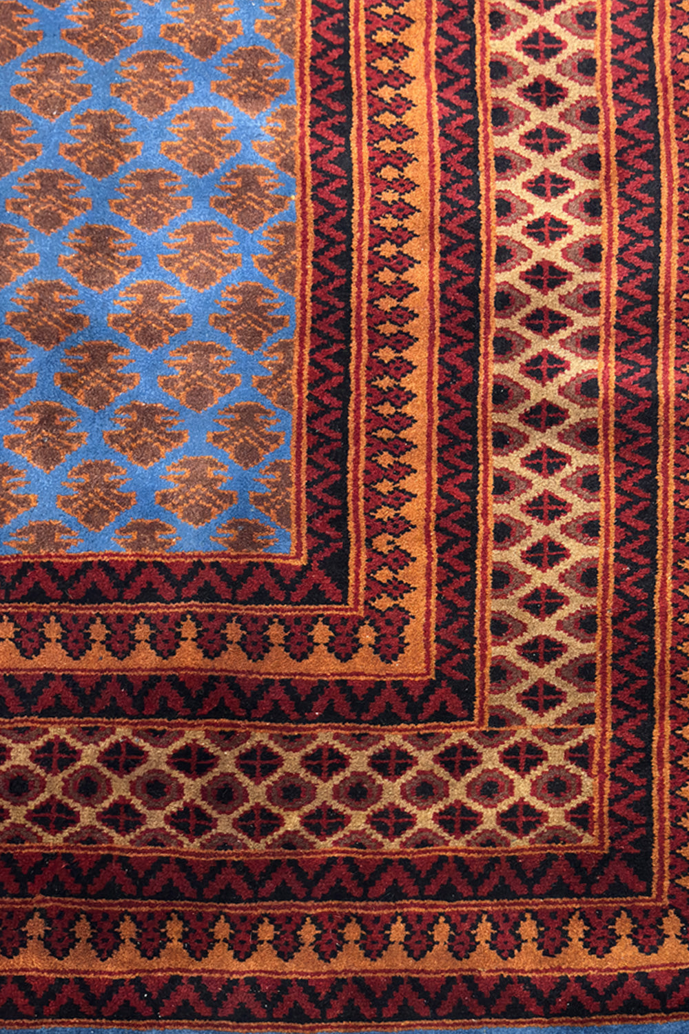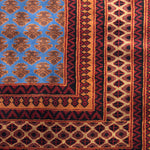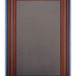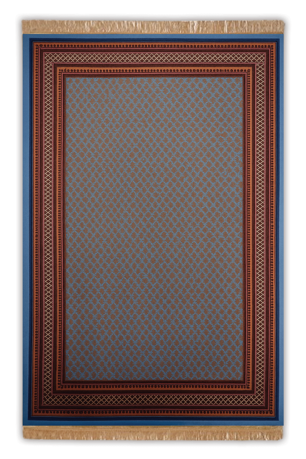 The Veylan rug is a dialogue between cool refinement and earthy warmth. Its cobalt blue field is adorned with delicate lattice motifs, framed by bold rust brown borders that give the design depth and balance. Each hand knotted thread reflects the mastery of artisans whose craft transforms geometry into timeless artistry.