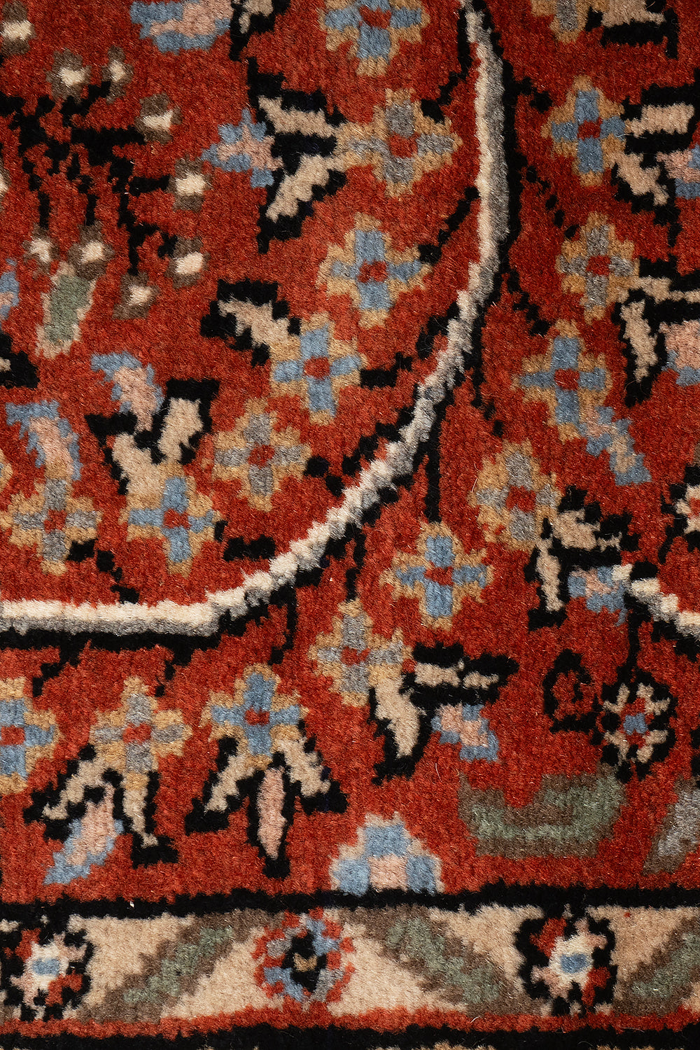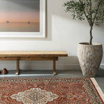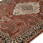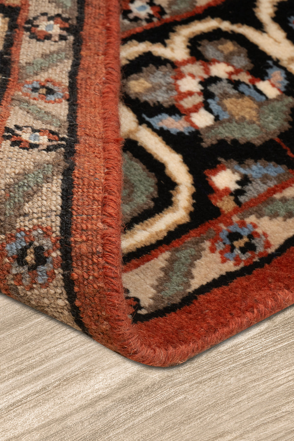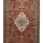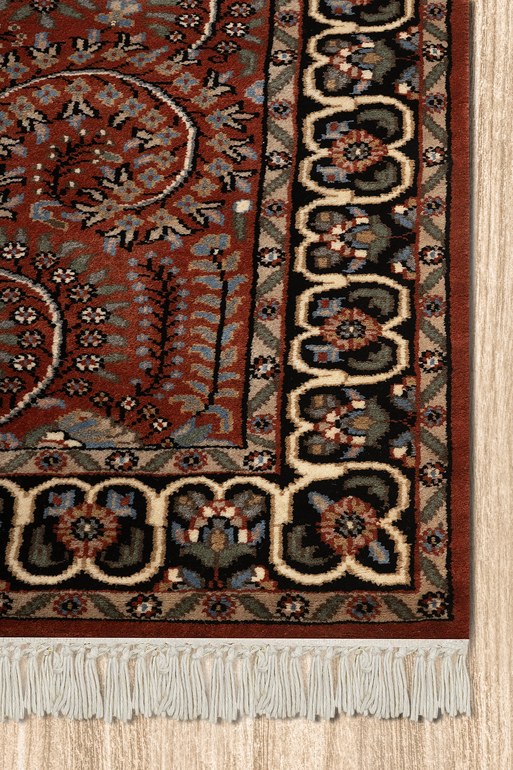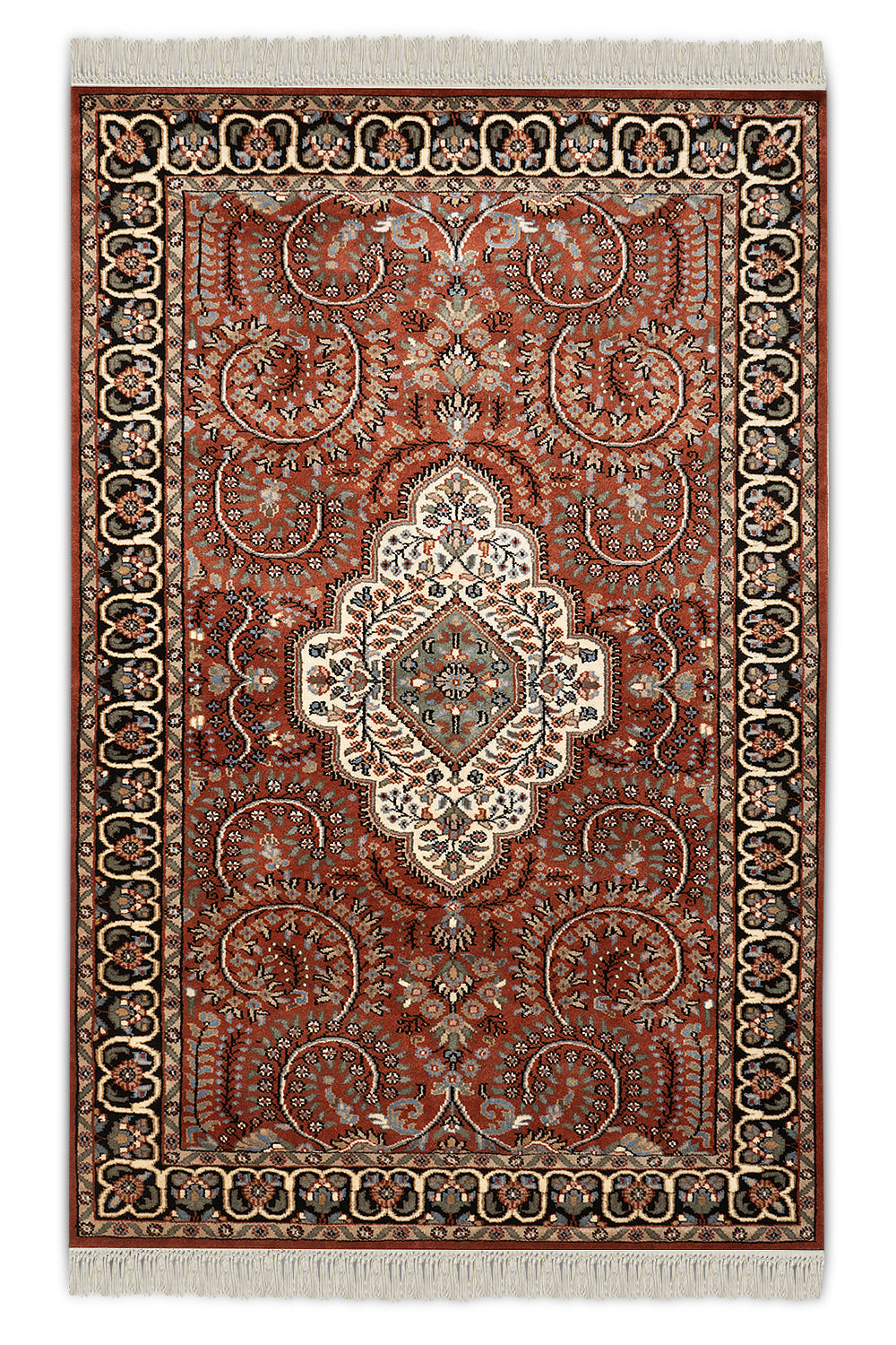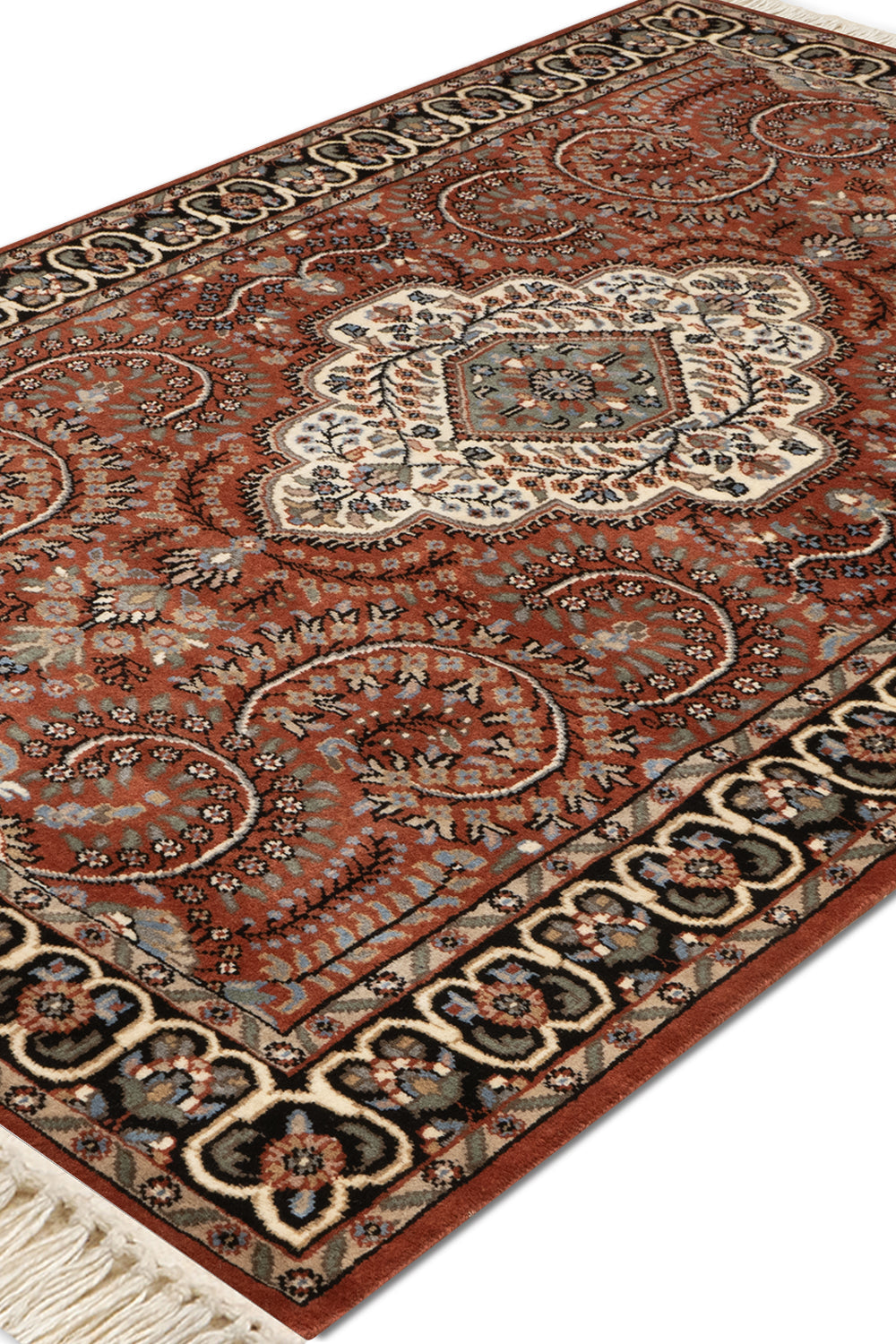 Behold the Viraat, a rug that lives up to the meaning of its name (meaning majestic), a masterpiece from our Virasat collection. This hand-knotted carpet in a captivating Russet hue. It's a testament to centuries of artistry and a portal to India's rich heritage. Nain Kashan carpets are renowned for their intricate floral motifs, delicate patterns, and rich colour palettes. This particular piece captures the essence of this traditional style, with its mesmerising central medallion and intricate border designs, and beautiful curvature designs with nature’s elements that bring out the ivory white medallion in the centre. The soft, woollen threads invite you to sink your feet into a world of comfort and luxury, making it a perfect carpet for living areas.