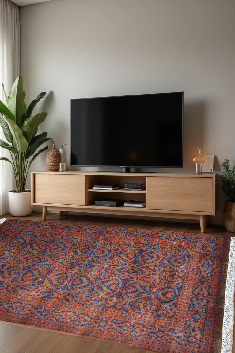 In living rooms or bedrooms, Yamuna serves as a statement of refined taste. The rich brown tones bring warmth and stability, while the royal blue adds a touch of freshness and clarity. This combination makes it a versatile anchor piece for a variety of interior styles.