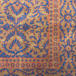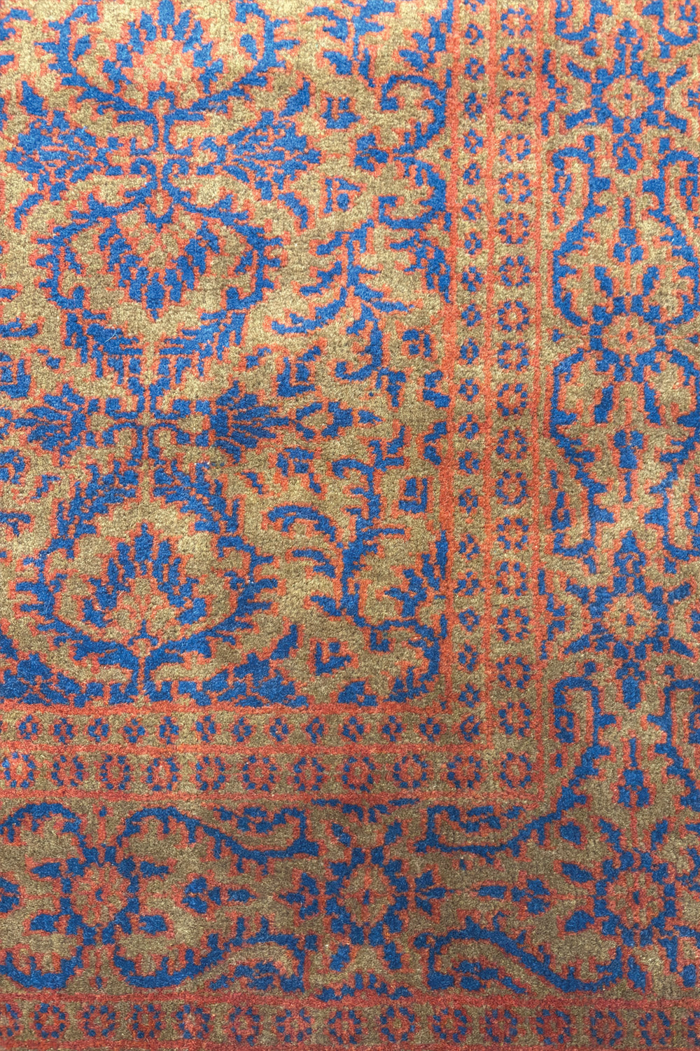 The Yamuna rug carries a flowing rhythm reminiscent of nature’s movement, with delicate blue motifs unfurling across a rust-brown field. The craftsmanship highlights the precision of hand knotting, resulting in a piece that feels both refined and full of life. Its palette creates a grounded yet energising composition.