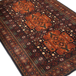 Discover the enduring charm of tribal artistry with the Yulduz rug, a captivating piece from our Junoon Collection that celebrates ancient weaving traditions. This 4 x 6 ft hand-knotted wool rug, featuring a medium pile, showcases a pattern of diamond and star motifs in deep navy indigo, burnt rust orange, and hints of coppery bronze. Its design draws from Central Asian tribal rugs, particularly the Turkmen patterns of the 18th century, where stars symbolized celestial guidance, protection, and tribal lineage. These rugs, woven by nomadic tribes for dowries and ceremonial use, reflected cultural values of community and resilience, influencing textile traditions along the Silk Road. The soft texture underfoot offers a cozy feel, ideal for living rooms or bedrooms seeking a touch of heritage.