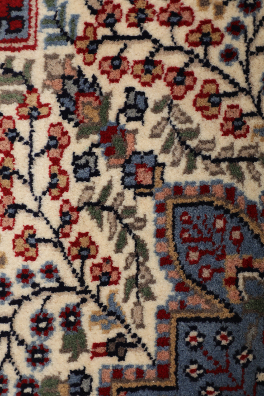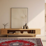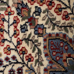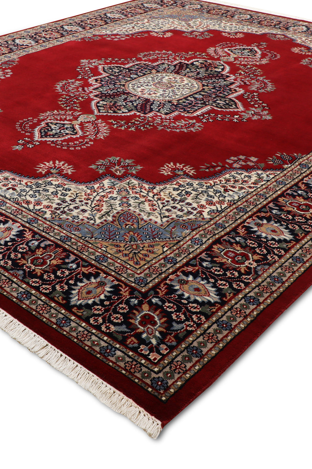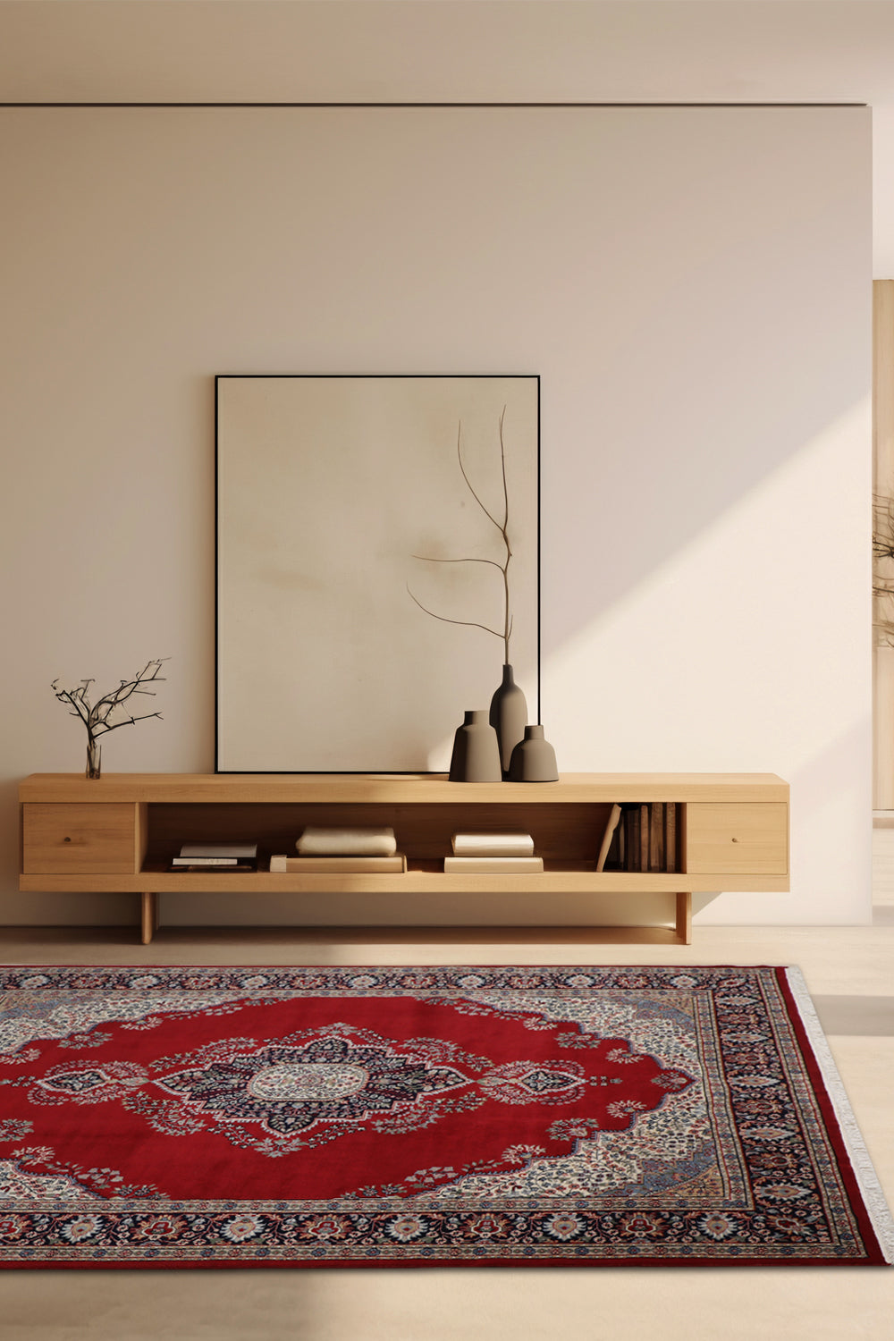 Transform your space with the Zara rug, a captivating hand-knotted piece from our Virasat Collection that embodies the richness of Oriental tradition. This 8 x 10 ft wool rug, featuring a medium pile with a mild soft texture, showcases a central medallion with floral motifs in deep crimson bloom, rich navy dusk, and hints of soft ivory. Its design draws from Persian heritage, where medallions and floral patterns symbolized harmony and prosperity since the 16th century, often crafted into rugs for royal and ceremonial purposes. These motifs, reflecting cultural narratives of abundance and elegance, spread across trade routes, blending historical artistry with enduring beauty. The gentle texture makes it ideal for living rooms or dining rooms seeking a luxurious focal point.
