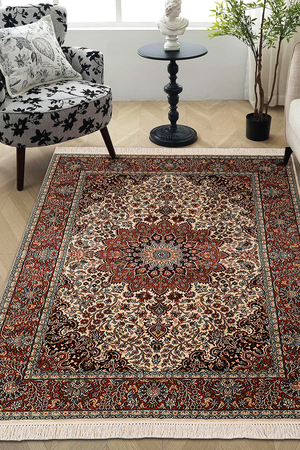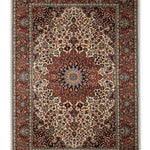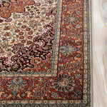 Enrich your space with the Zhaleh rug, a delicately hand-knotted piece from our Viraasat Collection that celebrates the artistry of Oriental traditions. This 4 x 6 ft silk rug, featuring a low pile with a soft texture, showcases a classic Tree of Life motif with floral and vine accents in warm rust terracotta, creamy ivory whisper, and hints of burnt sienna. Its design draws from Persian and Central Asian traditions, where the Tree of Life symbolized eternal life and renewal since the 16th century, often woven into silk rugs for ceremonial and sacred spaces. These patterns, reflecting cultural narratives of growth and spirituality, influenced textile arts across trade routes, blending heritage with luxurious elegance. The silky texture makes it perfect for living rooms or bedrooms seeking a sophisticated accent.
