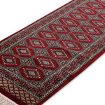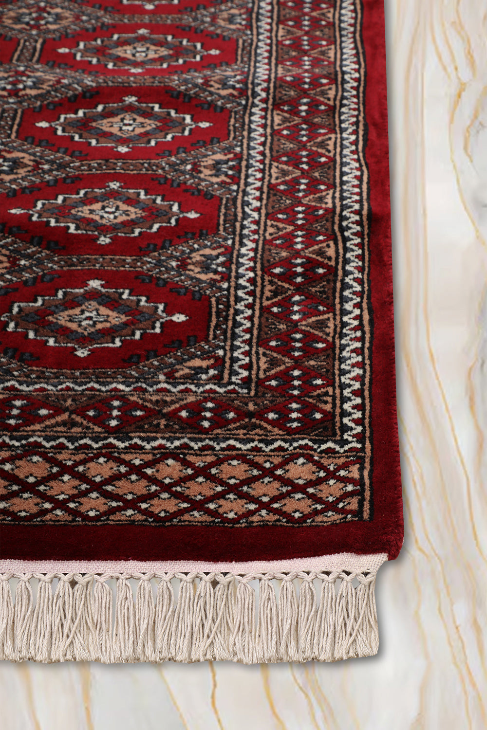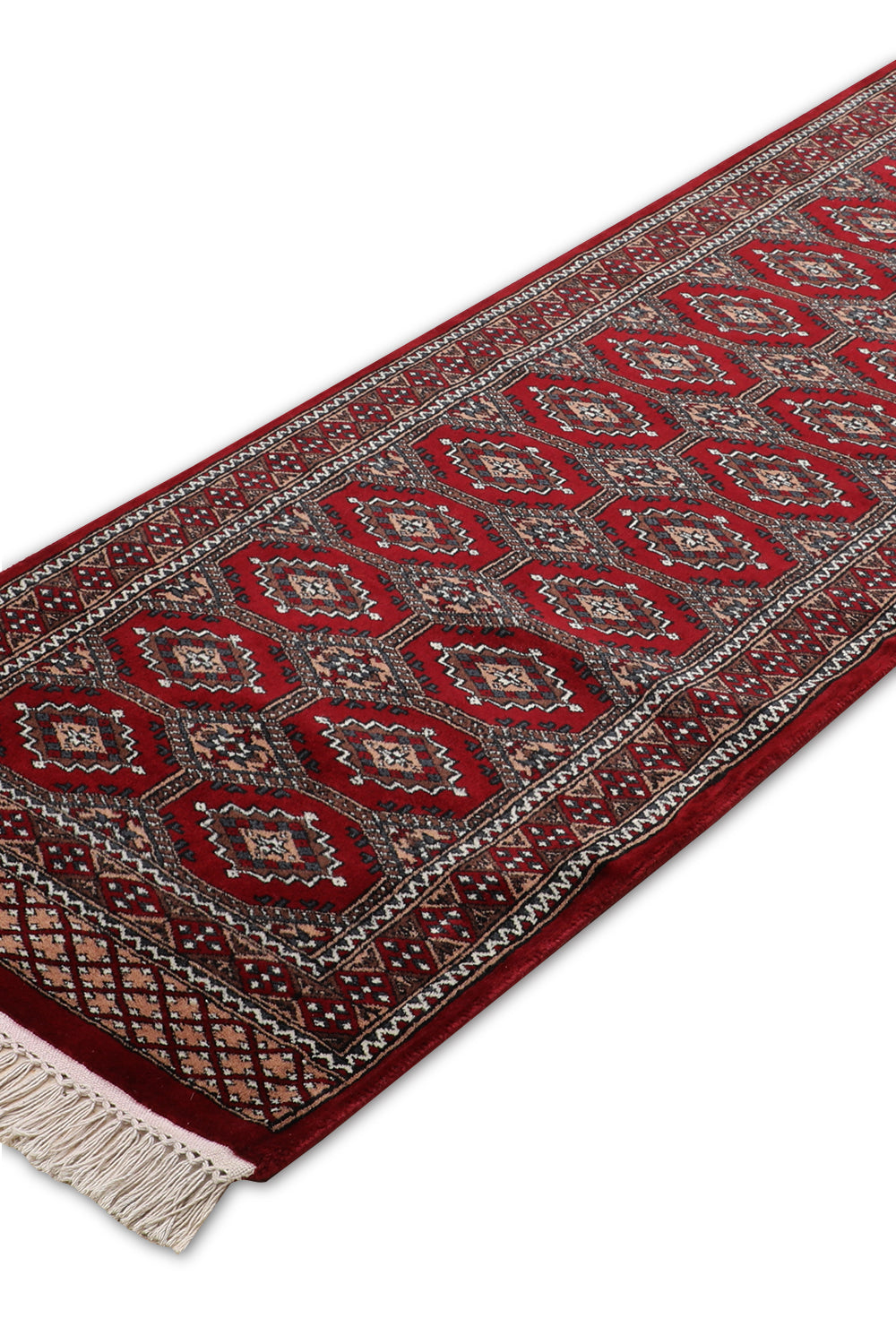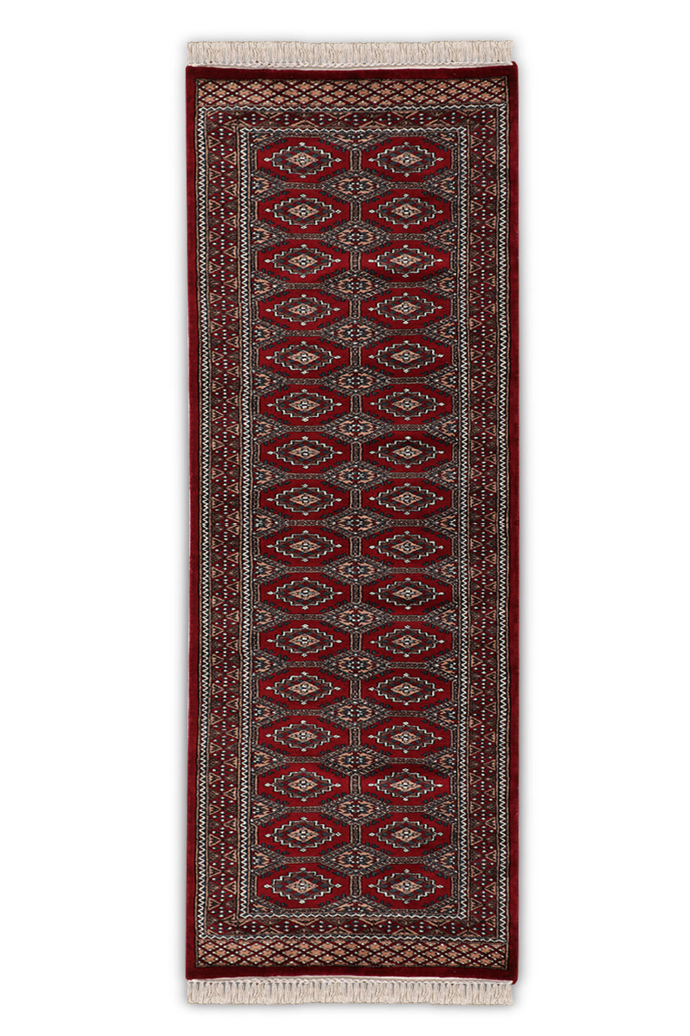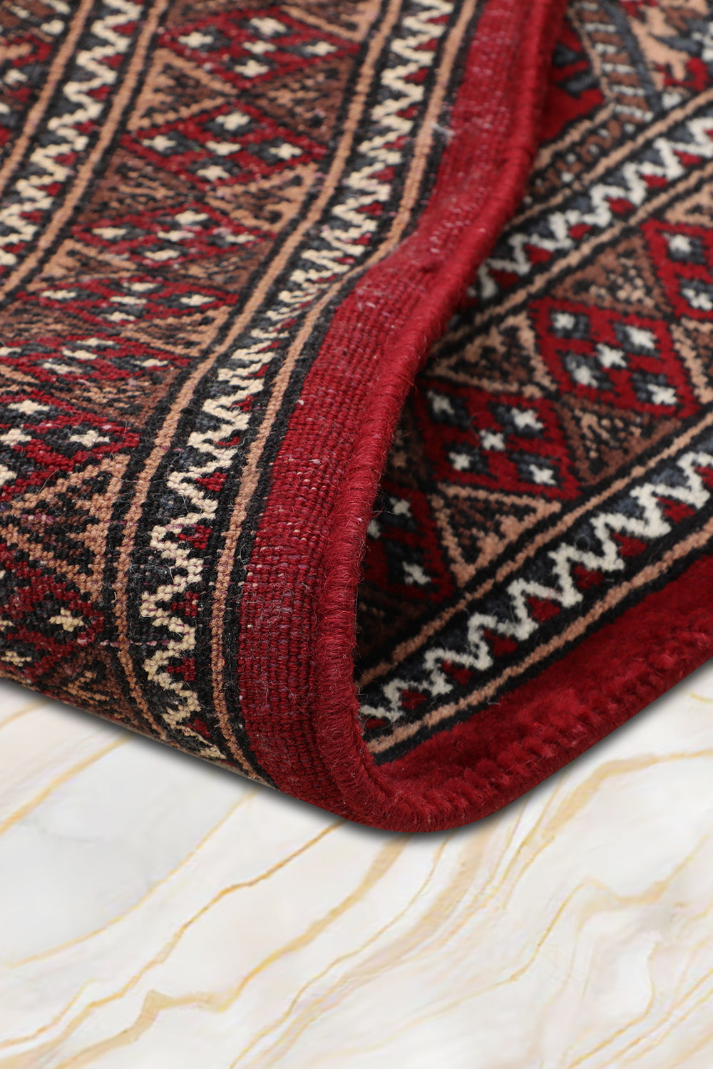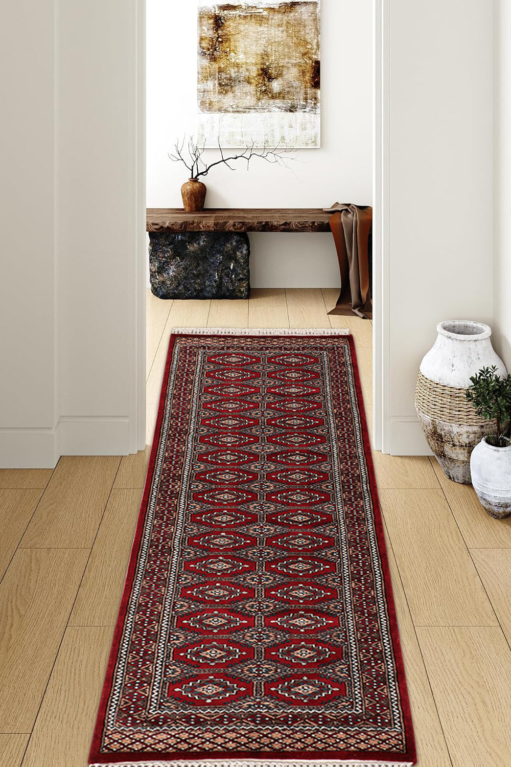 Add warmth to your hallway with the Ziba rug, a meticulously hand-knotted runner from our Junoon Collection that reflects tribal heritage. This 2.6 x 8 ft wool rug, featuring a medium pile with a mild soft texture, showcases repeating diamond and geometric motifs in deep maroon burgundy, rich chestnut brown, and hints of warm umber. Its design draws from Persian and Central Asian traditions, where geometric patterns symbolized protection and community since ancient times, often woven into tribal runners for nomadic and ceremonial purposes. These motifs, reflecting cultural narratives of strength and unity, influenced textile arts across trade routes, blending tradition with rustic elegance. The cozy texture makes it ideal for hallways seeking a sturdy accent.